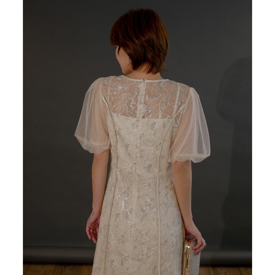 ウエストを引き締めつつ広がる絶妙なAラインシルエット&チュール素材のボリューム感あるパフスリーブが上品な印象です。