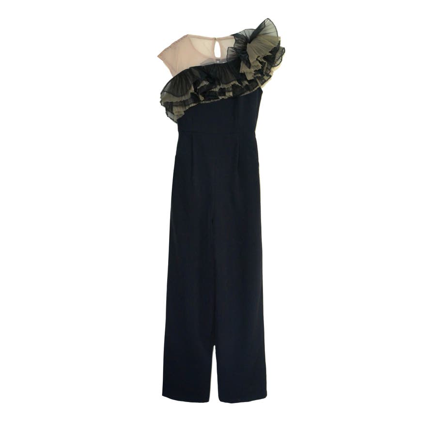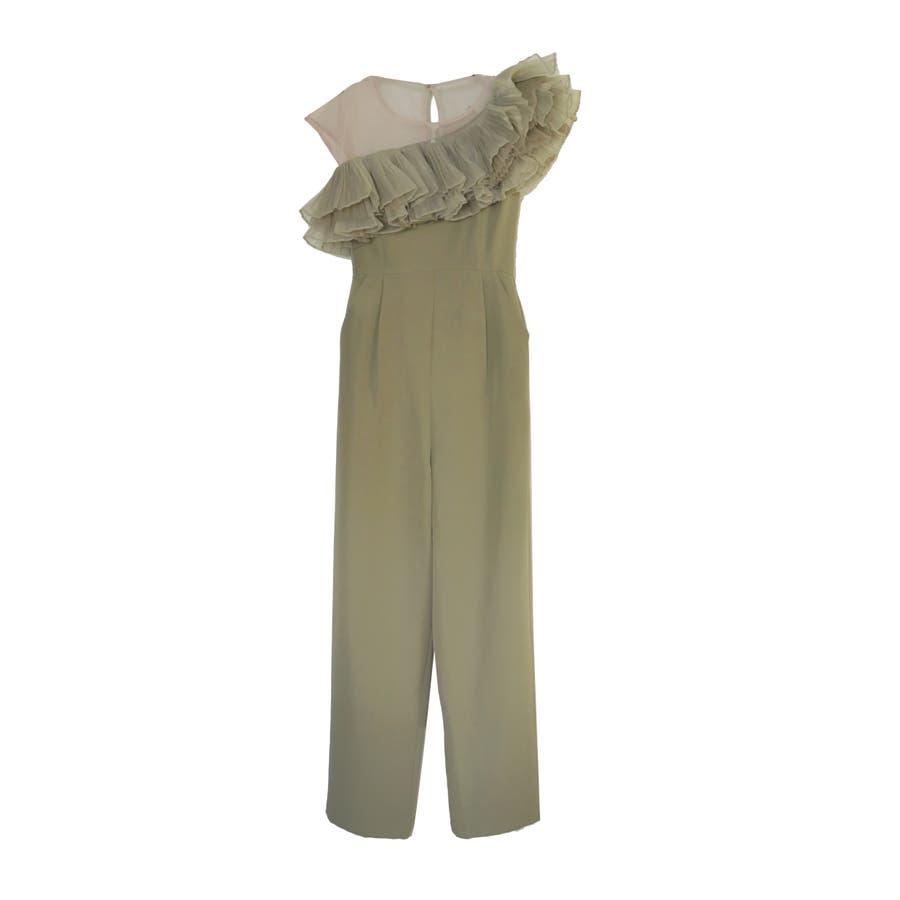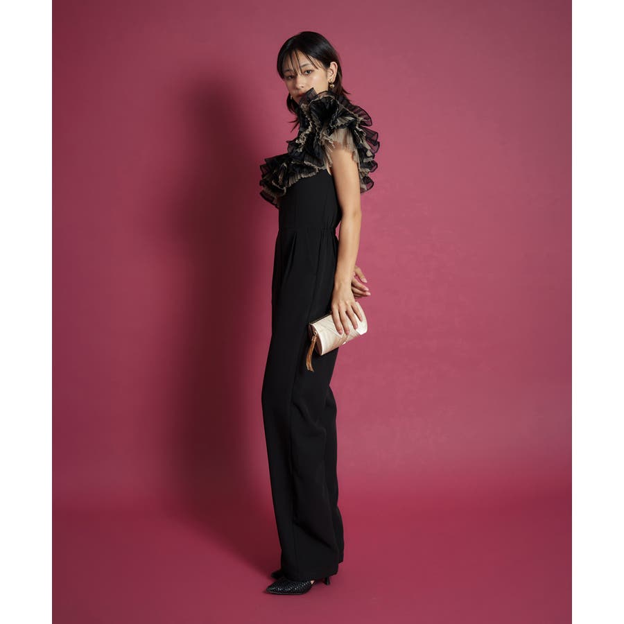 立体的なフリルデザインがおしゃれ心をくすぐるワンショルダー風パンツドレス。