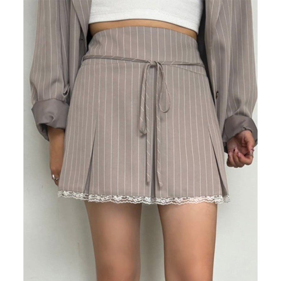 腰回りはスッキリシルエットで、裾にレースが付いた美脚効果の高いプリーツミニスカート