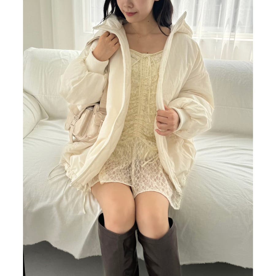 予想外に薄かった。綿が腕の部分にしかはいってない感じ。お尻までかくれる長さで色は白とオフの間くらい。真冬には向かないしセールでかなりお安く購入出来たから良かったけど最初のお値段では買わないかな。商品自体はちゃんとしたもので秋春と冬のはじめくらいにちょうどいいアウターです。