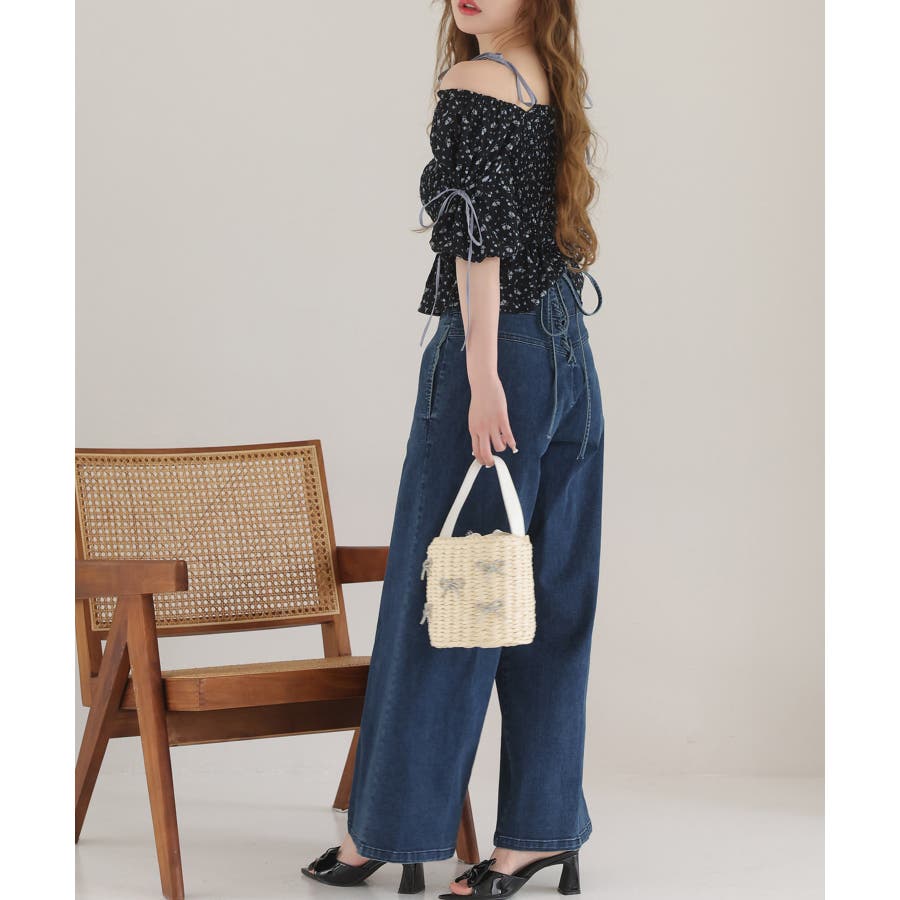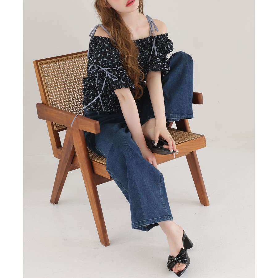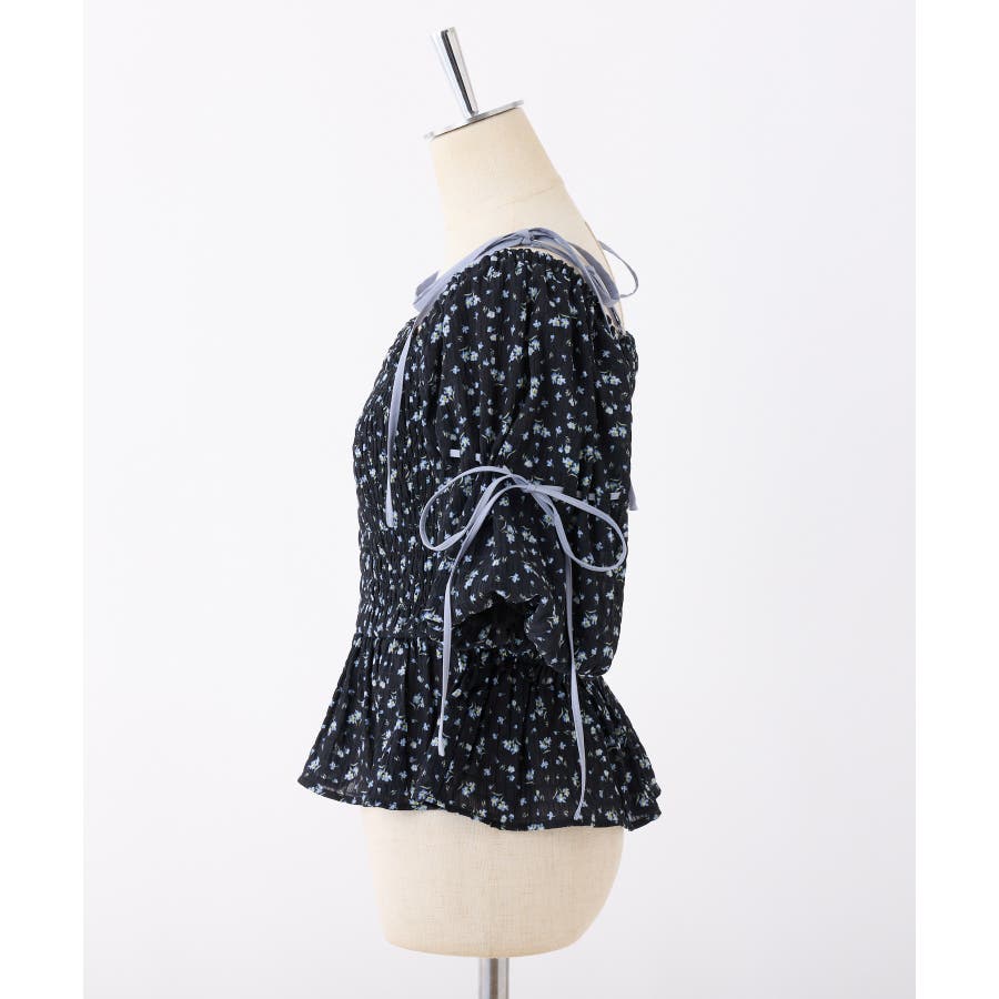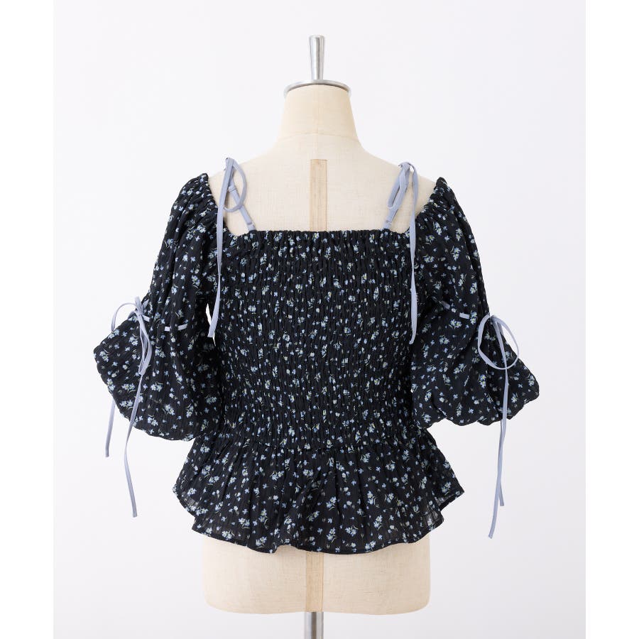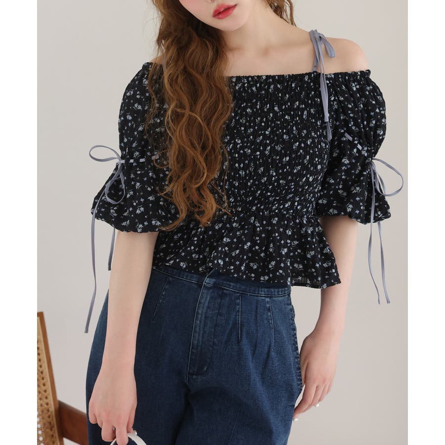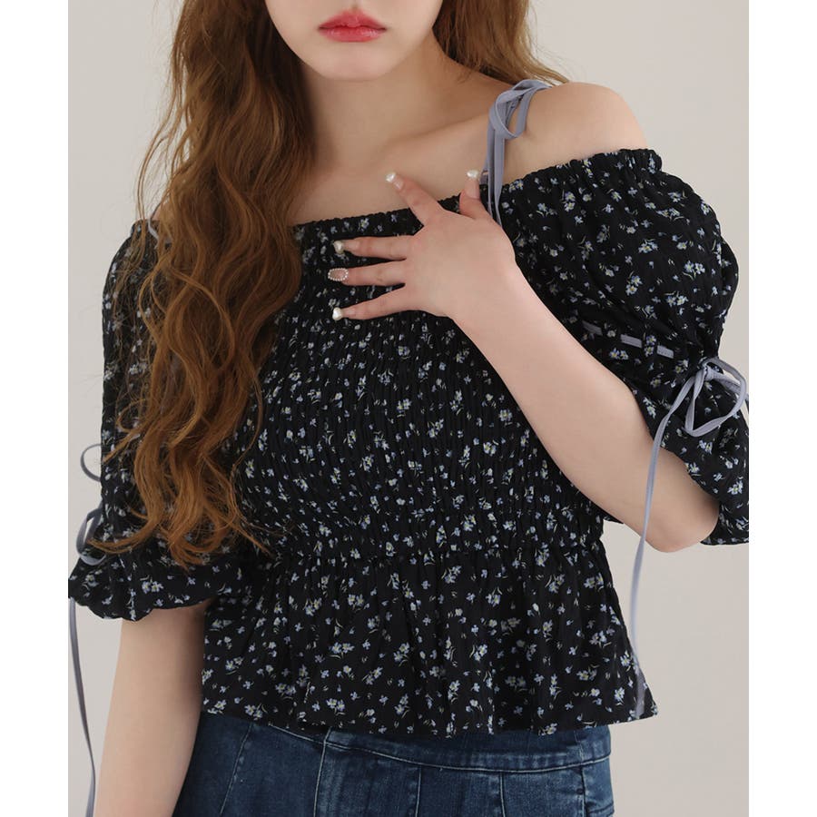 【one after another】花柄オフショルシャーリングリボンブラウス