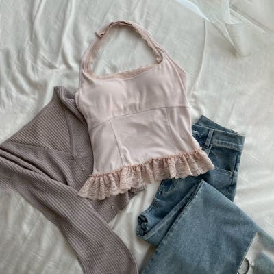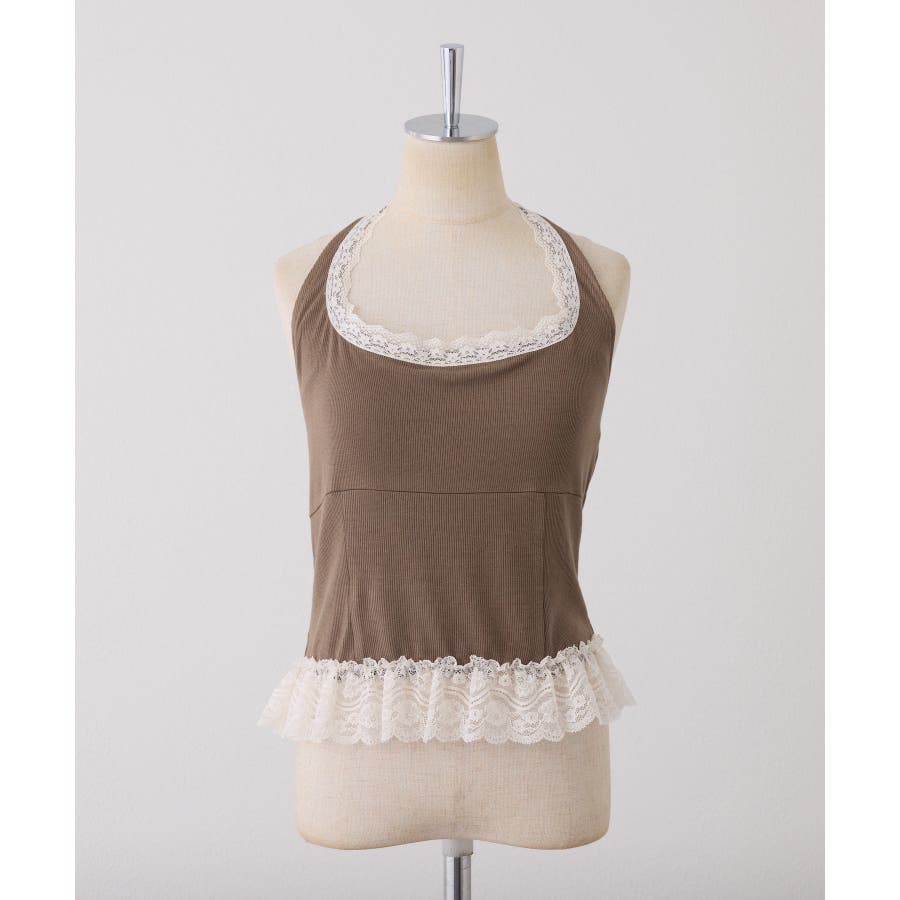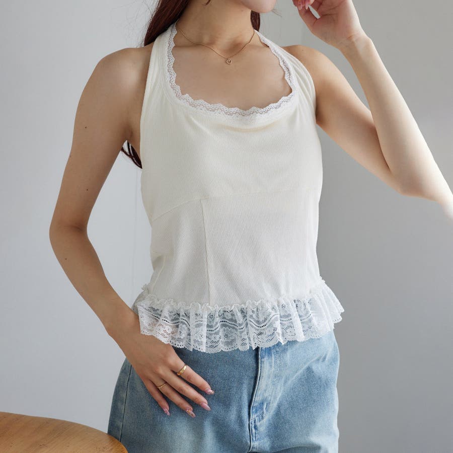 ノースリーブのカットソーに、繊細なレースが施されたホルターネックがあしらわれたトップス。