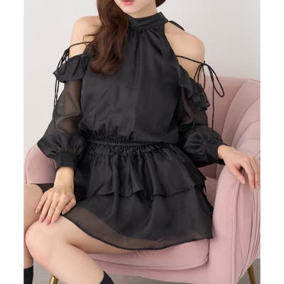 肩にあしらったフリルとリボンがポイントになり、
