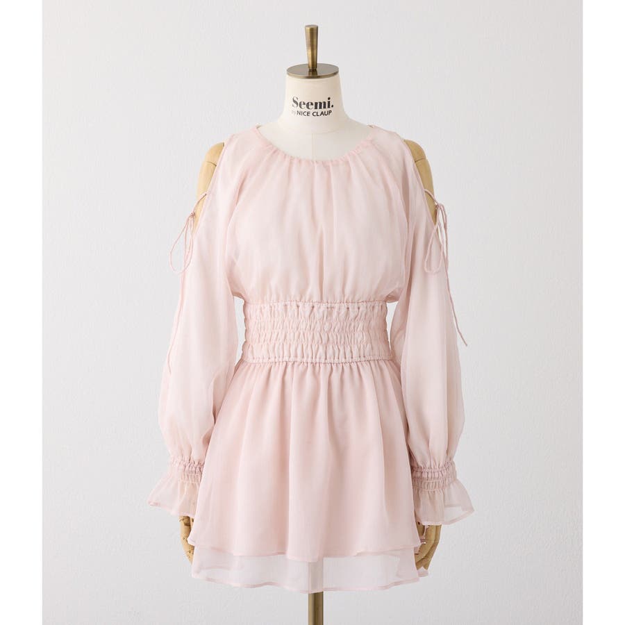 肩や腕まわりをすっきり見せつつ、ウエストのギャザーで女性らしいシルエットに仕上げました。