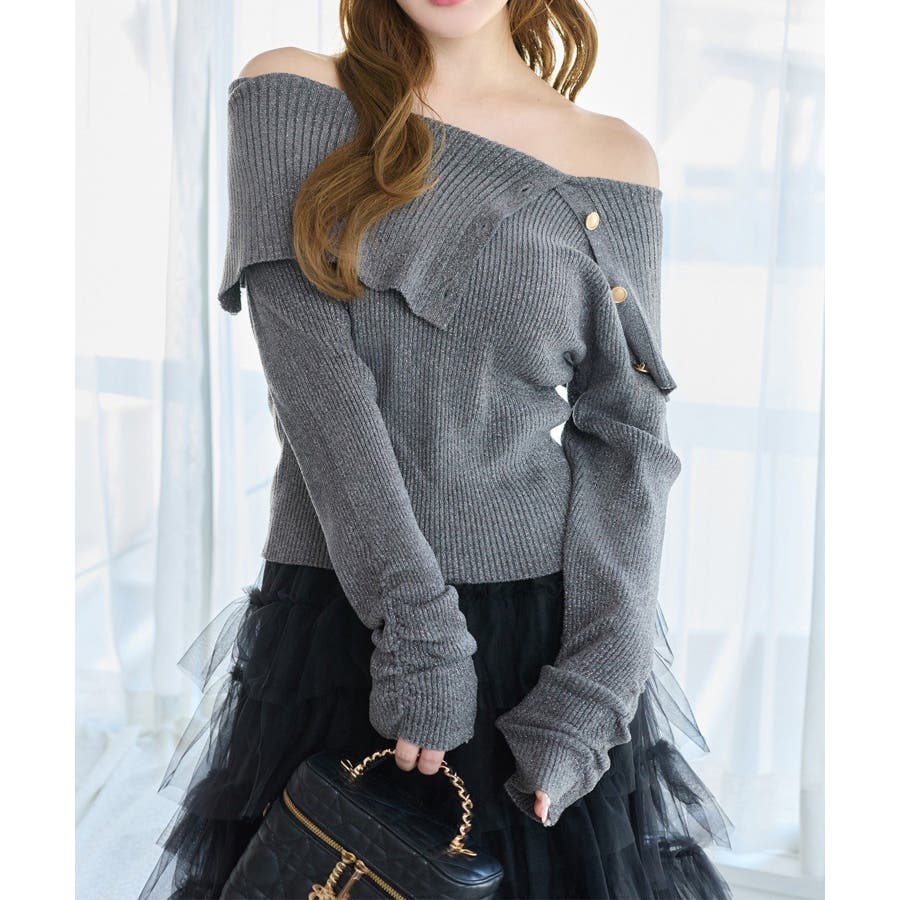 ラメ混素材がほんのりきらっとして、着るだけで華やぐオフショルニット。