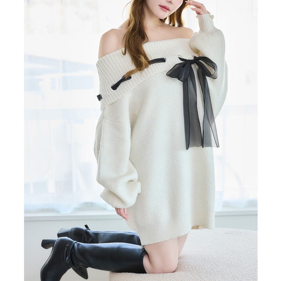 【one after another】リボン付きオフショルニットワンピ