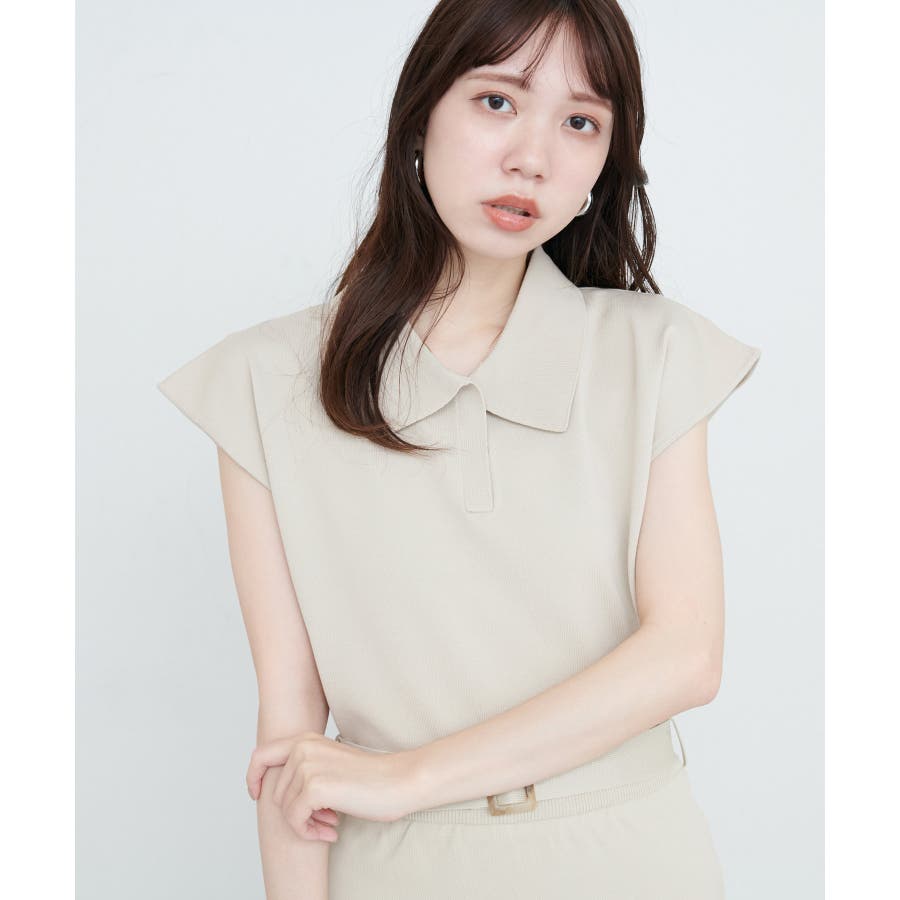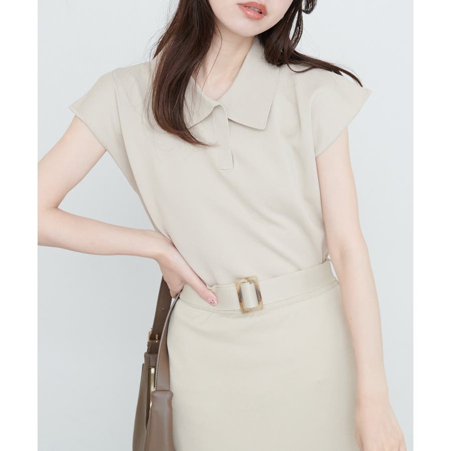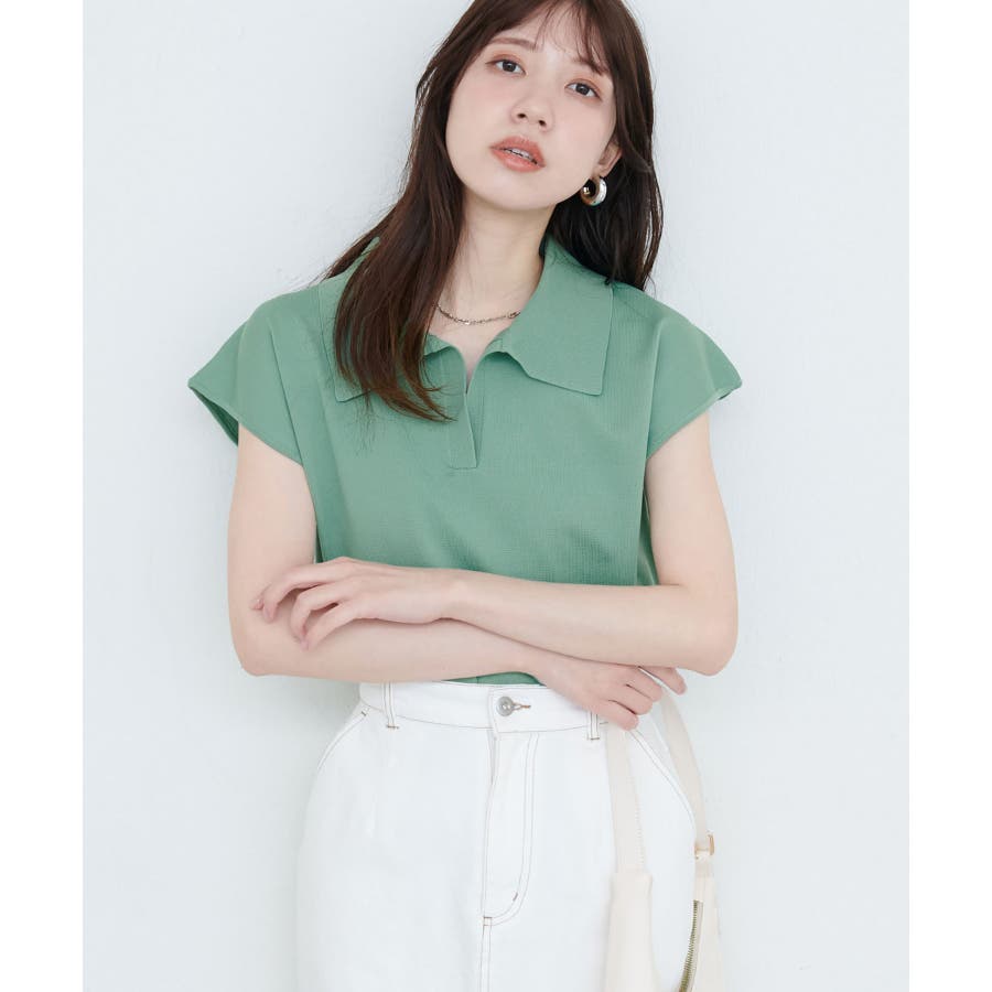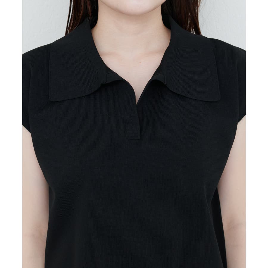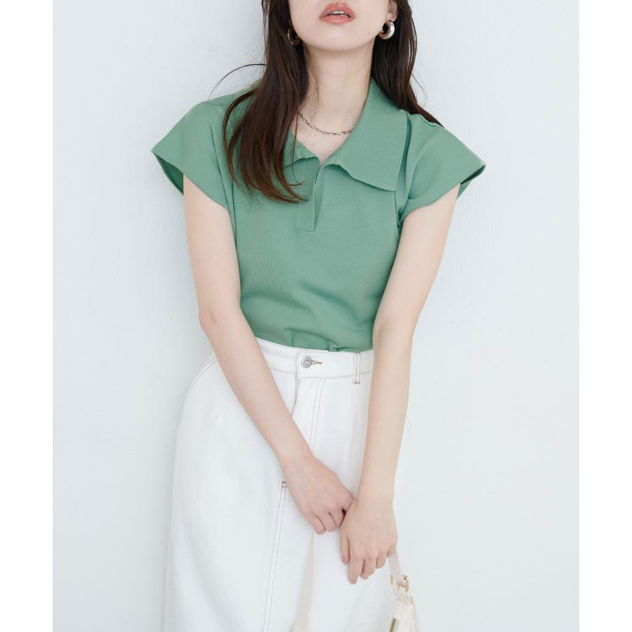 都会的で洗練された印象を与える、襟付きニットポロトップス。