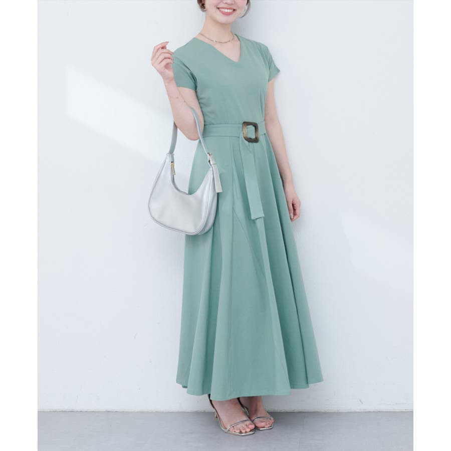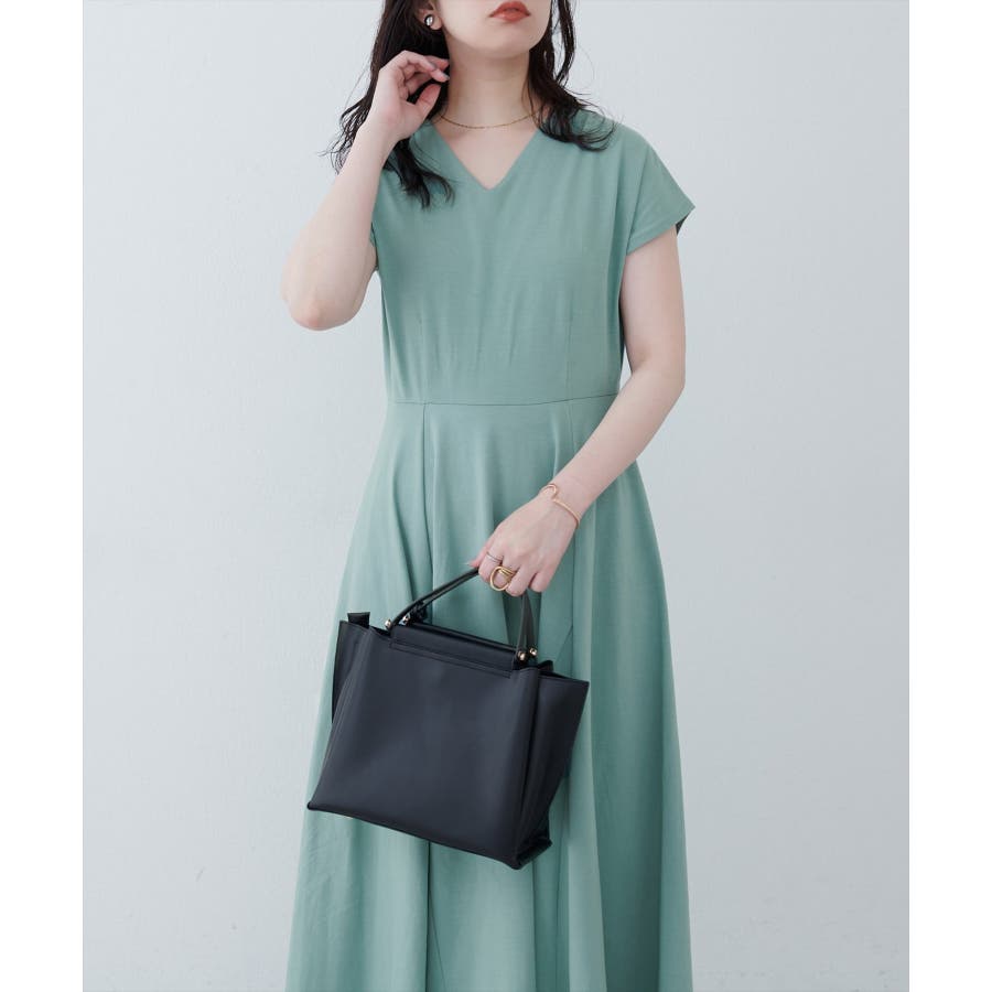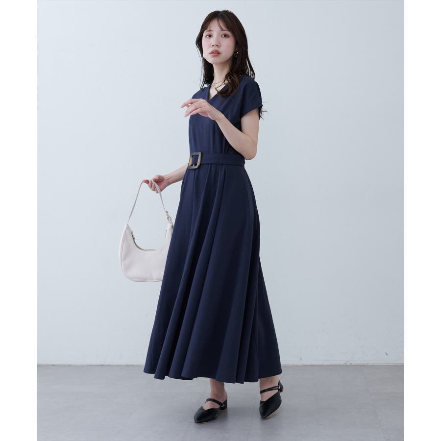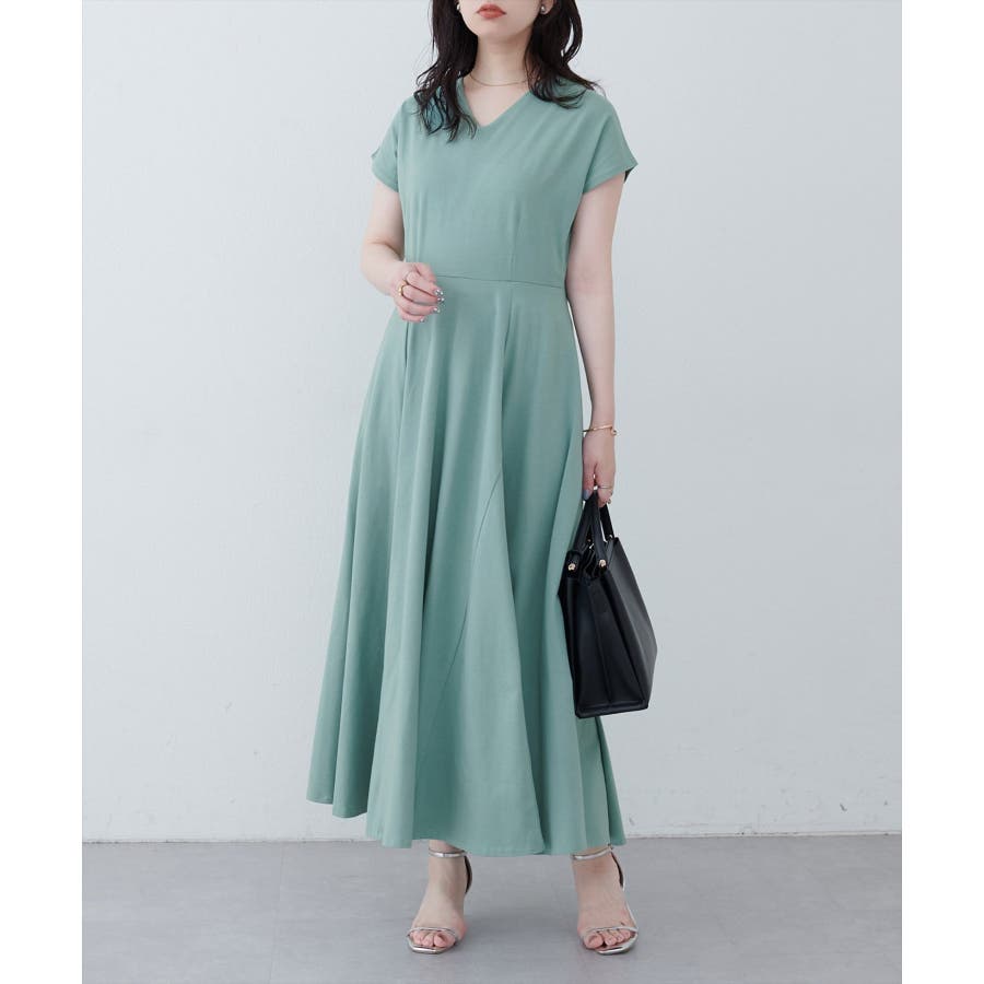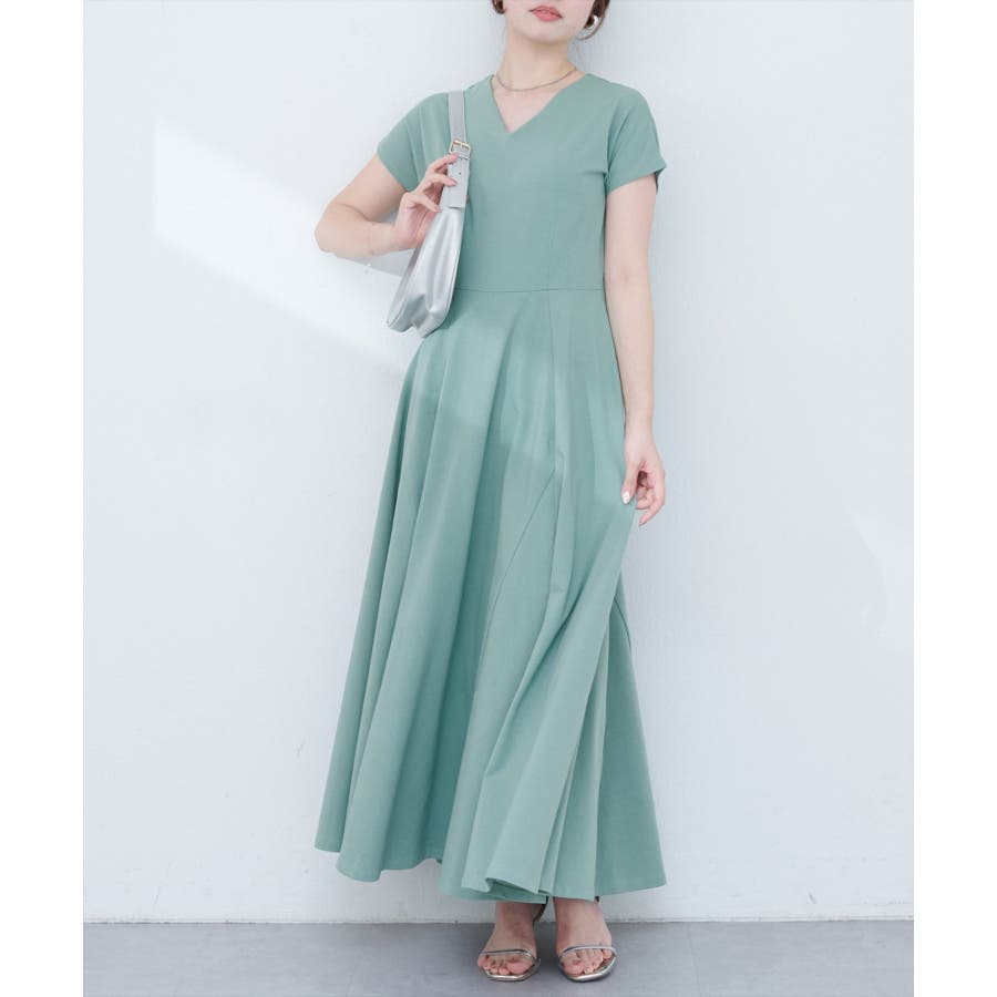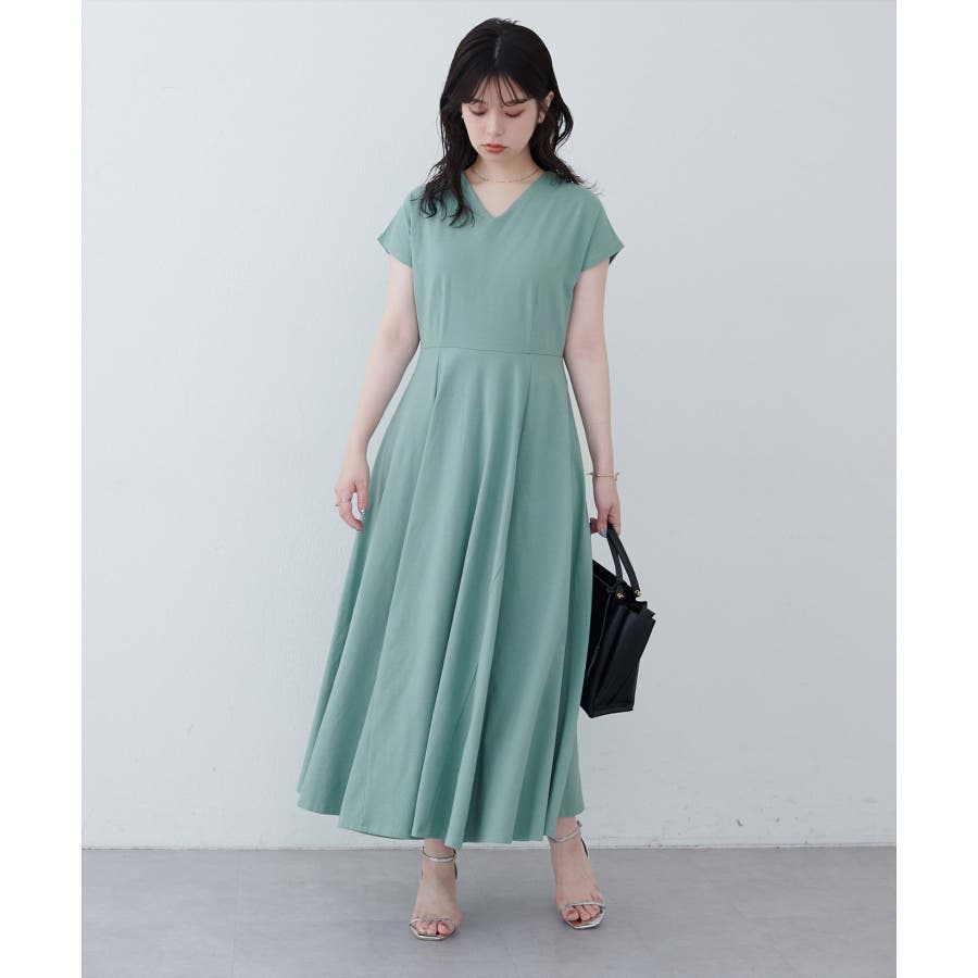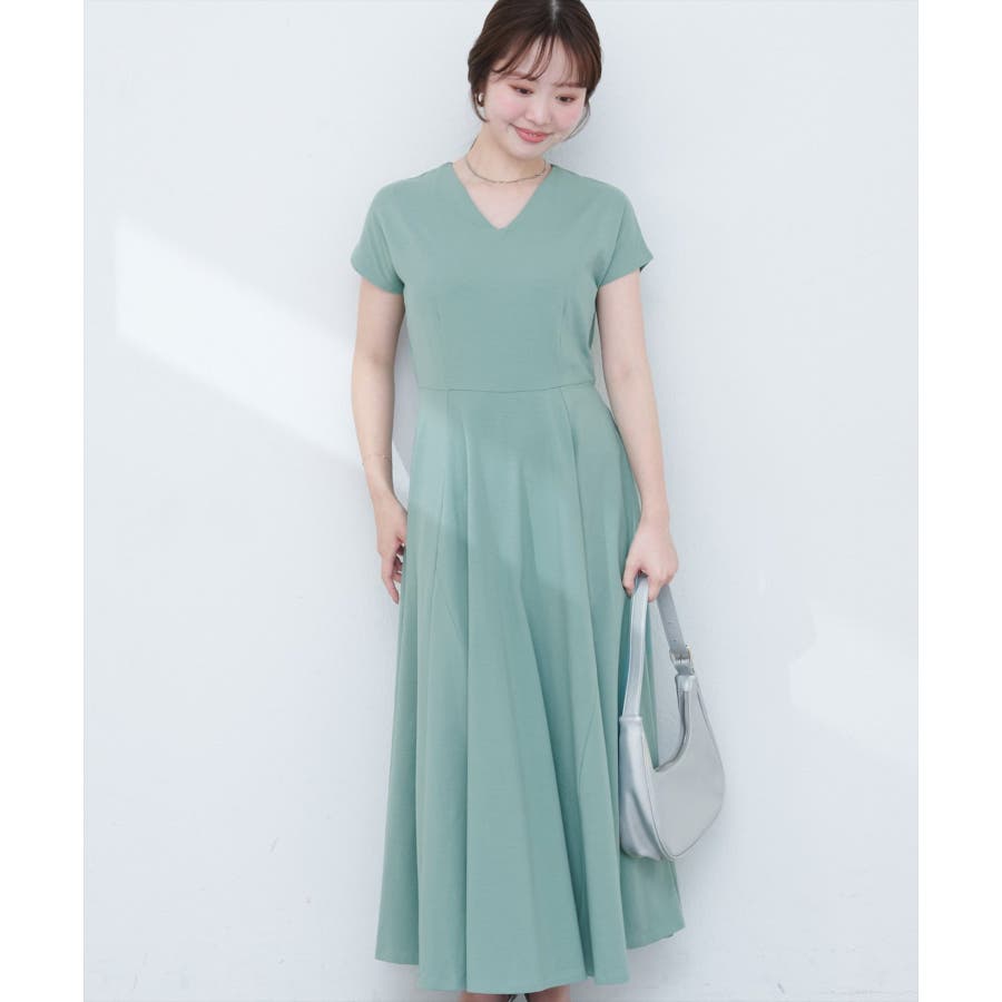 Vネックとフレアスカートの組み合わせが、女性らしい美しいシルエットを演出。