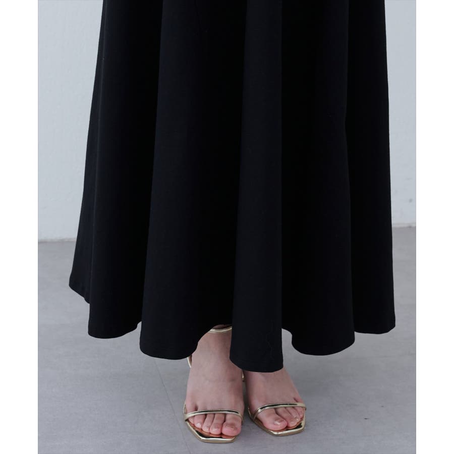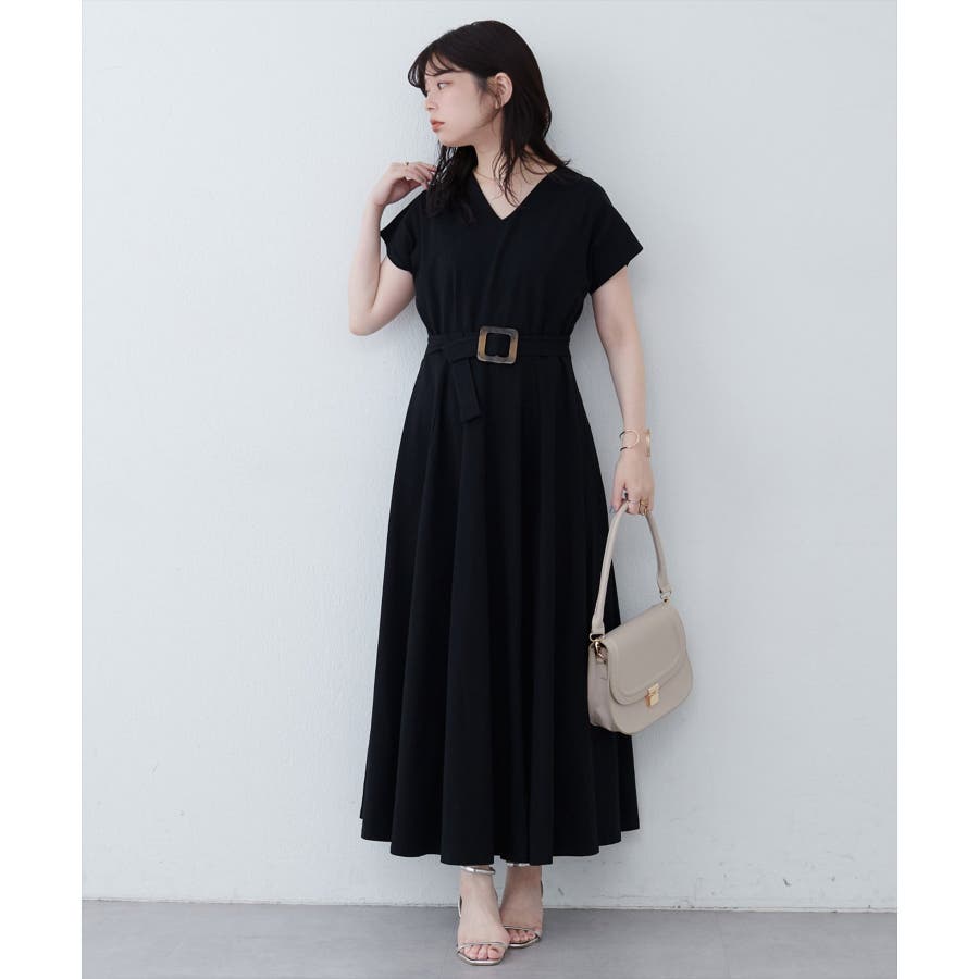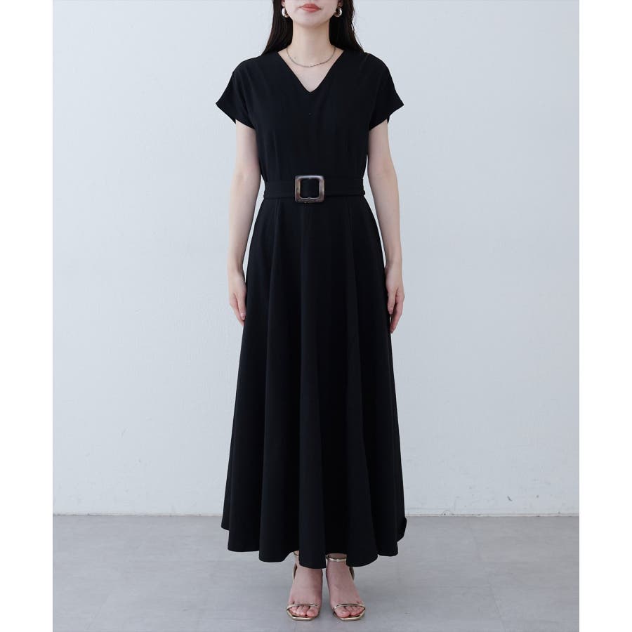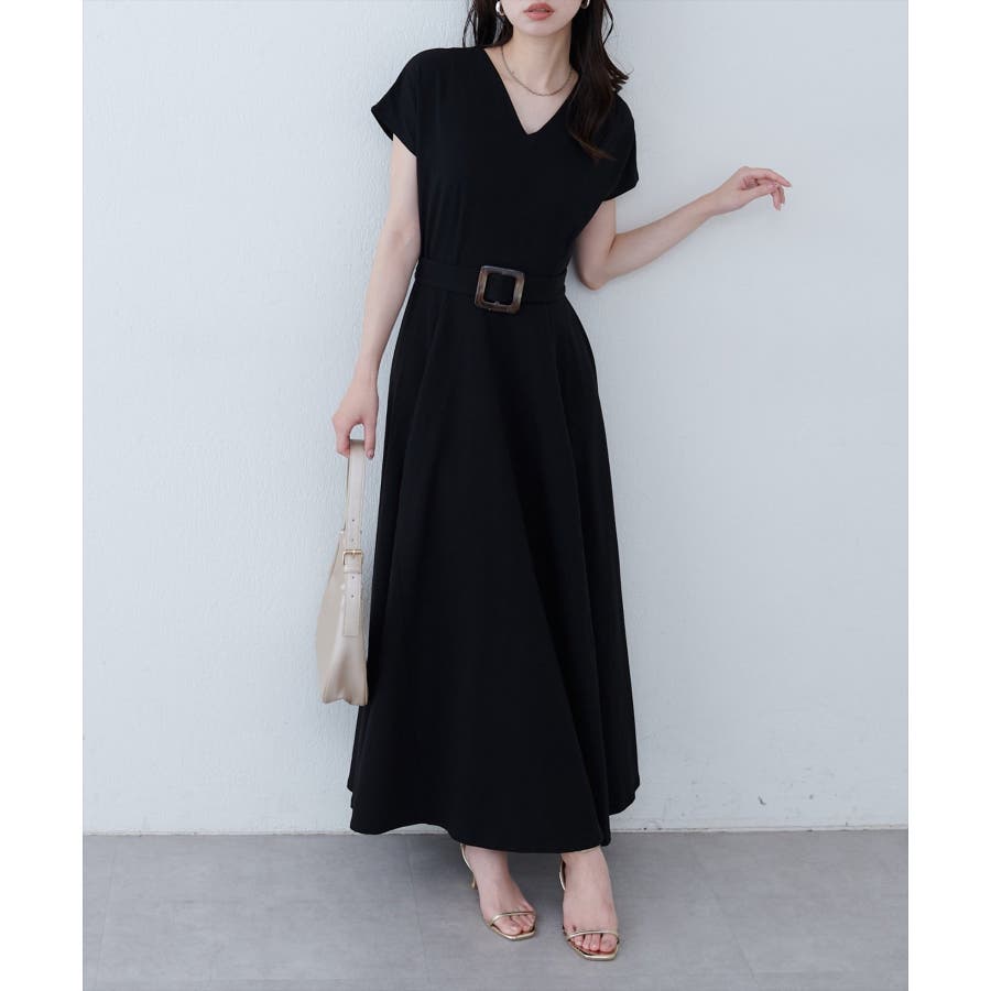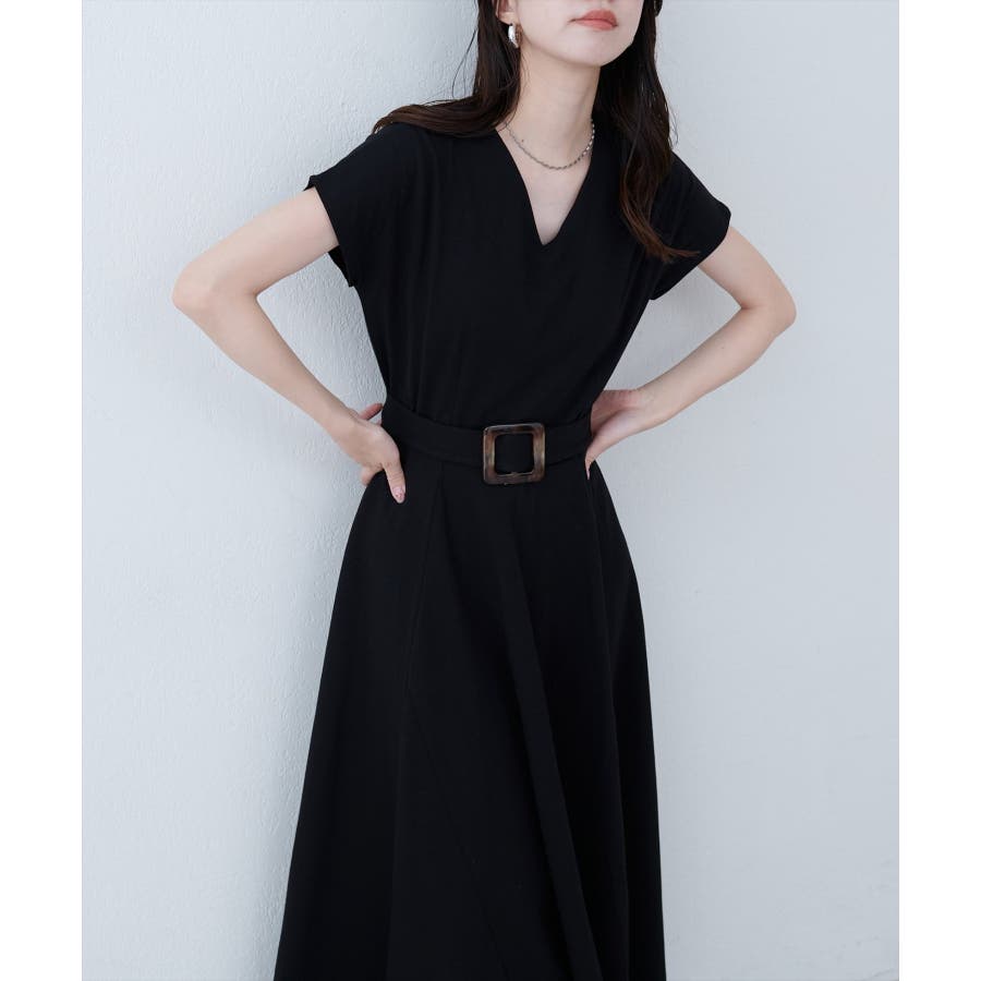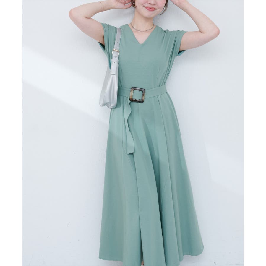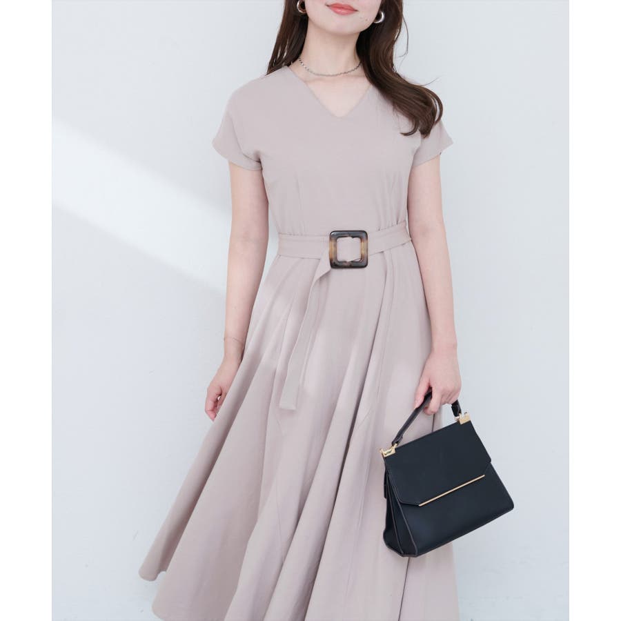 Vネックとフレアスカートの組み合わせが、女性らしい美しいシルエットを演出。