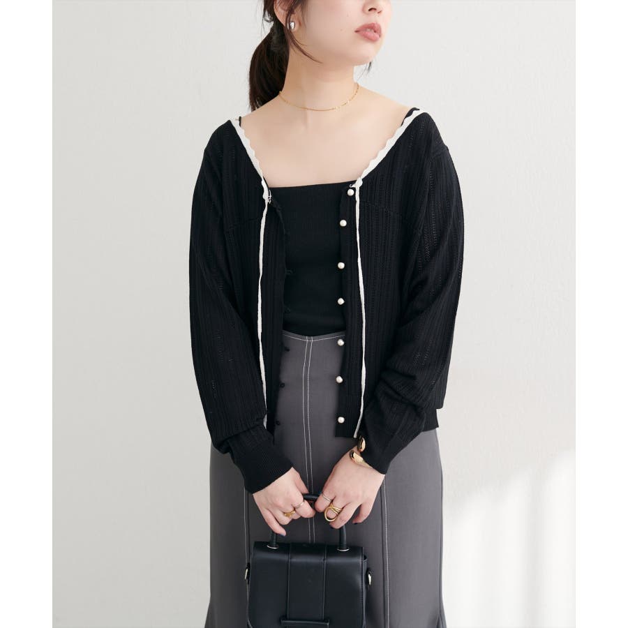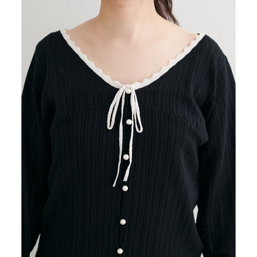 【natural couture】配色リボン透かし編みカーディガン