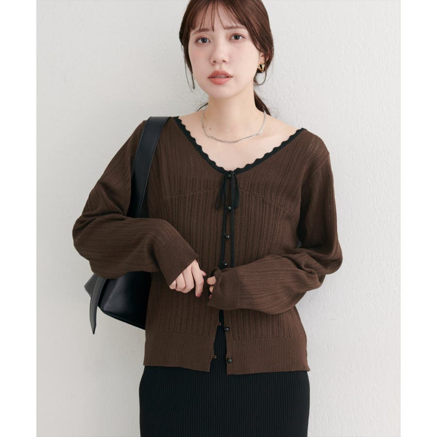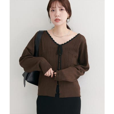 胸元のリボンとレーストリムが、大人の可愛らしさを引き立てるカーディガン。