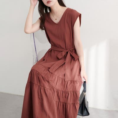 深めのVネックと、ふんわりと広がるギャザー切替が印象的なワンピース。