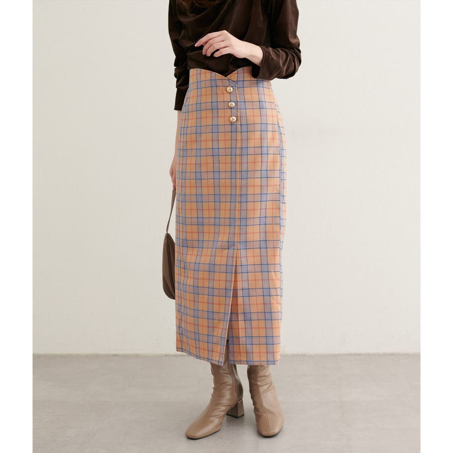 【natural couture】デザイン釦ラップ風チェックスカート