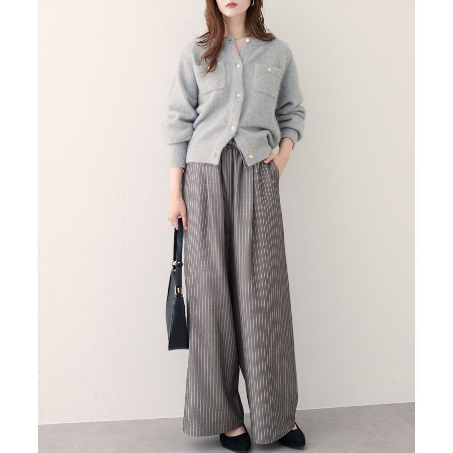 画像のように、コンパクトなニットカーディガンと合わせれば、上品で女性らしい印象に。