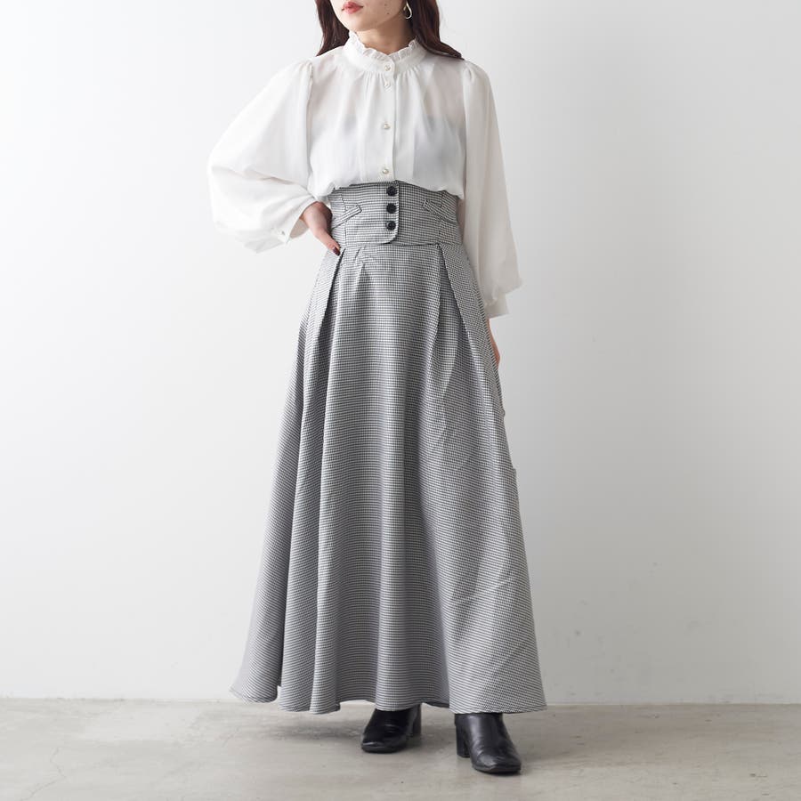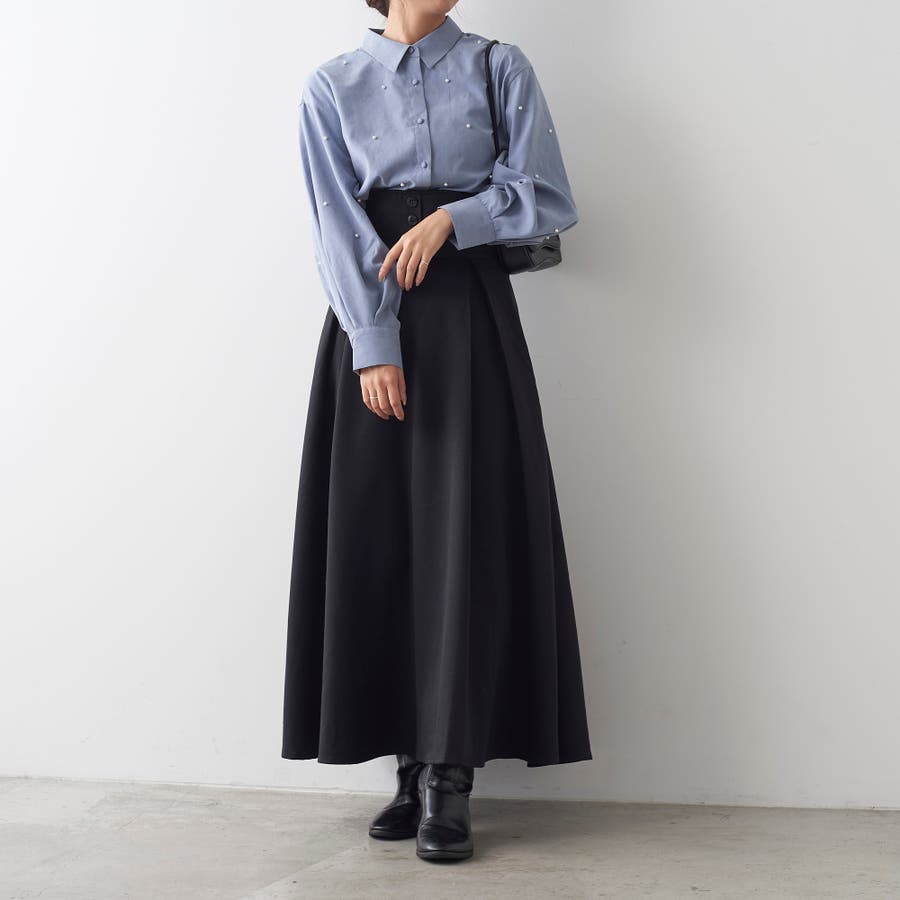 ・ベーシックなブラウスを合わせても、ハイウエストデザインがおなか周りを引き締めドレスのようなシルエットにしてくれます