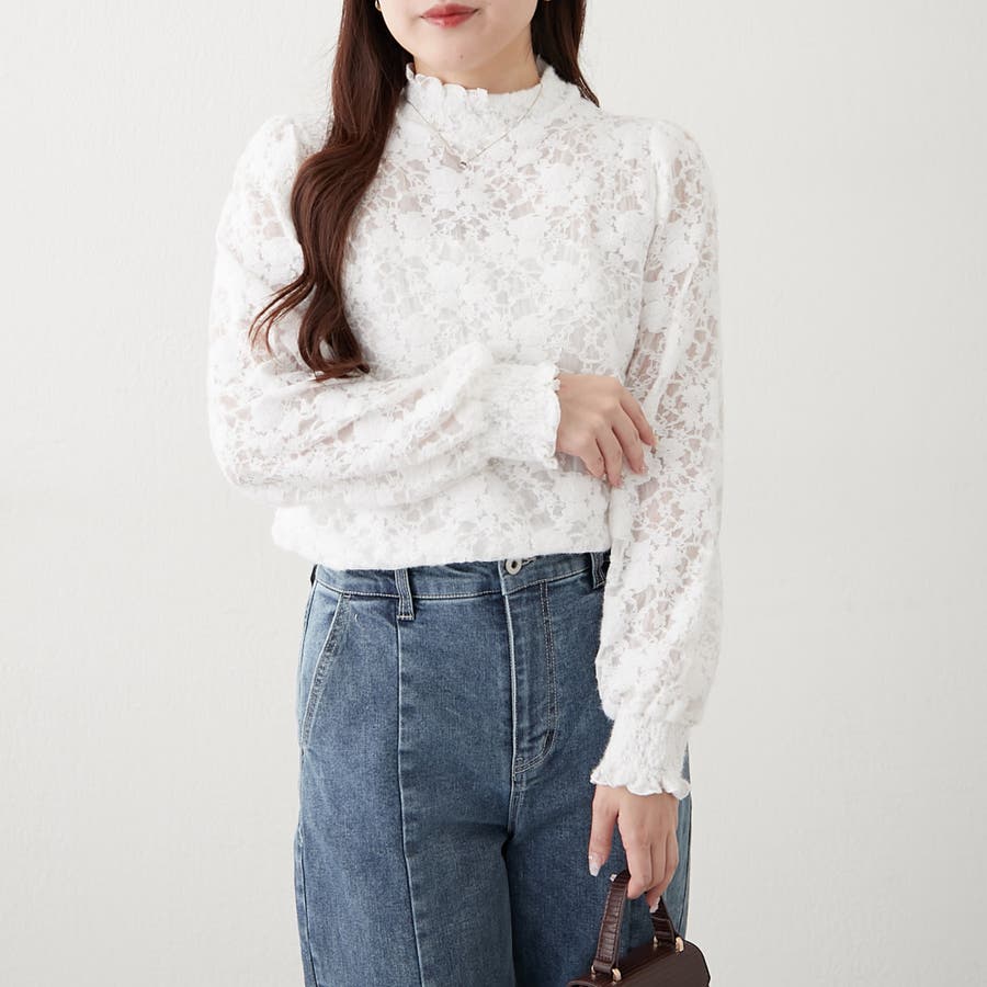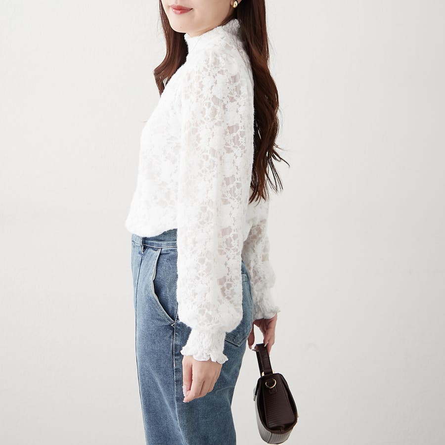 ・程よい透け感と、さりげないボリューム袖が、女性らしさを引き立てます。