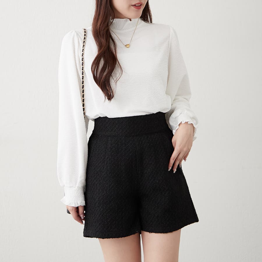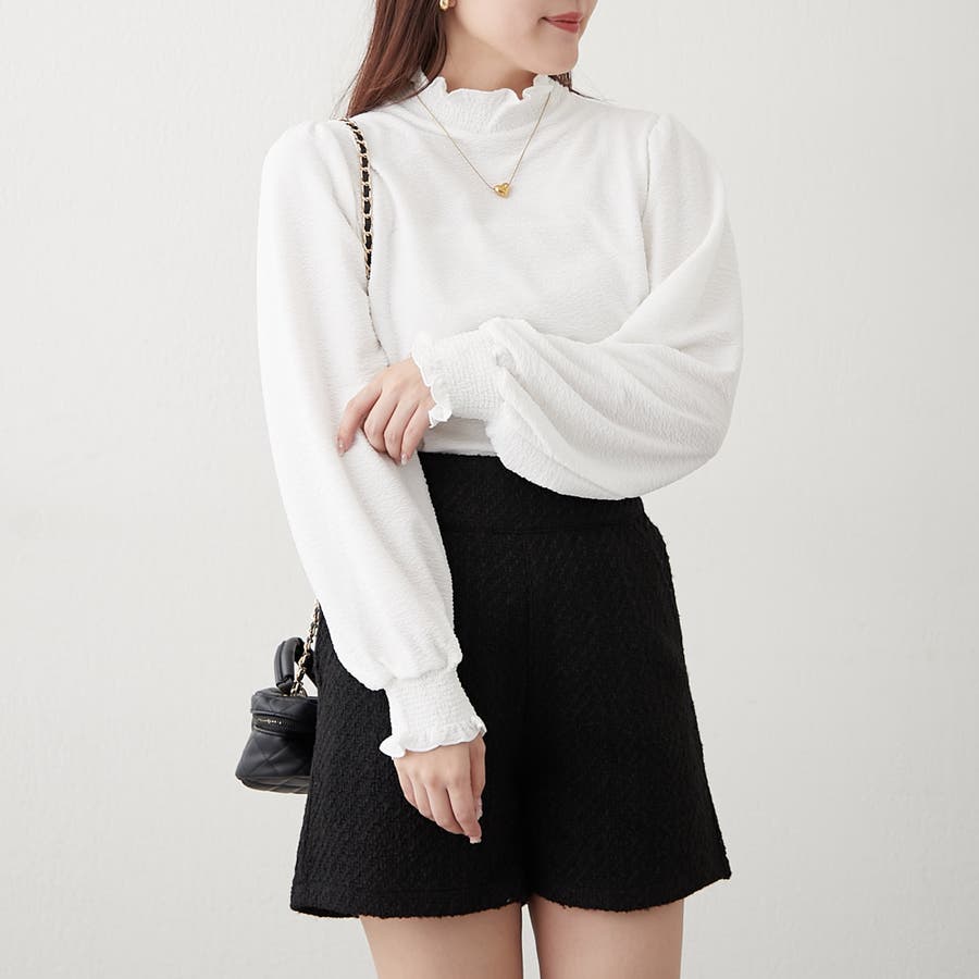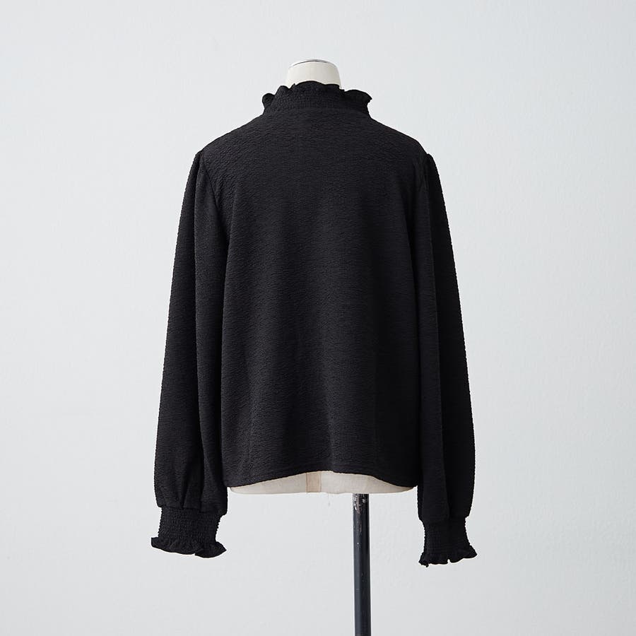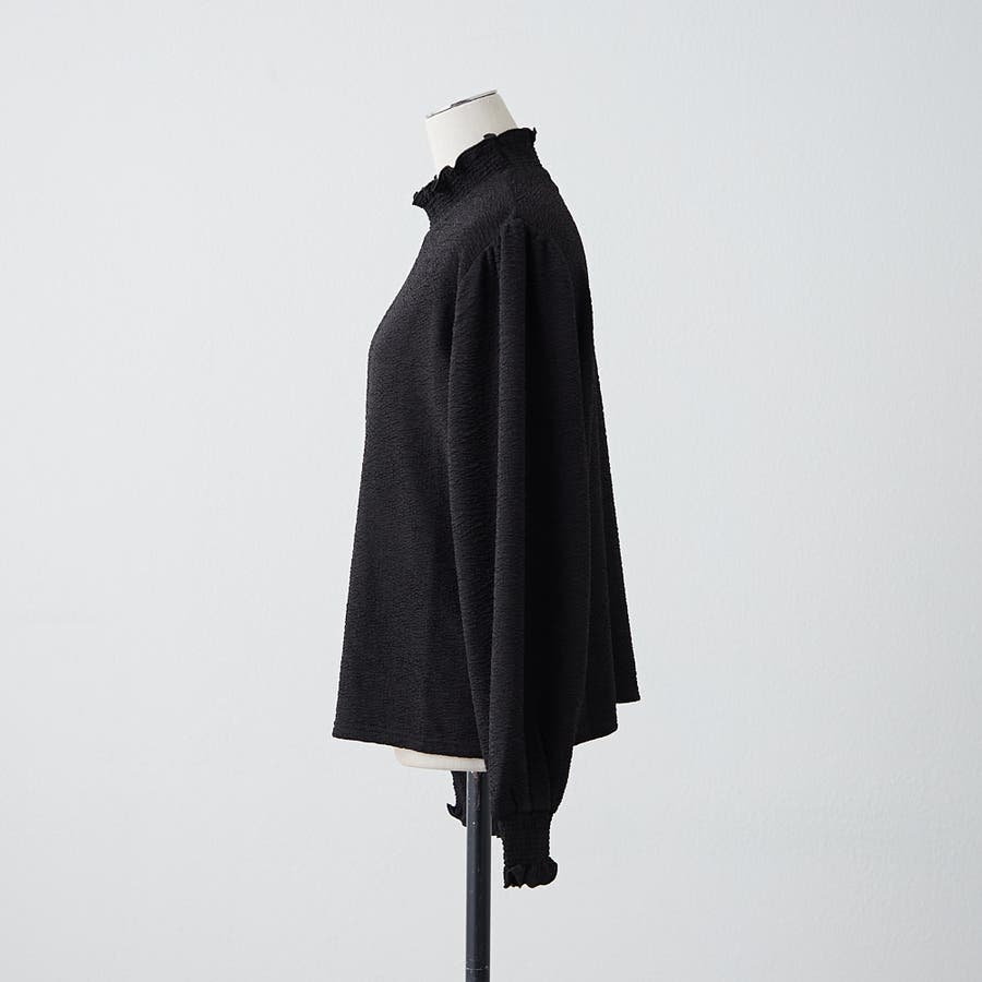 ・繊細なシャーリングとプチハイネックが上品なブラウス。