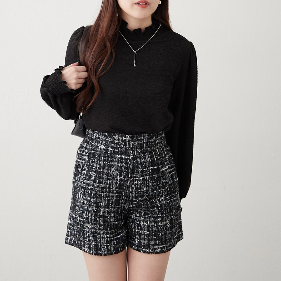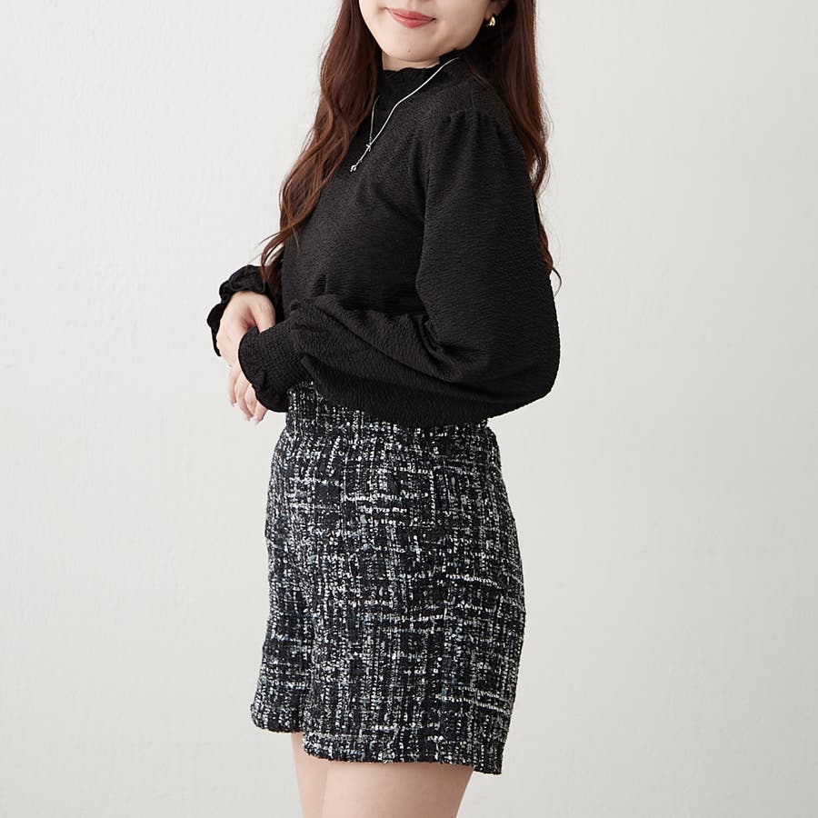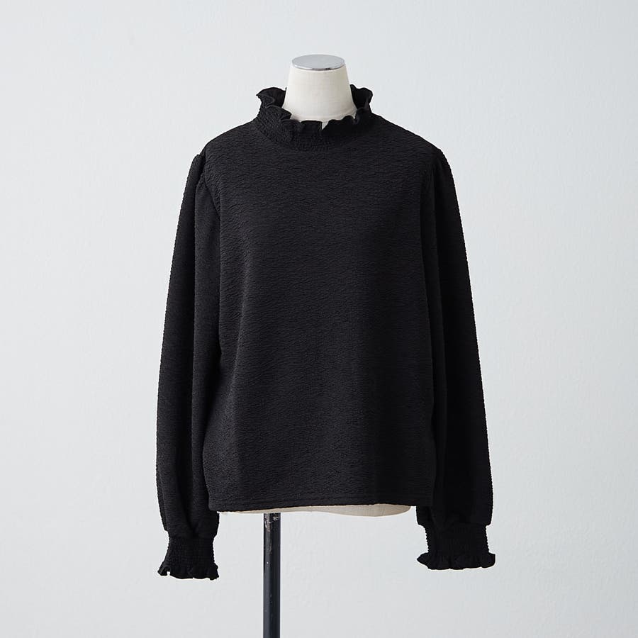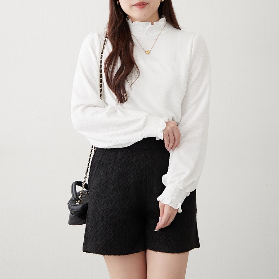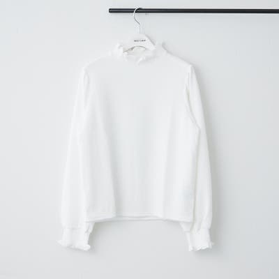 ・繊細なシャーリングとプチハイネックが上品なブラウス。