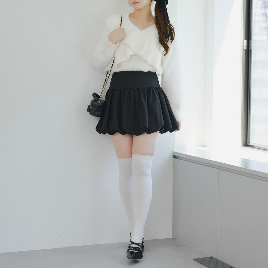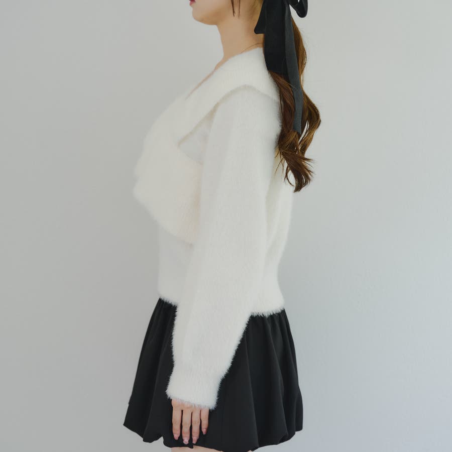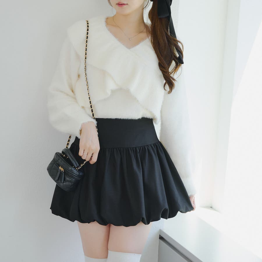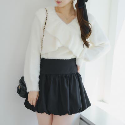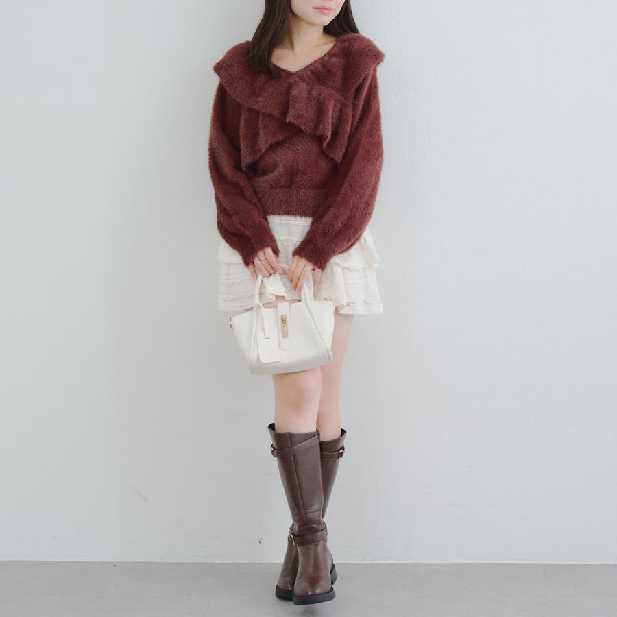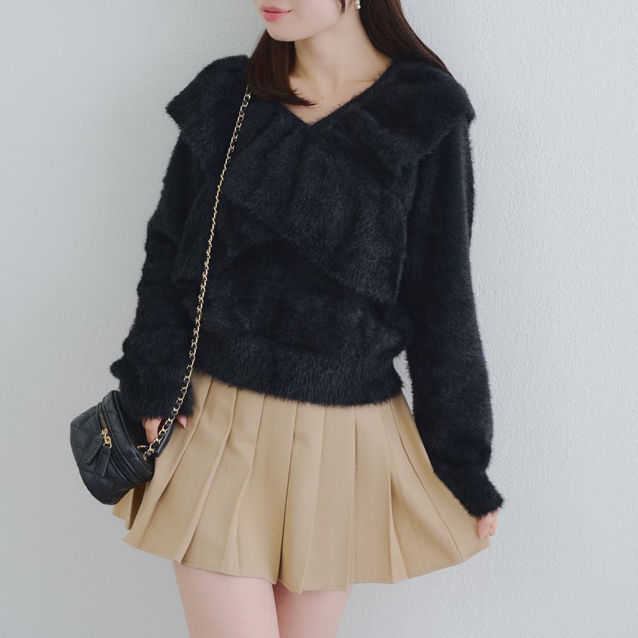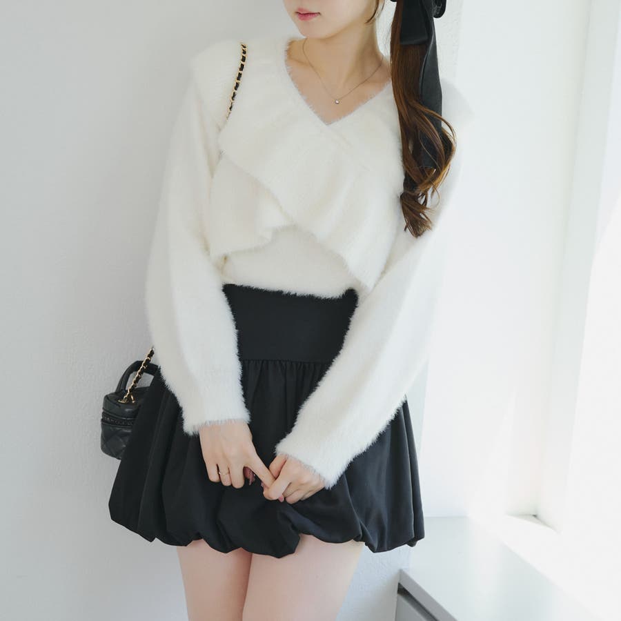 ・ふわふわのフェザー素材と、クロスデザインのフリルが大人可愛いニット。