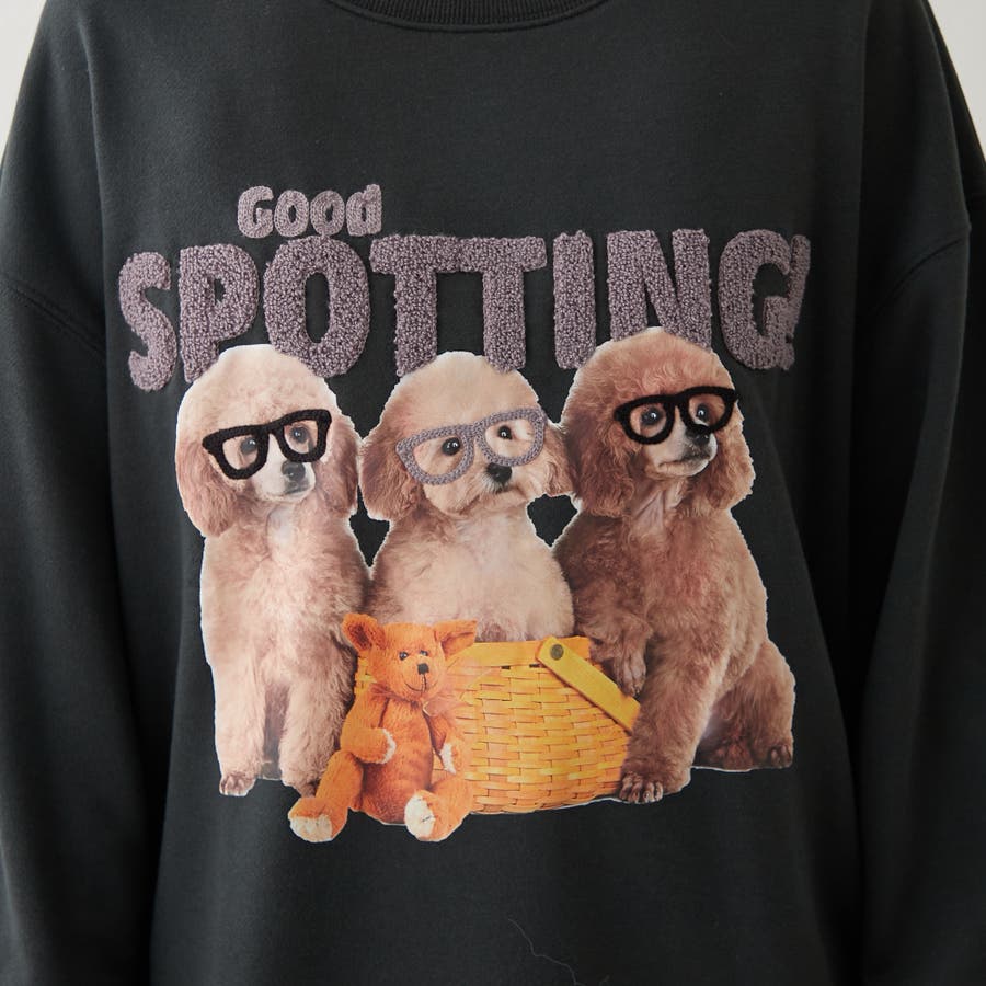 ・愛くるしい子犬プリントにロゴ部分はサガラ刺繍になっているキャッチーなスウェット