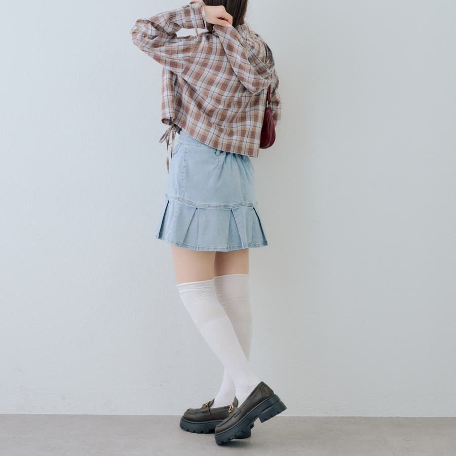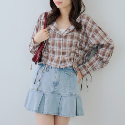 ・ブラウスにデニムミニスカートを合わせて、元気な印象に