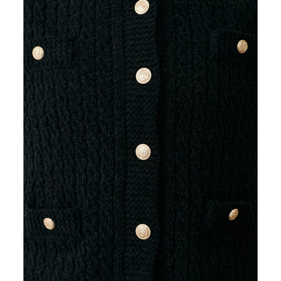 金ボタンが上品なアクセントとなり、シンプルなシルエットながらも華やかさをプラスしています。