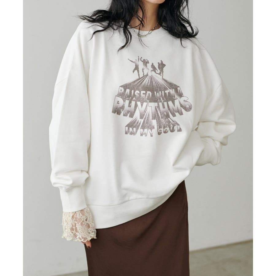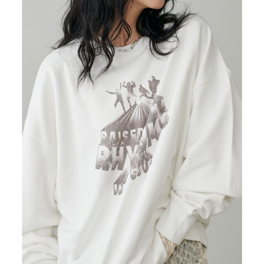 架空のバンドロゴをモチーフにした、遊び心のあるグラフィックプリントが印象的な裏毛プルオーバー。