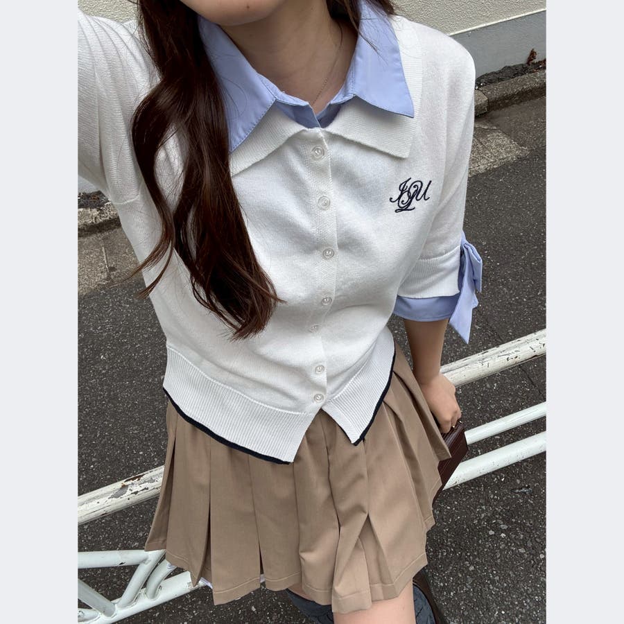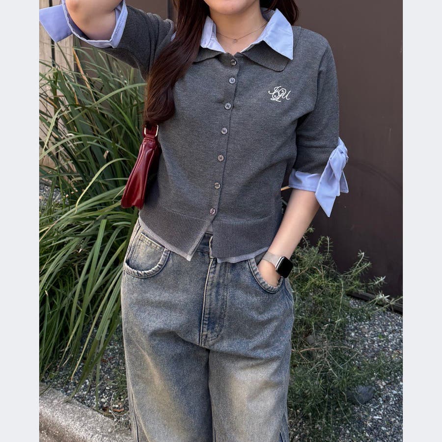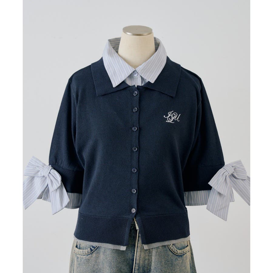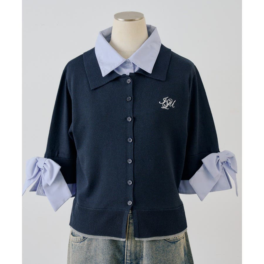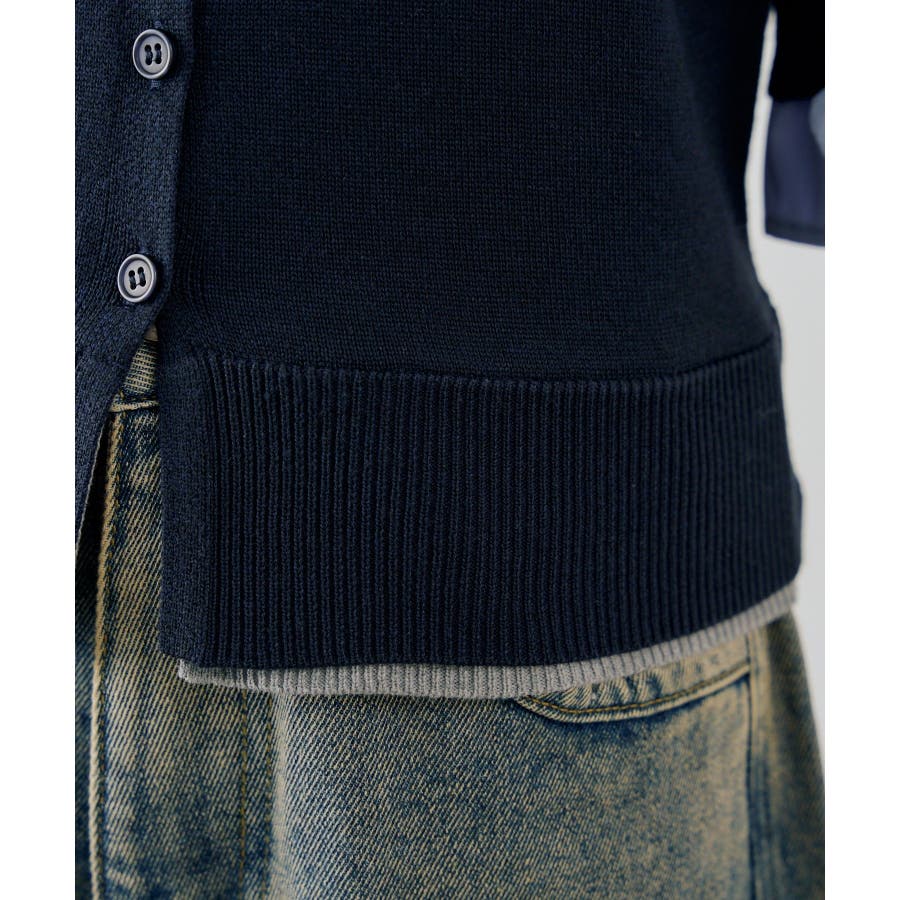 ・胸元の刺繍ロゴがさりげないアクセントになった、レイヤード風ニットカーディガン