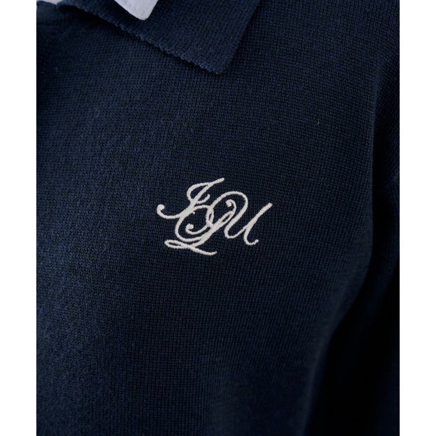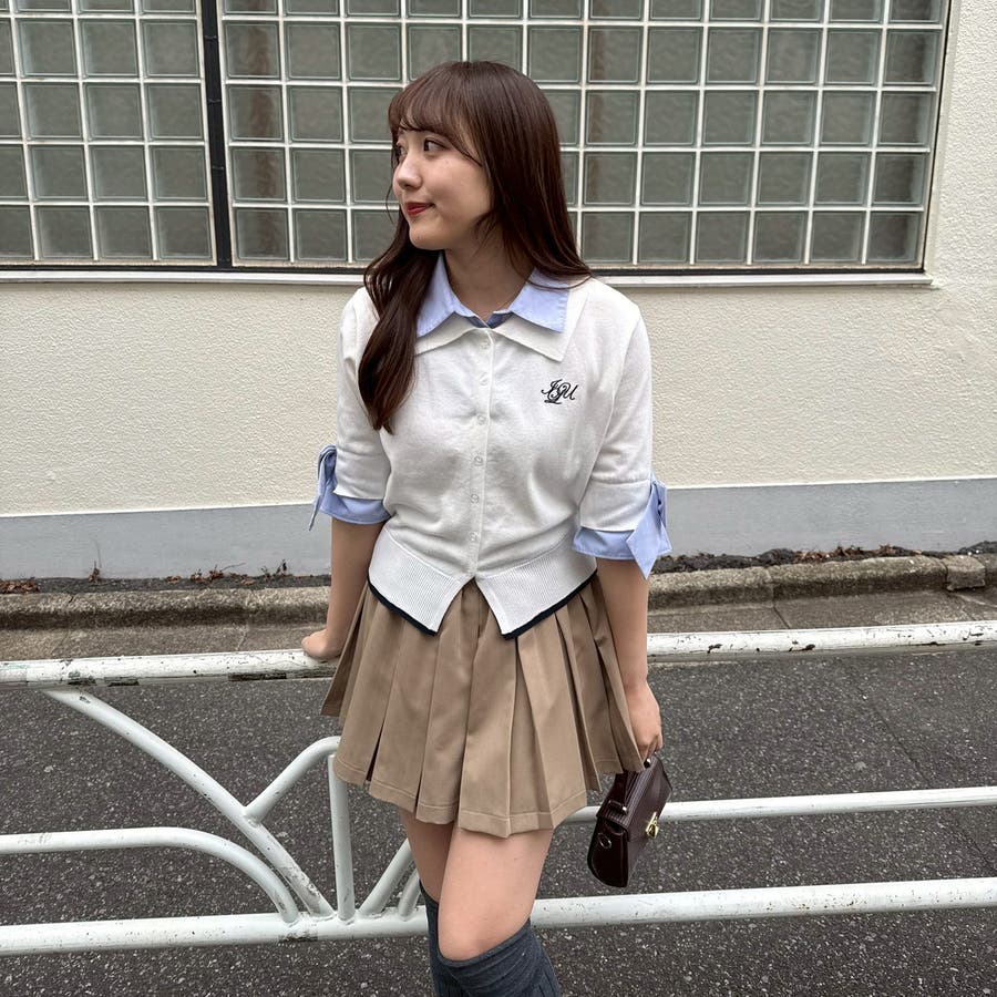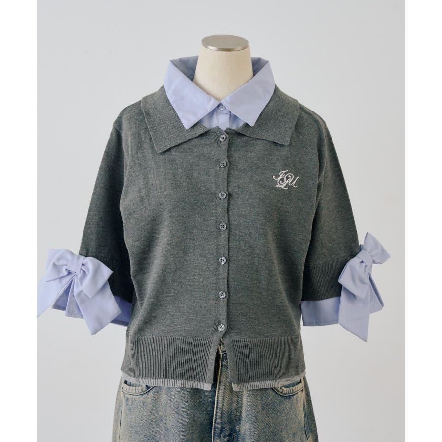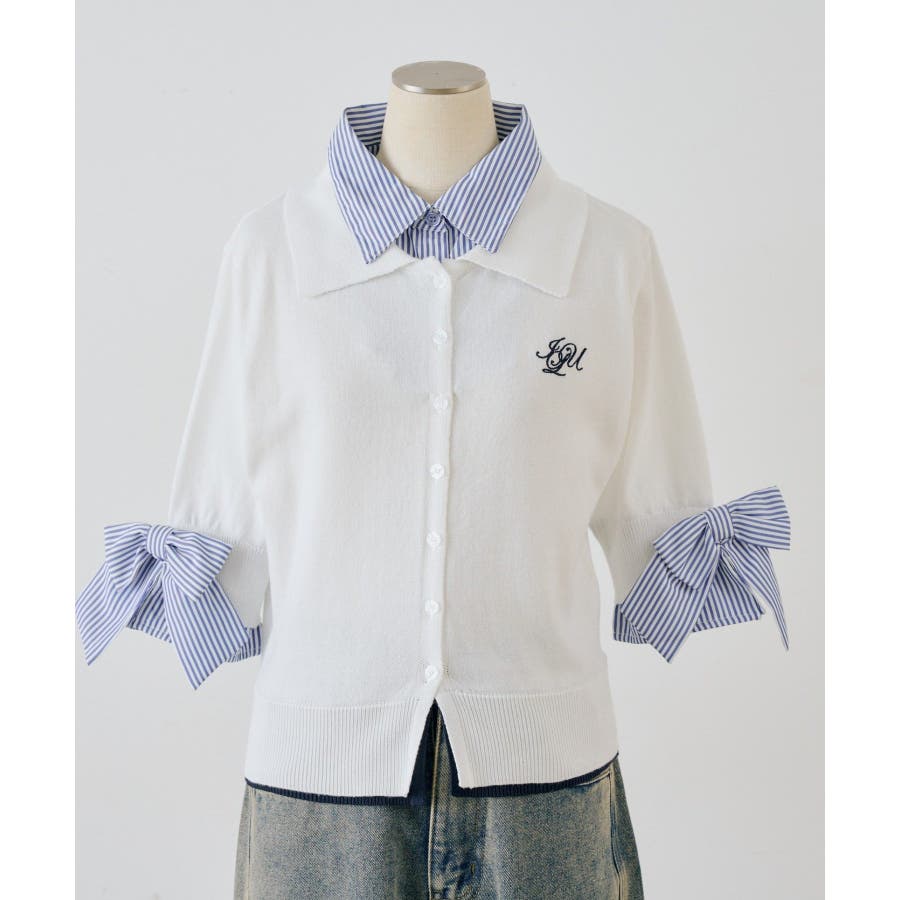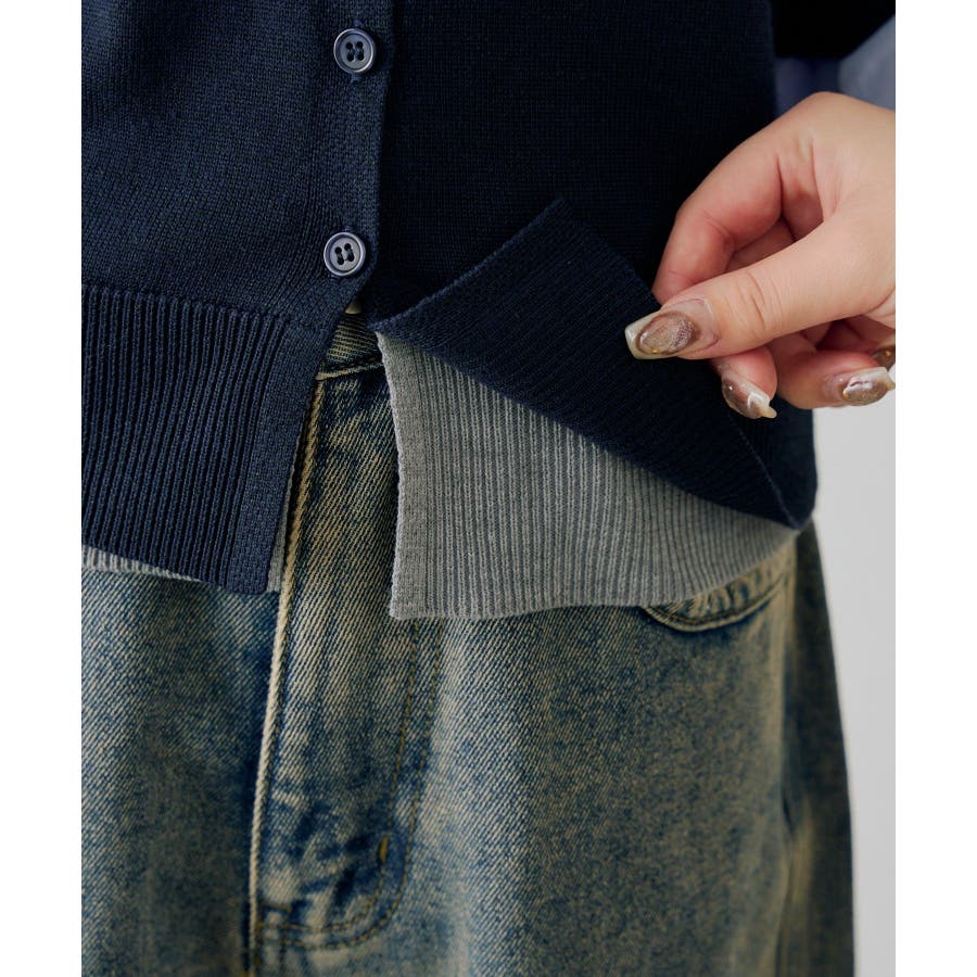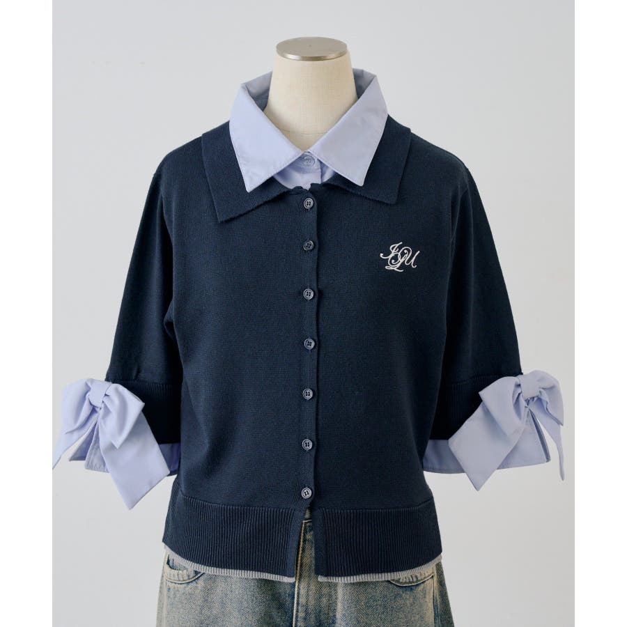 ・胸元の刺繍ロゴがさりげないアクセントになった、レイヤード風ニットカーディガン