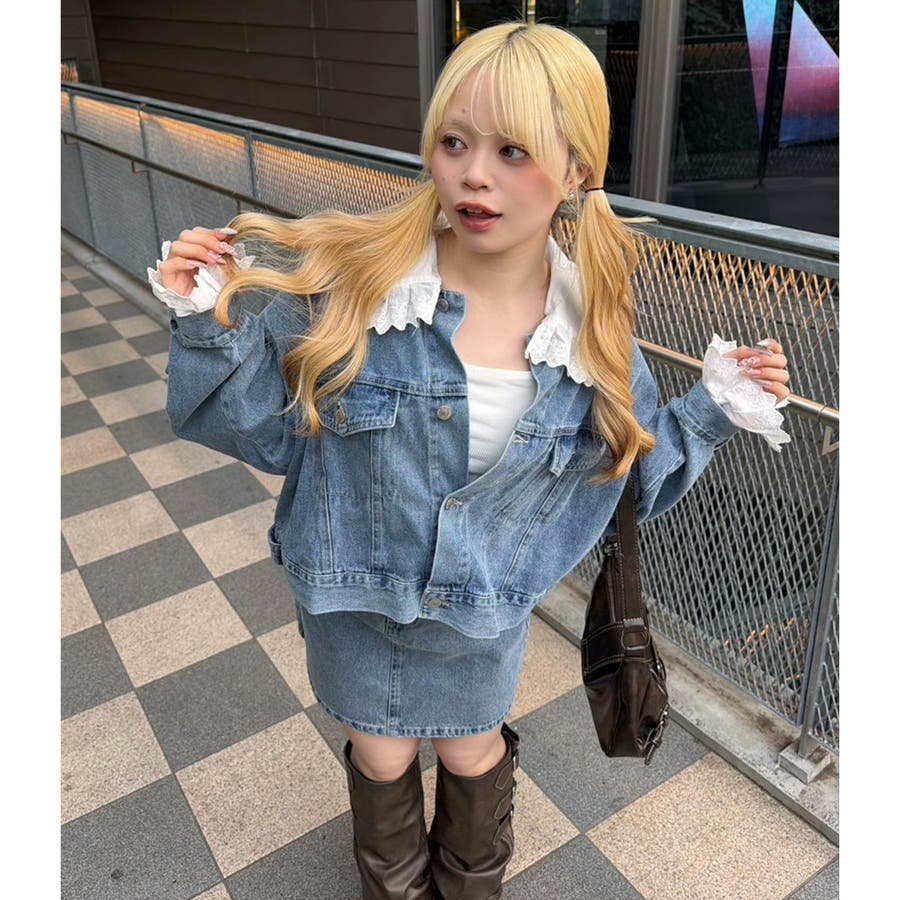 ・襟元の繊細なレースが目を惹くデニムジャケット