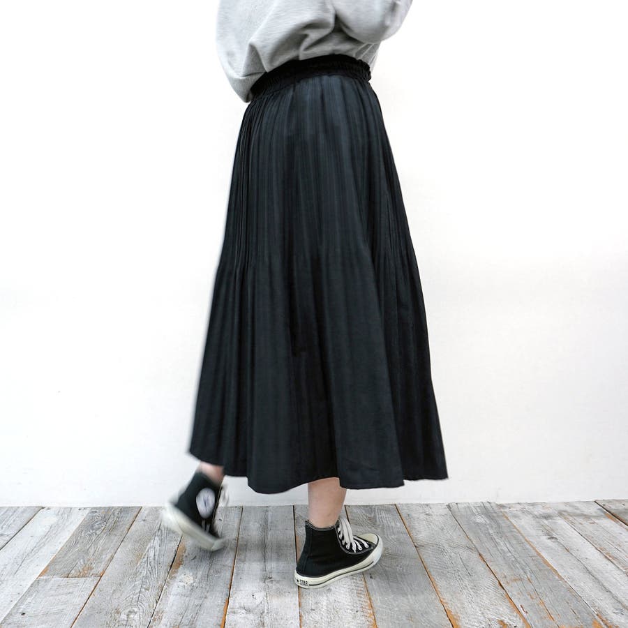 女性らしさを演出してくれる、裾に向かって徐々にフェードアウトしていくプリーツデザインが特徴の広がりの少ないシルエットのスカートです。