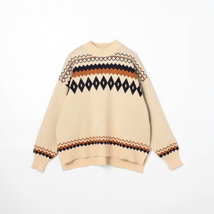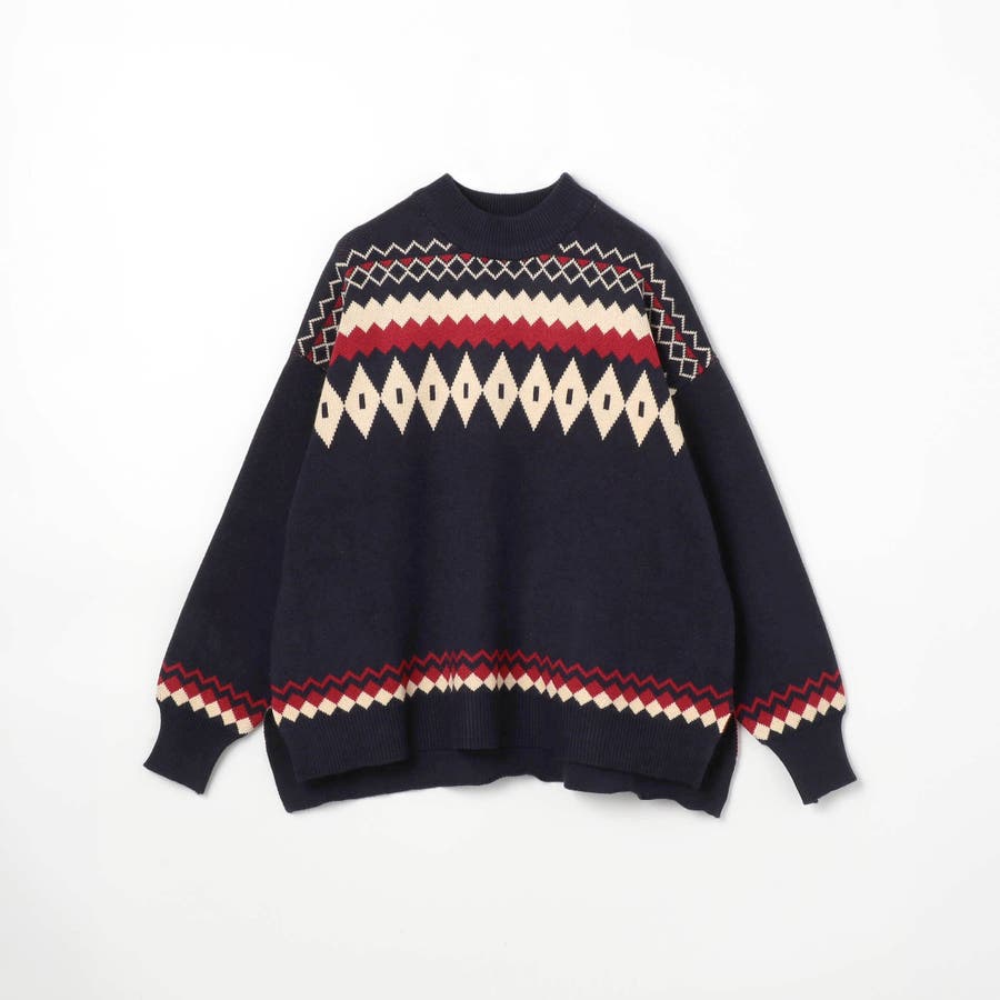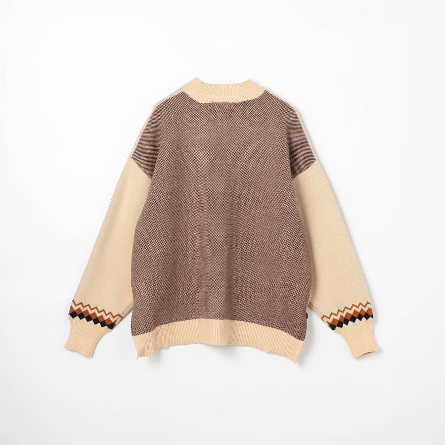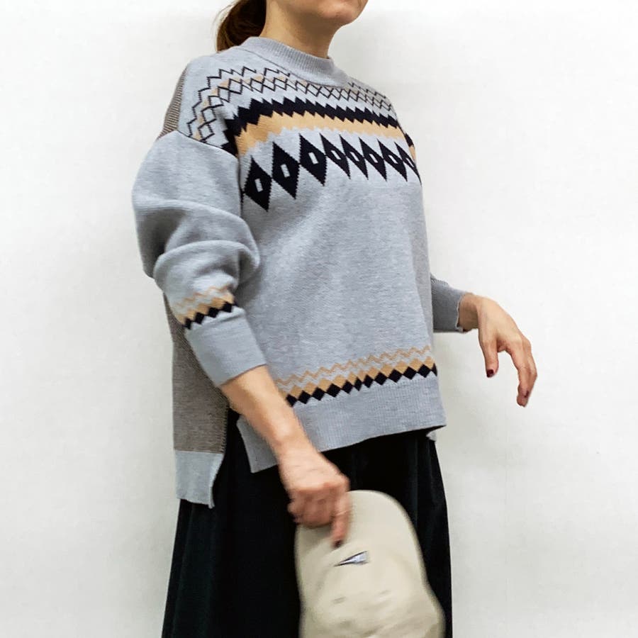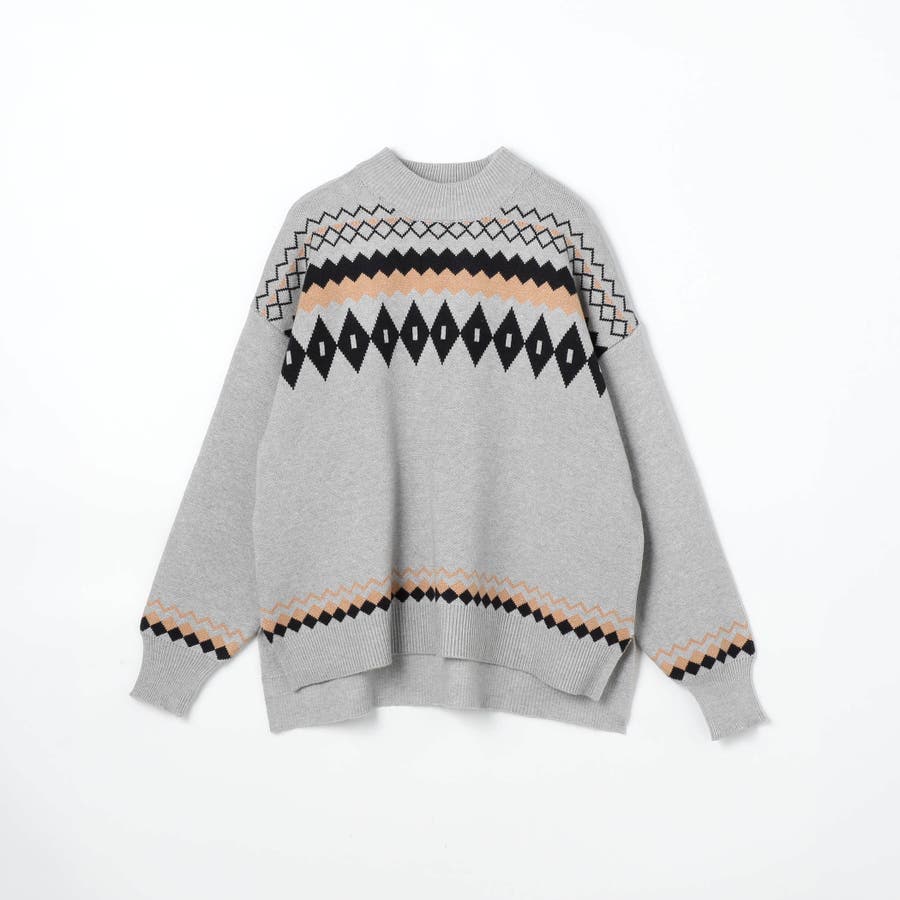 前面と背面で異なるアシンメトリーのジャガード柄が入った、モックネックニットです。