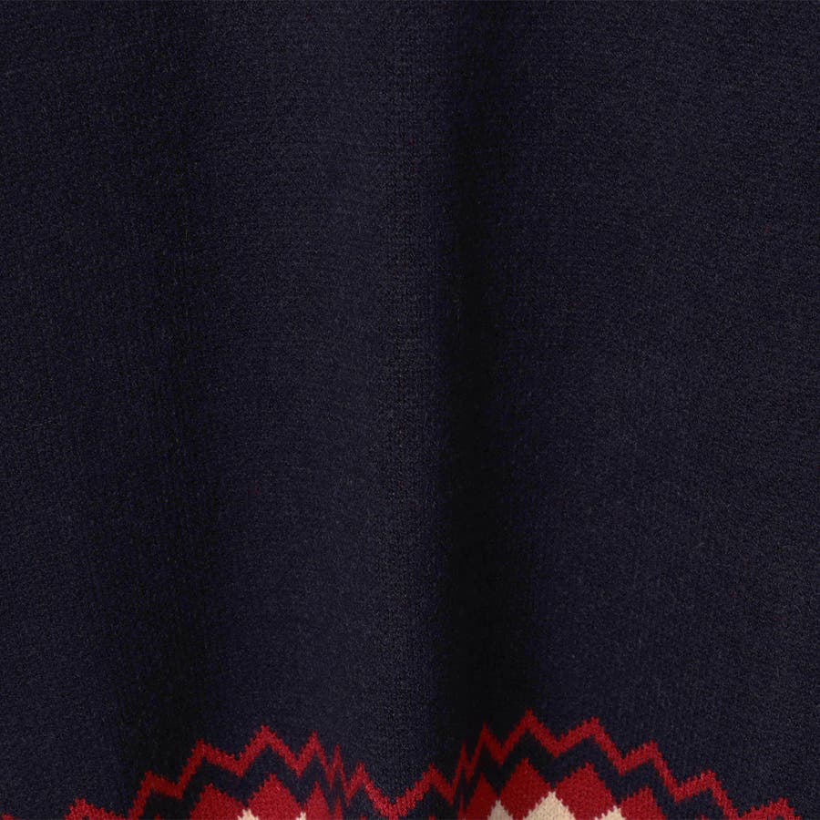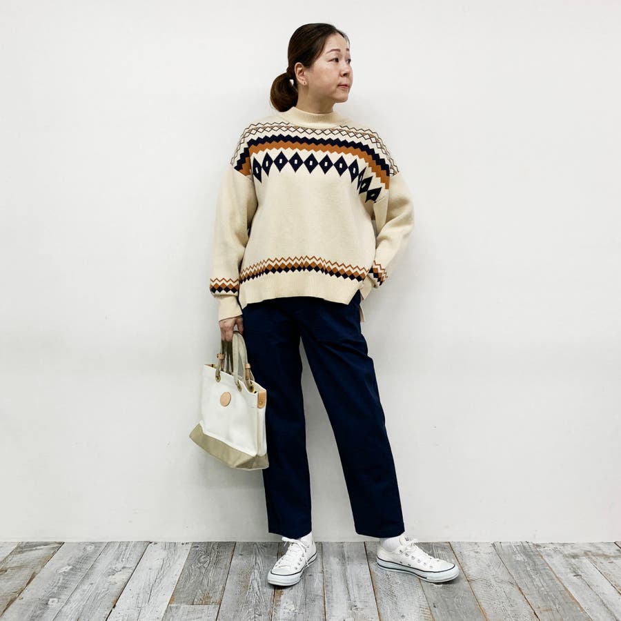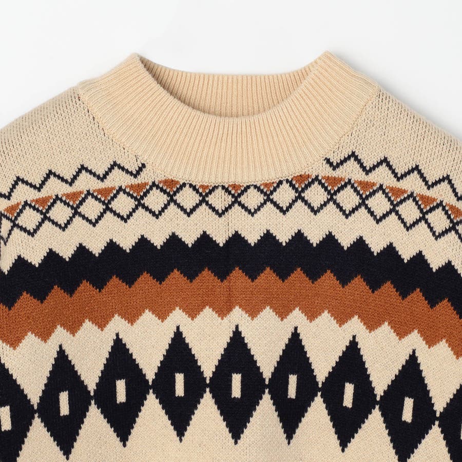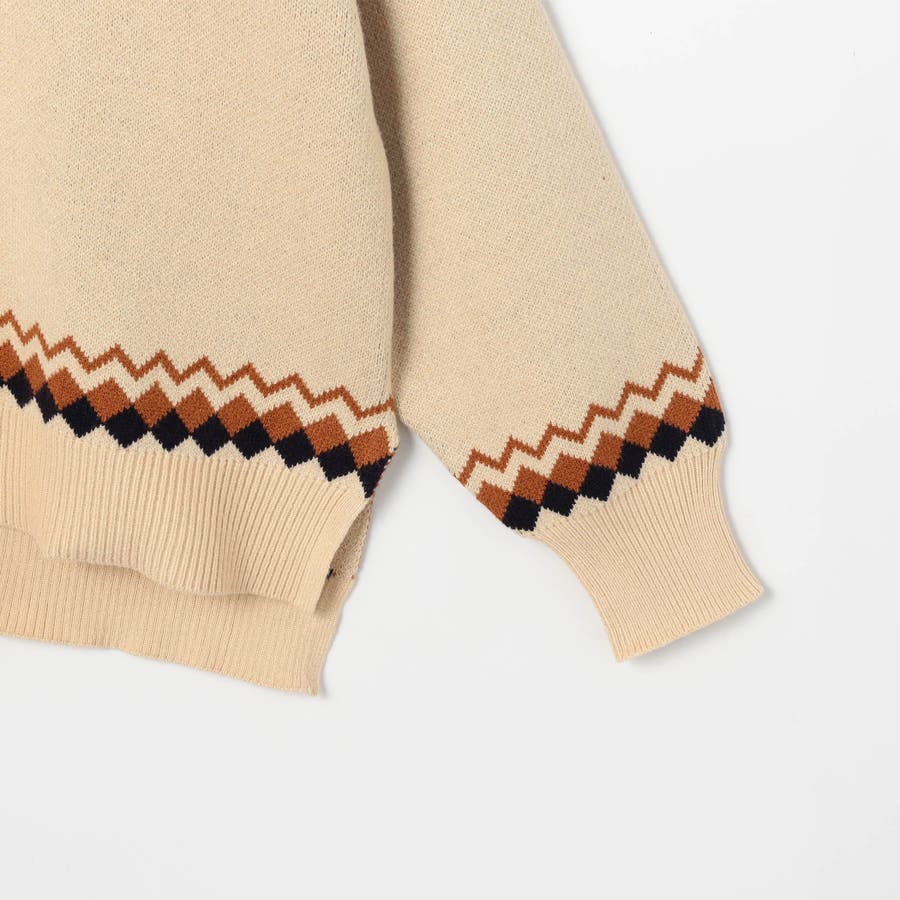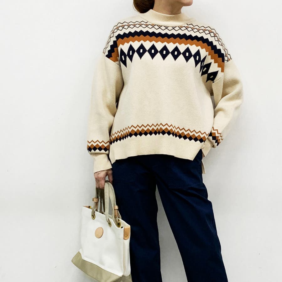 前面と背面で異なるアシンメトリーのジャガード柄が入った、モックネックニットです。