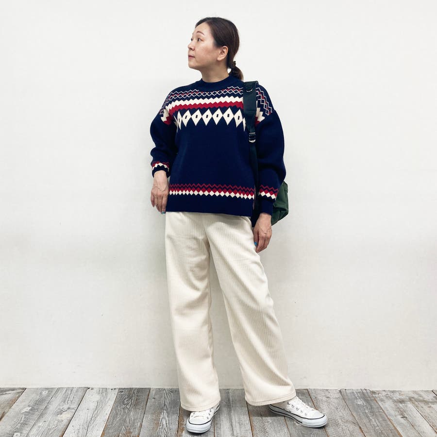 柄にインパクトがあり1着で主役になりますが、冬のアウターコーデのインナーとしてもポイントになり、インでもアウトでも活躍するアイテムです。