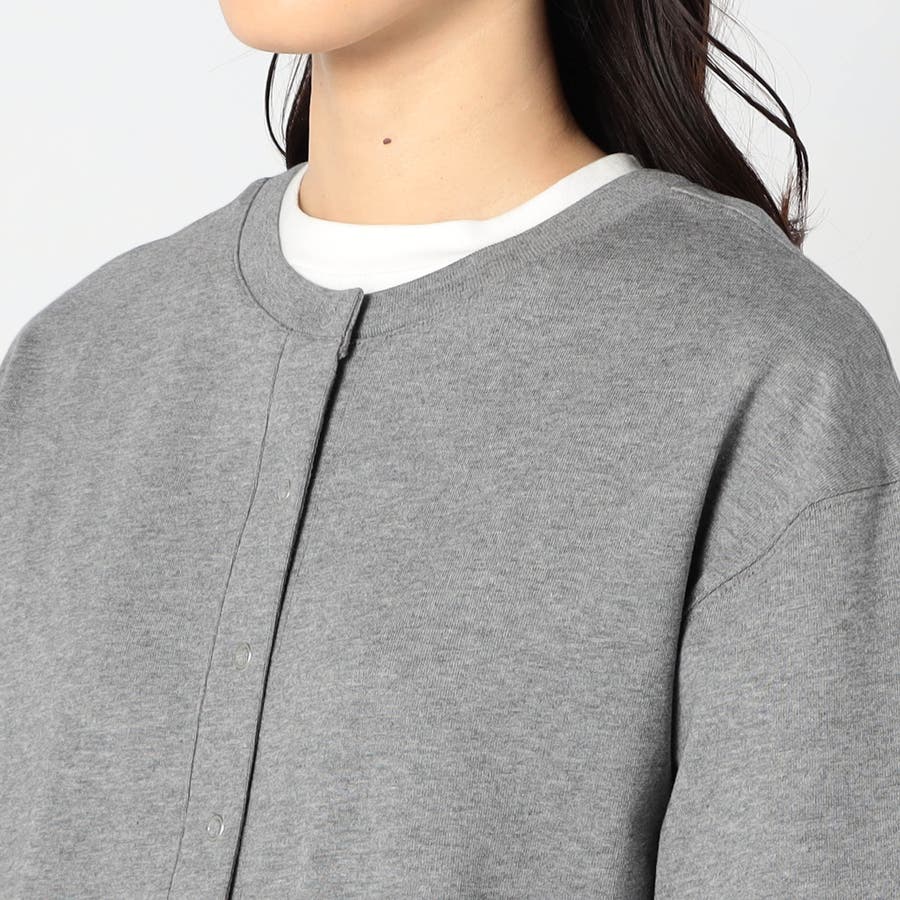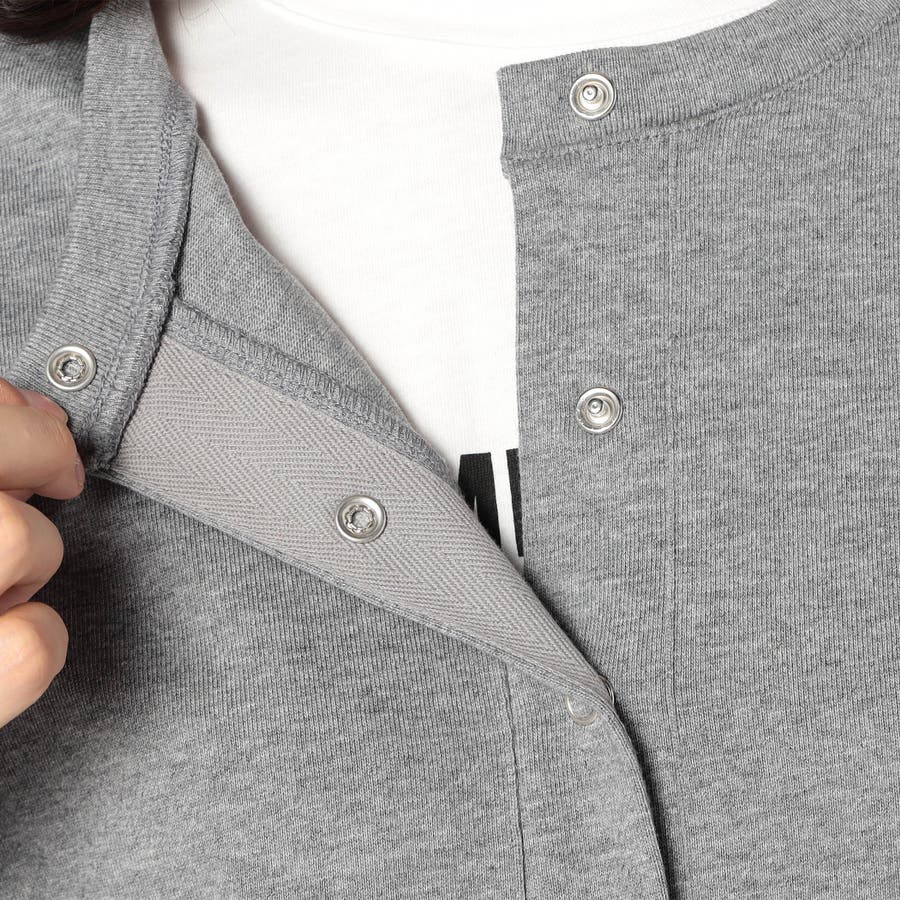 カーディガンでの着用、スナップを後ろにしてプルオーバーでの着用が可能でコーディネートに合わせて着こなしに変化を出せます。