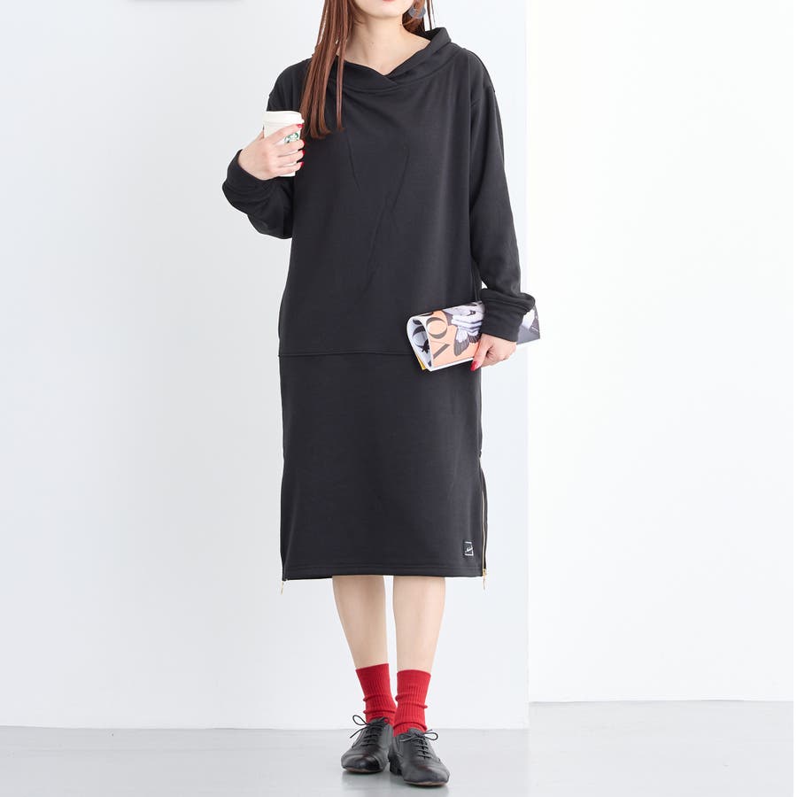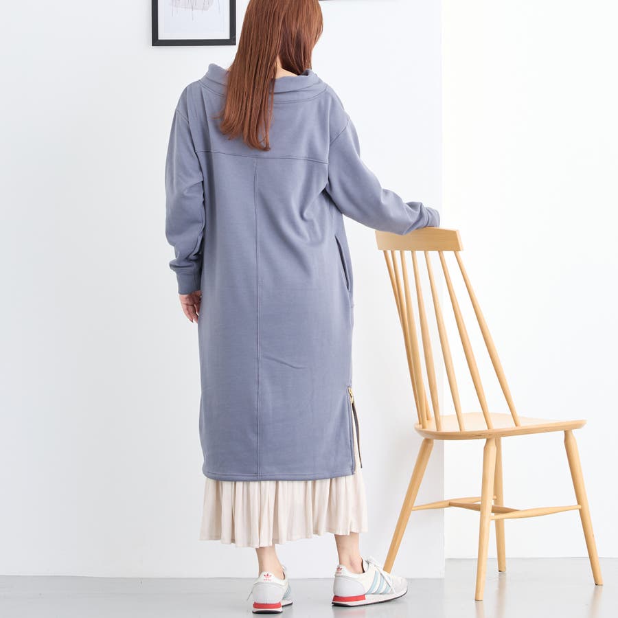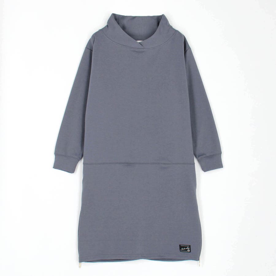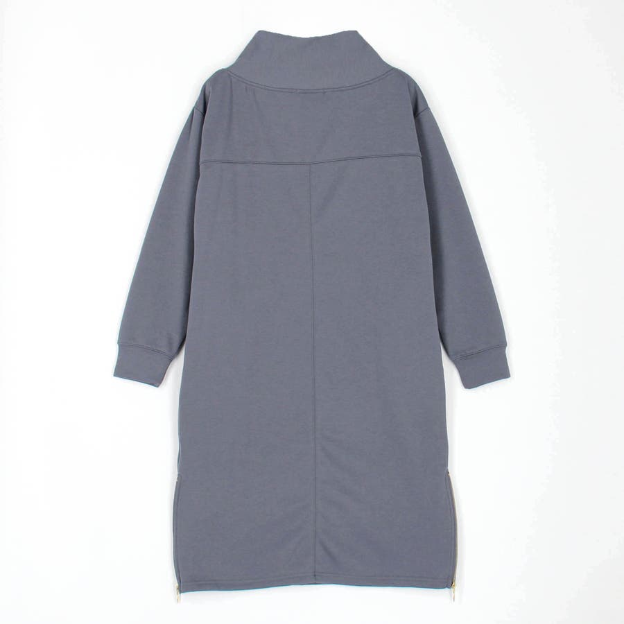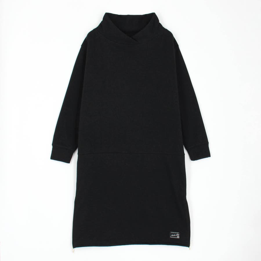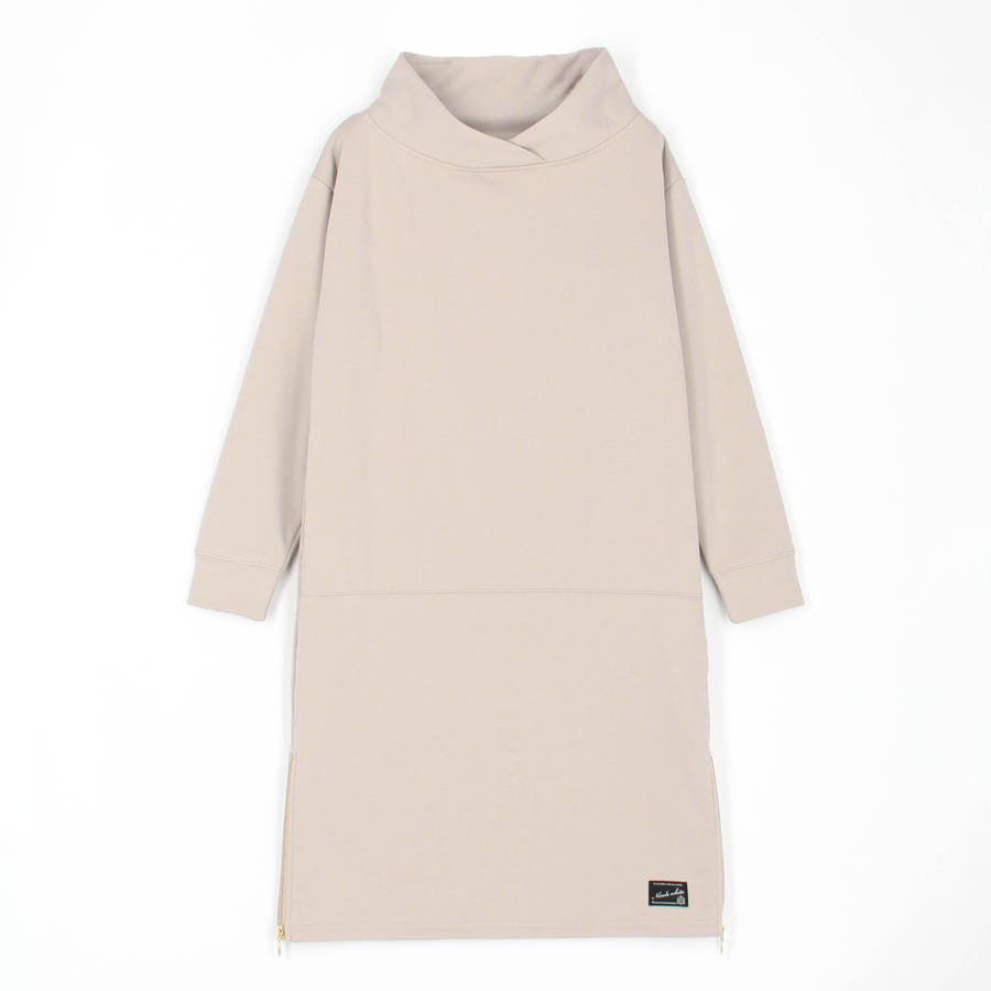 フードライクなスタンド衿が特徴のワンピース。