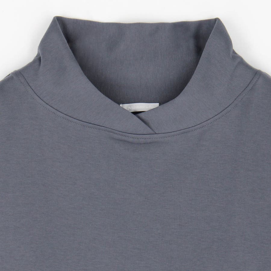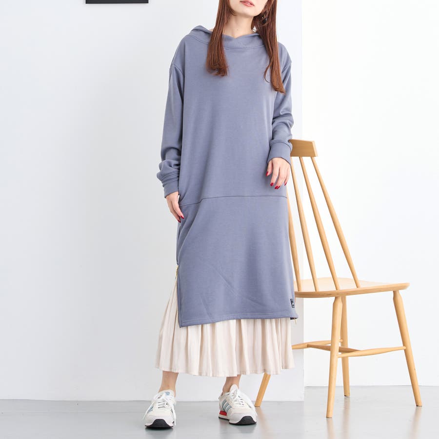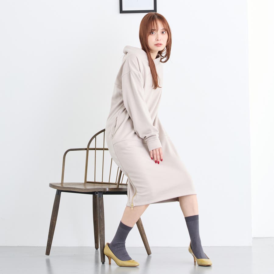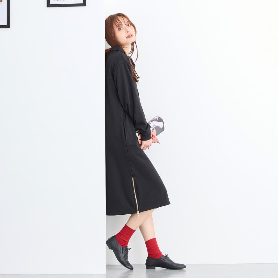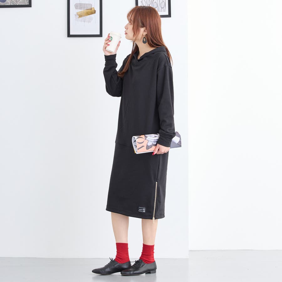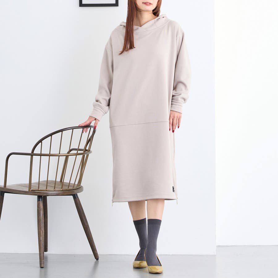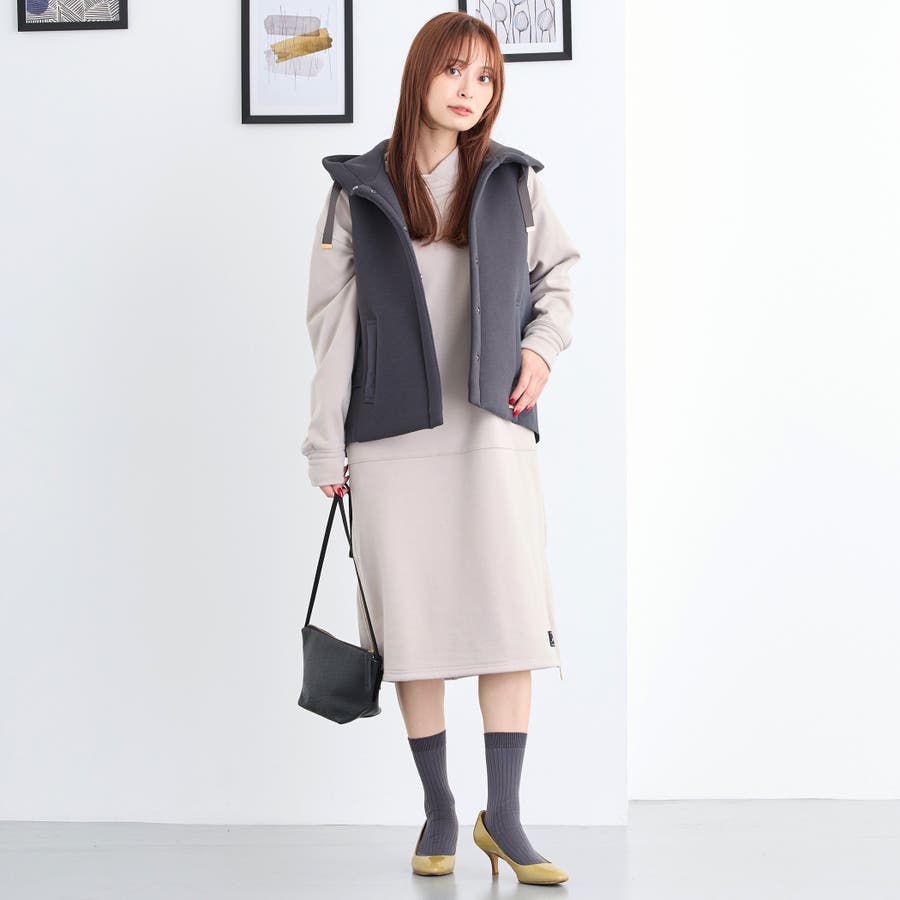 フードライクなスタンド衿が特徴のワンピース。