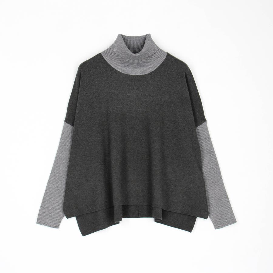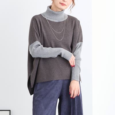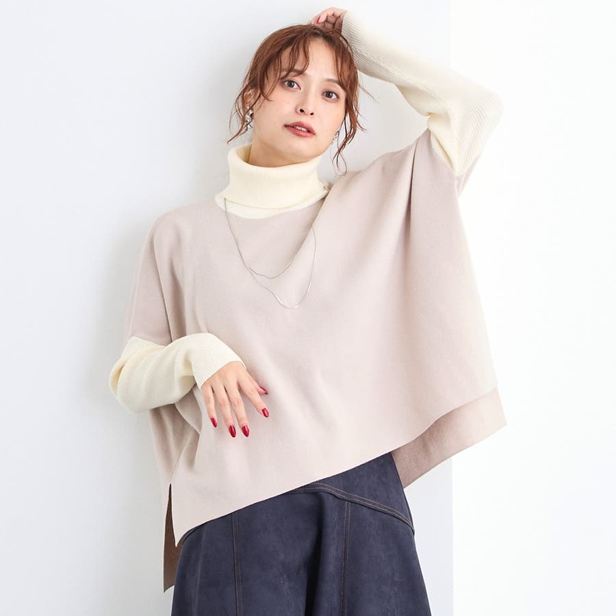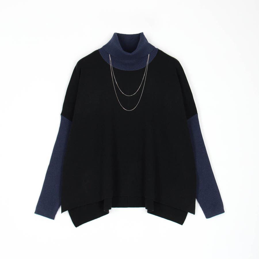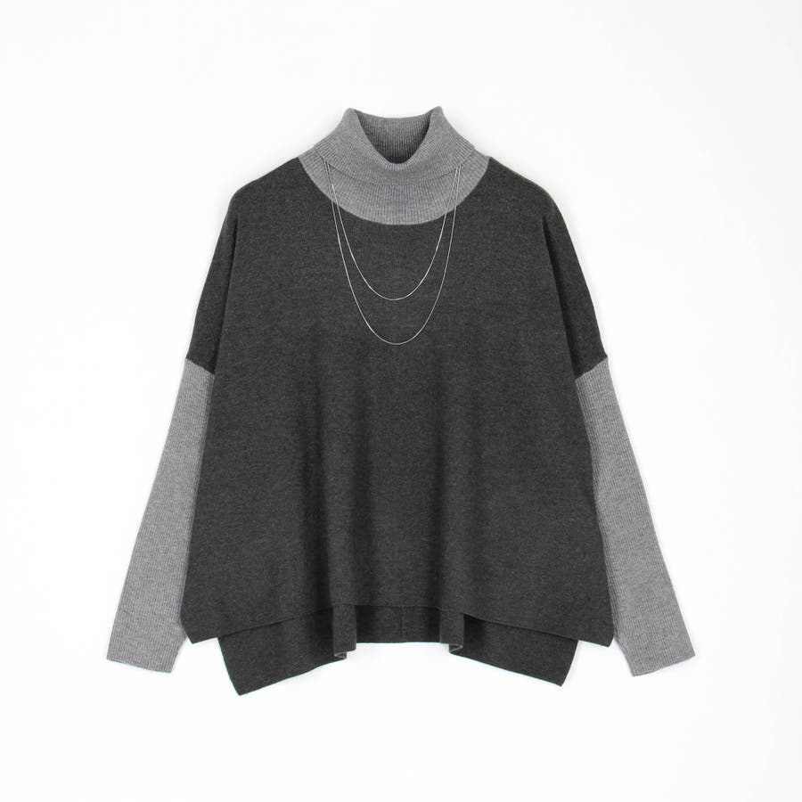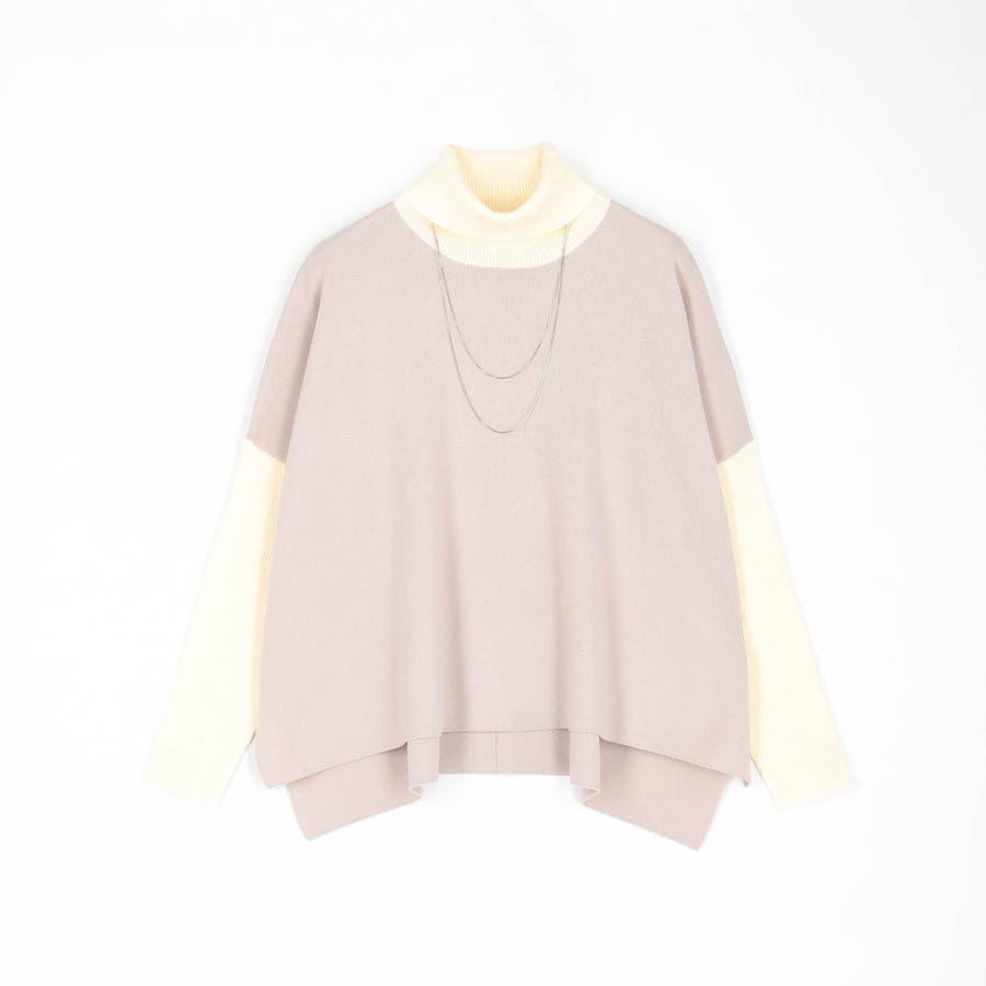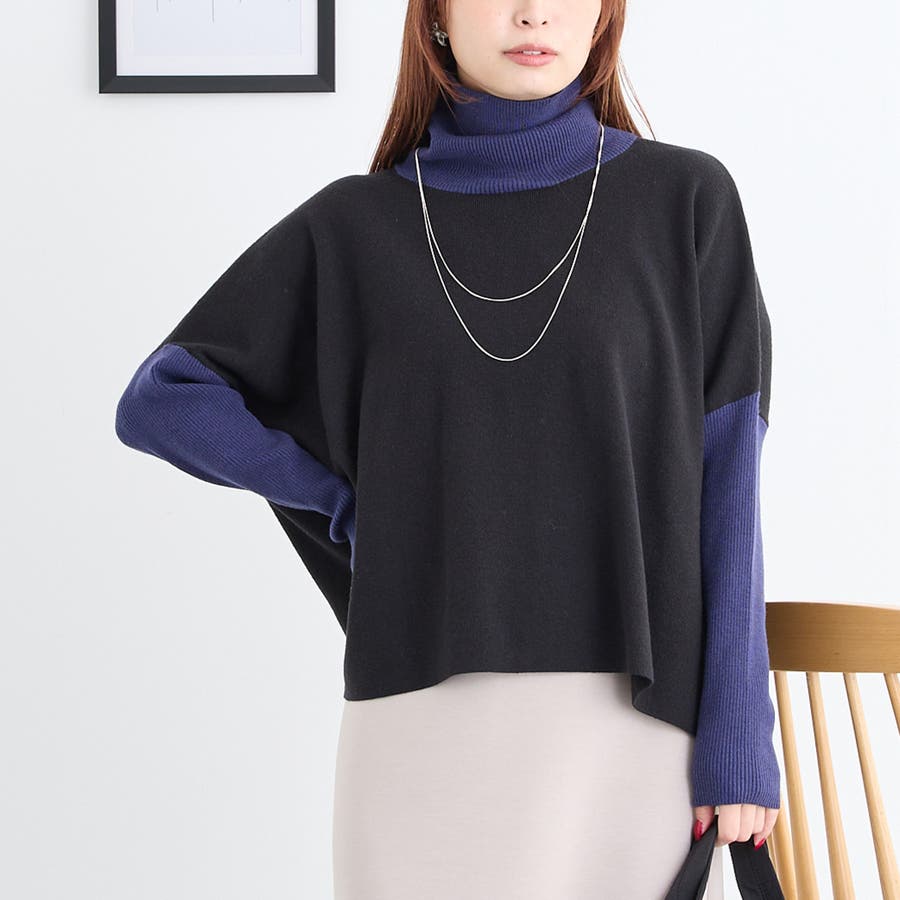 ドルマン調のゆったりした袖周りと、バイカラーの配色がかわいい大人ハイネックニットです。
