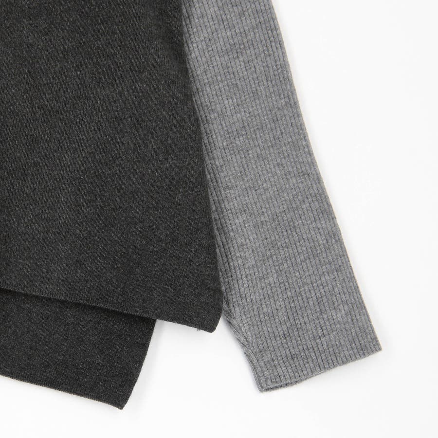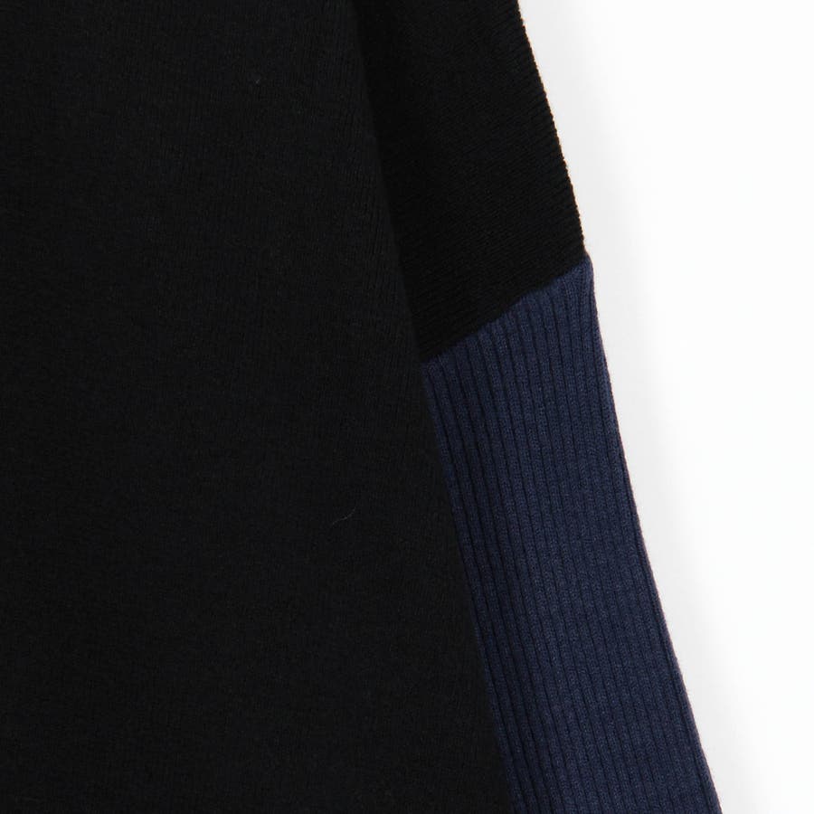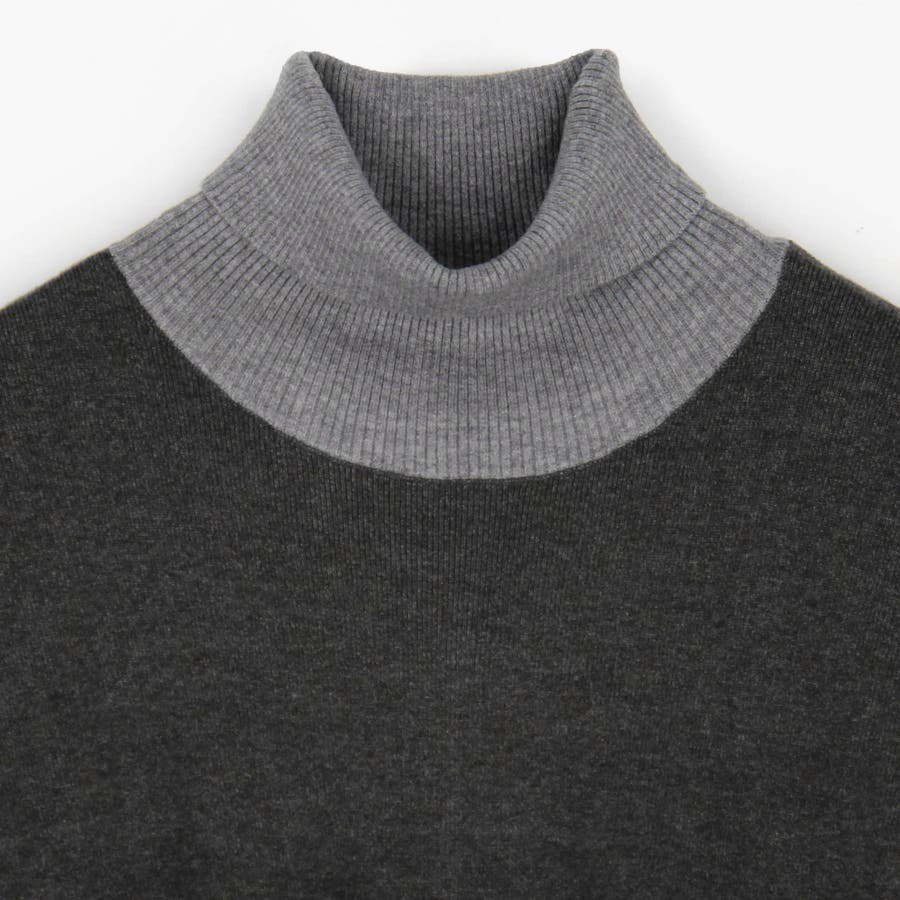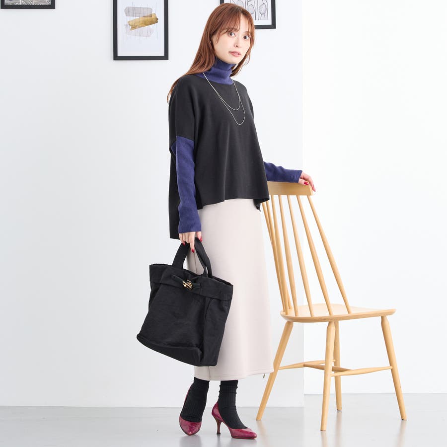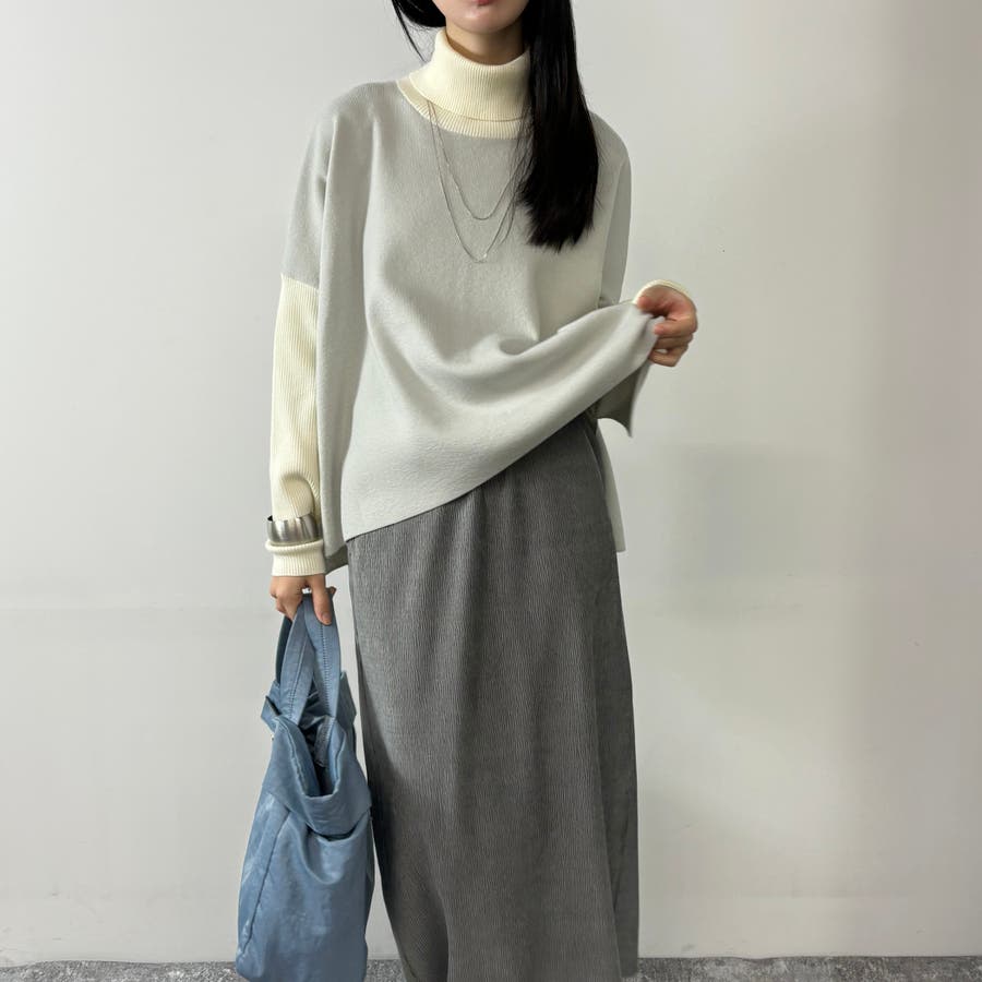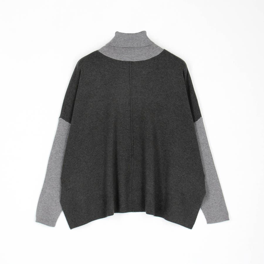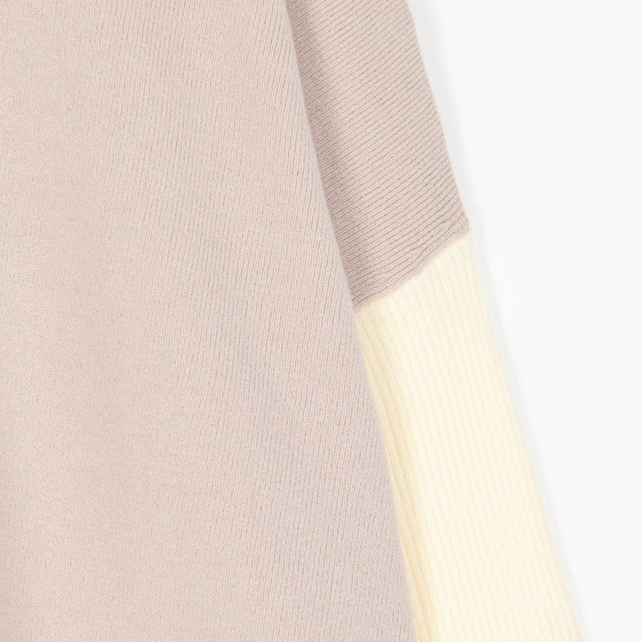 ドルマン調のゆったりした袖周りと、バイカラーの配色がかわいい大人ハイネックニットです。