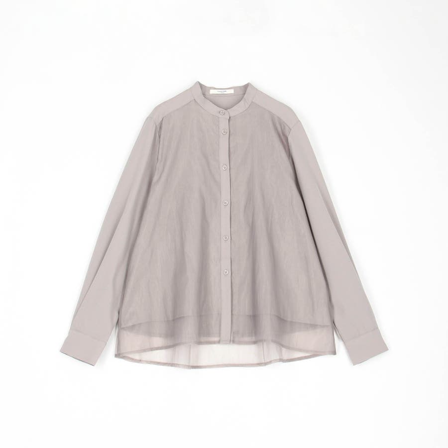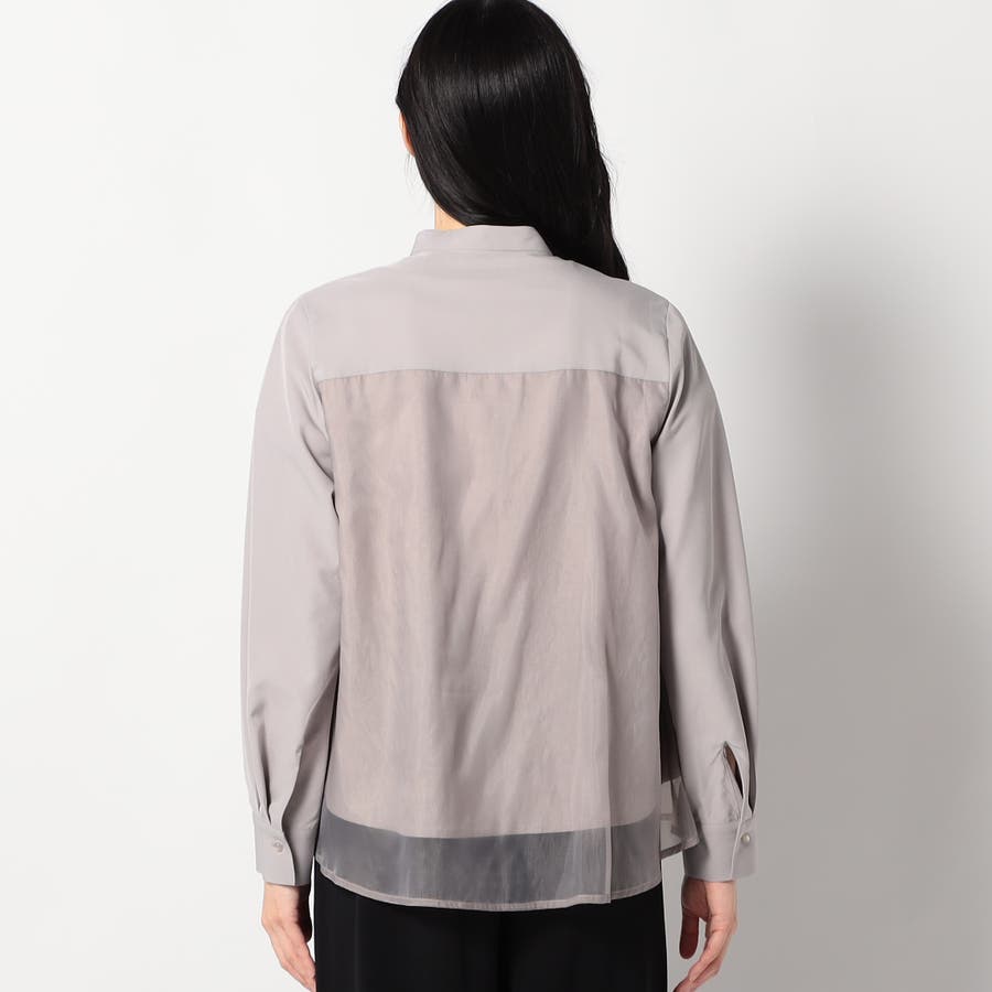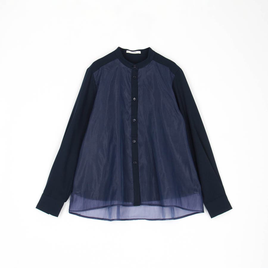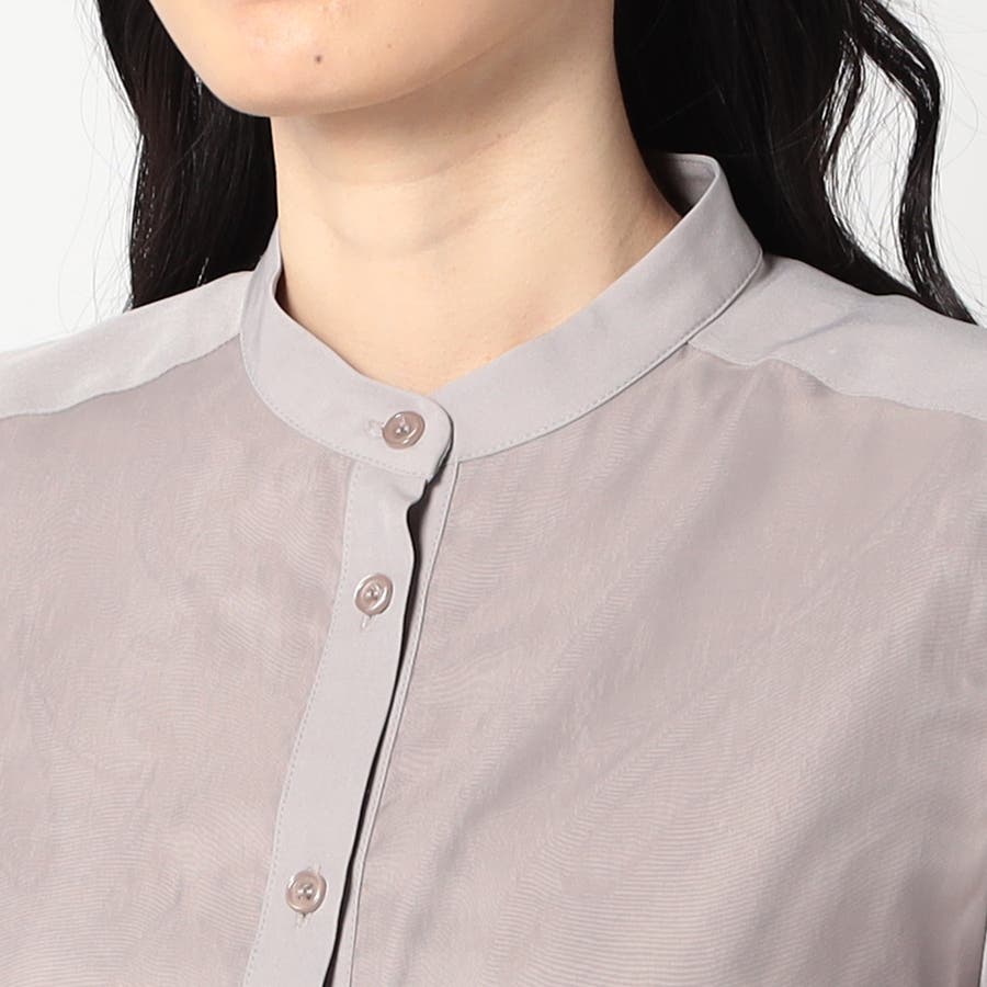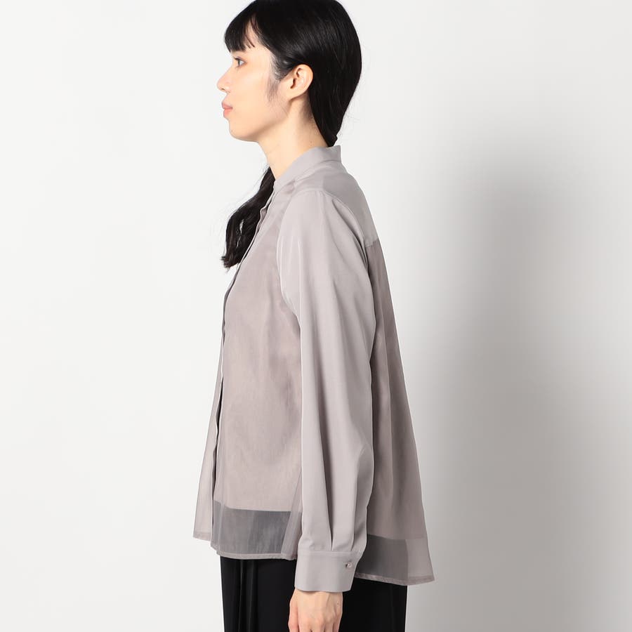 ボディ部分にシア素材がドッキングされており、レイヤードして着ているような雰囲気が出る、ノーカラーブラウスです。