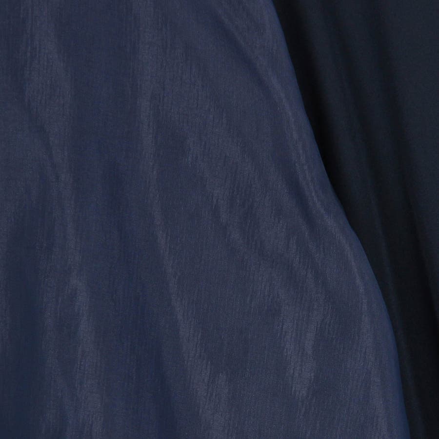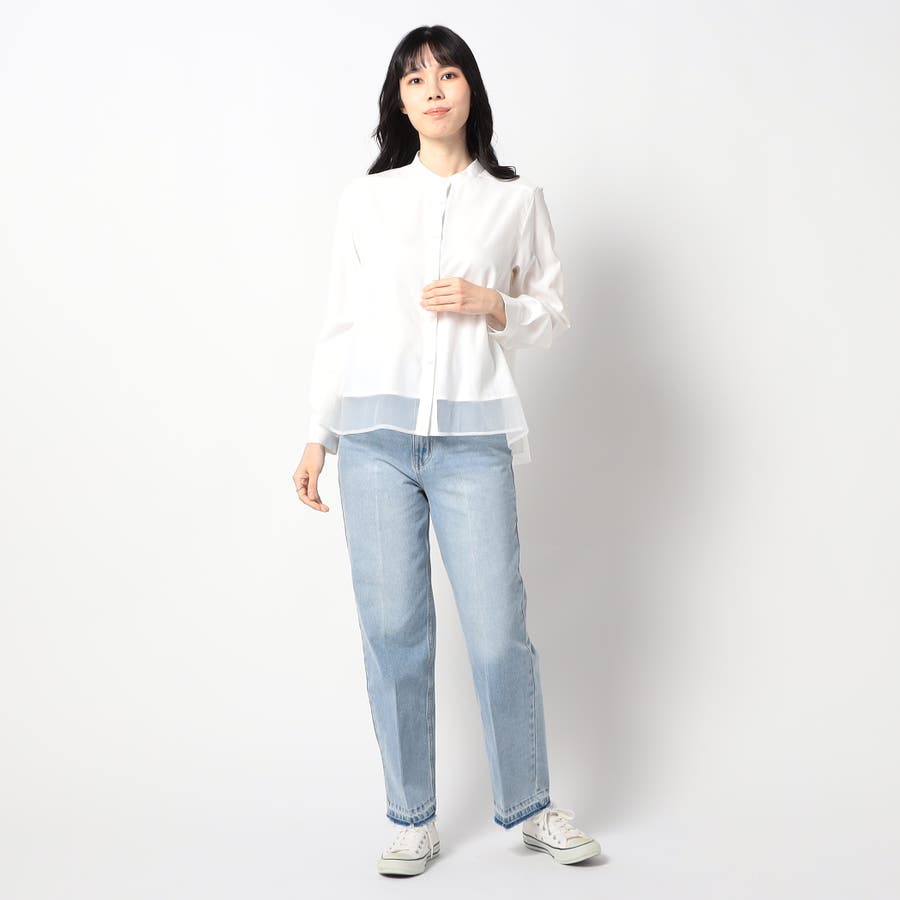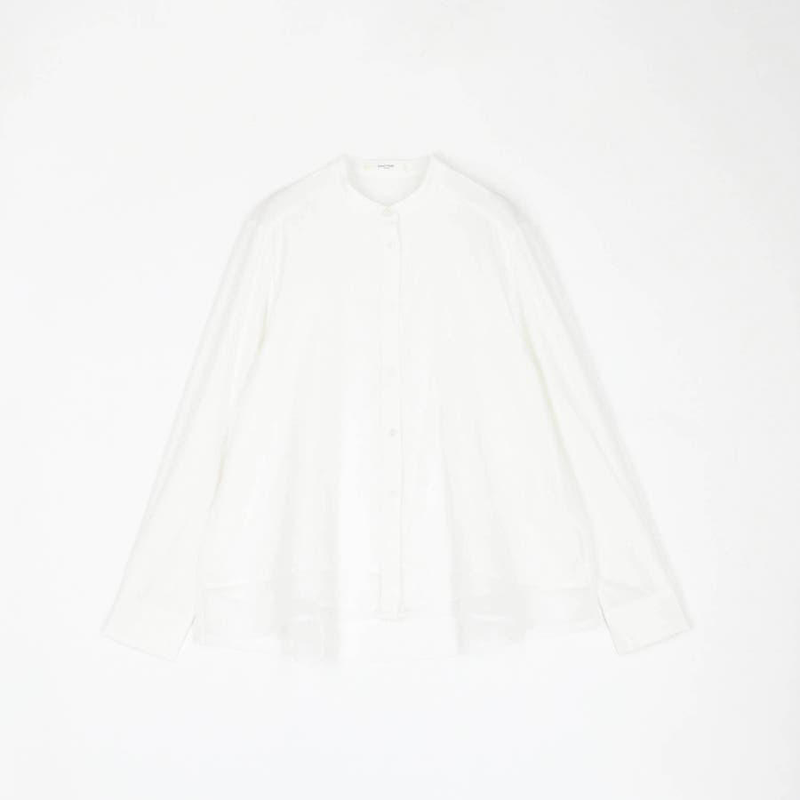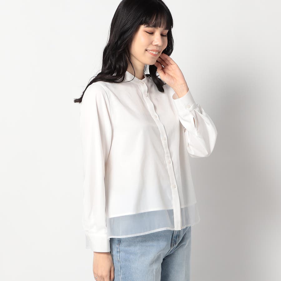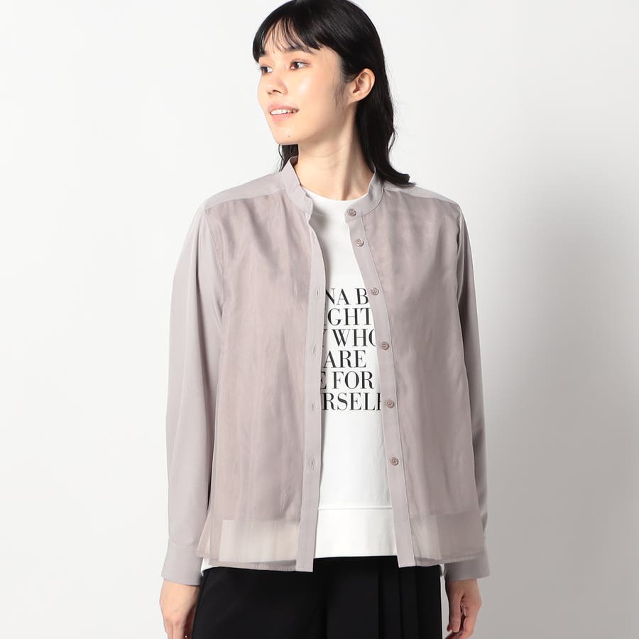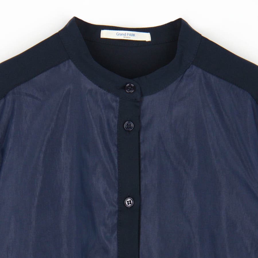 ボディ部分にシア素材がドッキングされており、レイヤードして着ているような雰囲気が出る、ノーカラーブラウスです。