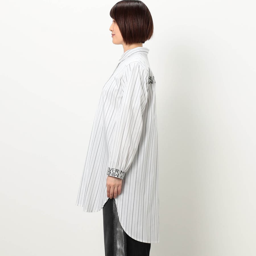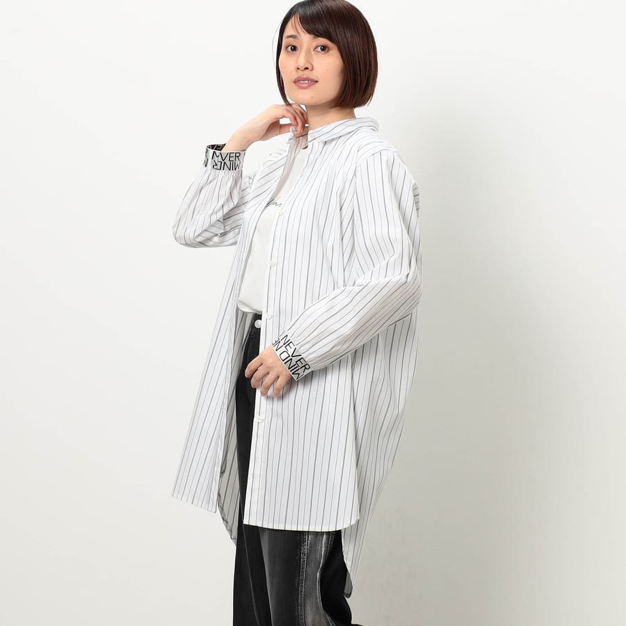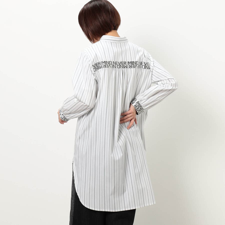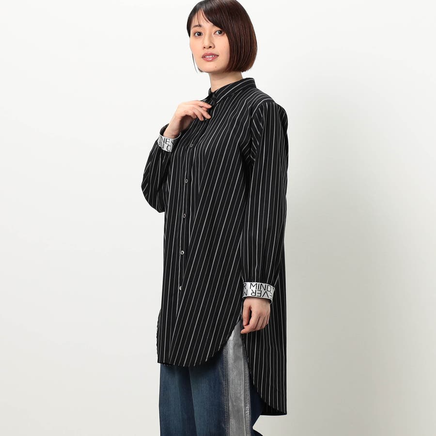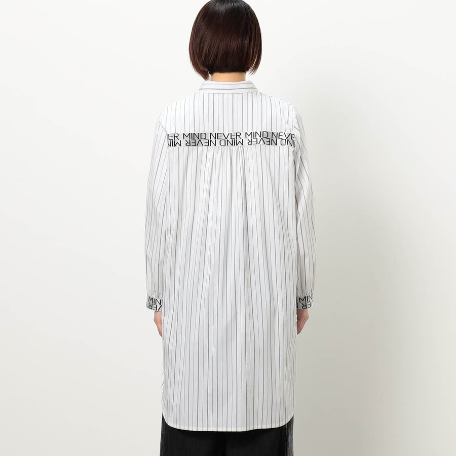ストライプ柄にカフスとバックにロゴテープ施したロングシャツになります。ロゴテープがアクセントになっており、着丈を長めに設定しヒップが隠れるデザインです。