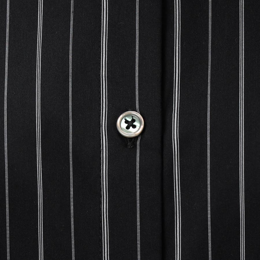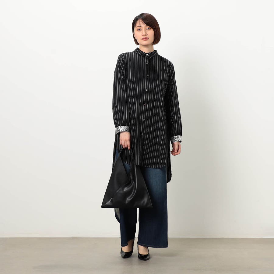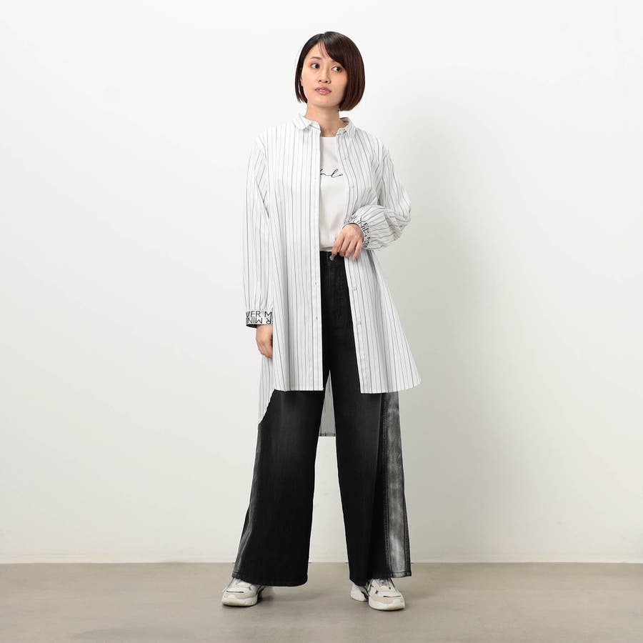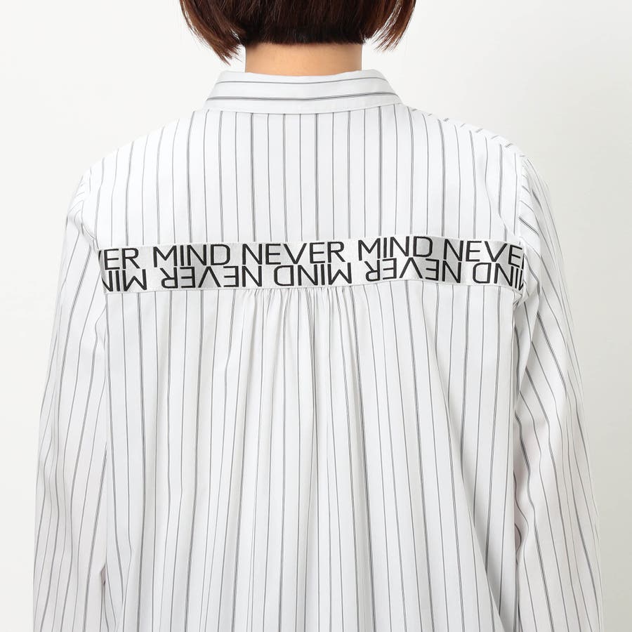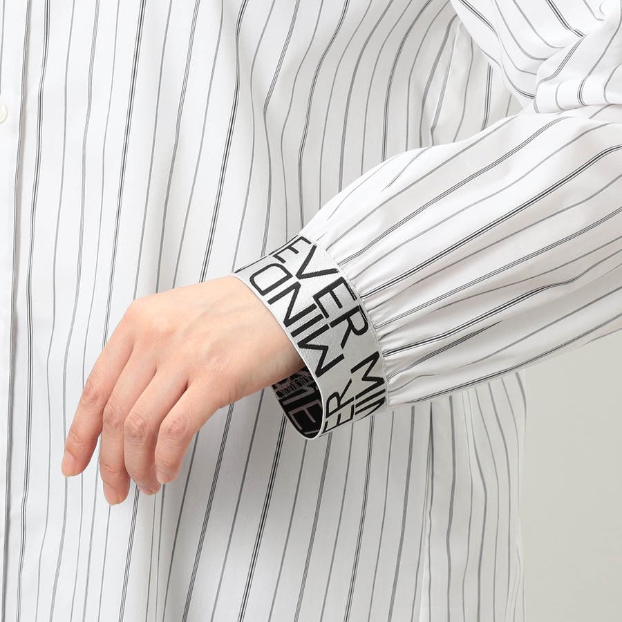 ストライプ柄にカフスとバックにロゴテープ施したロングシャツになります。ロゴテープがアクセントになっており、着丈を長めに設定しヒップが隠れるデザインです。