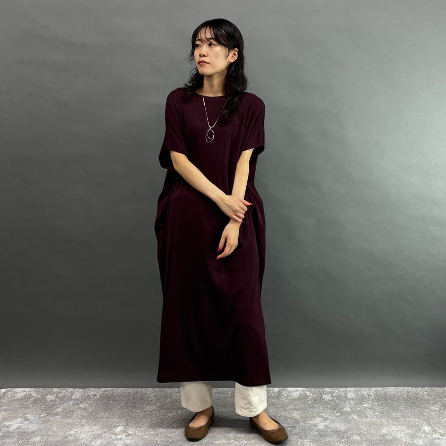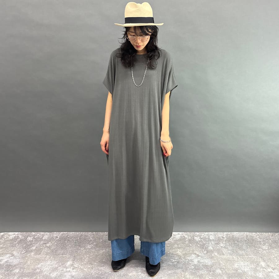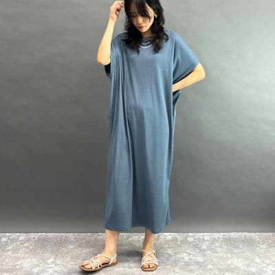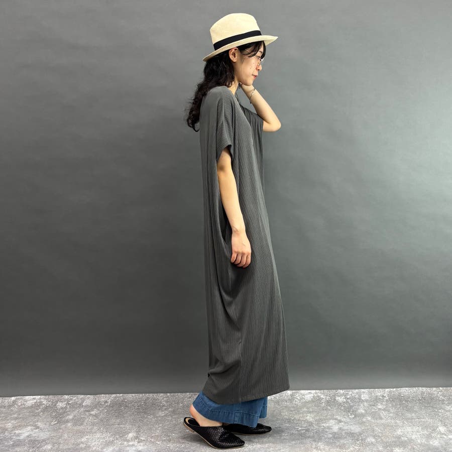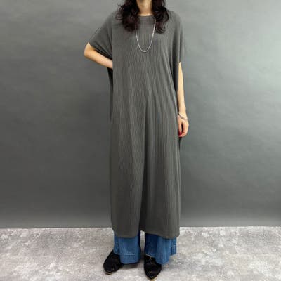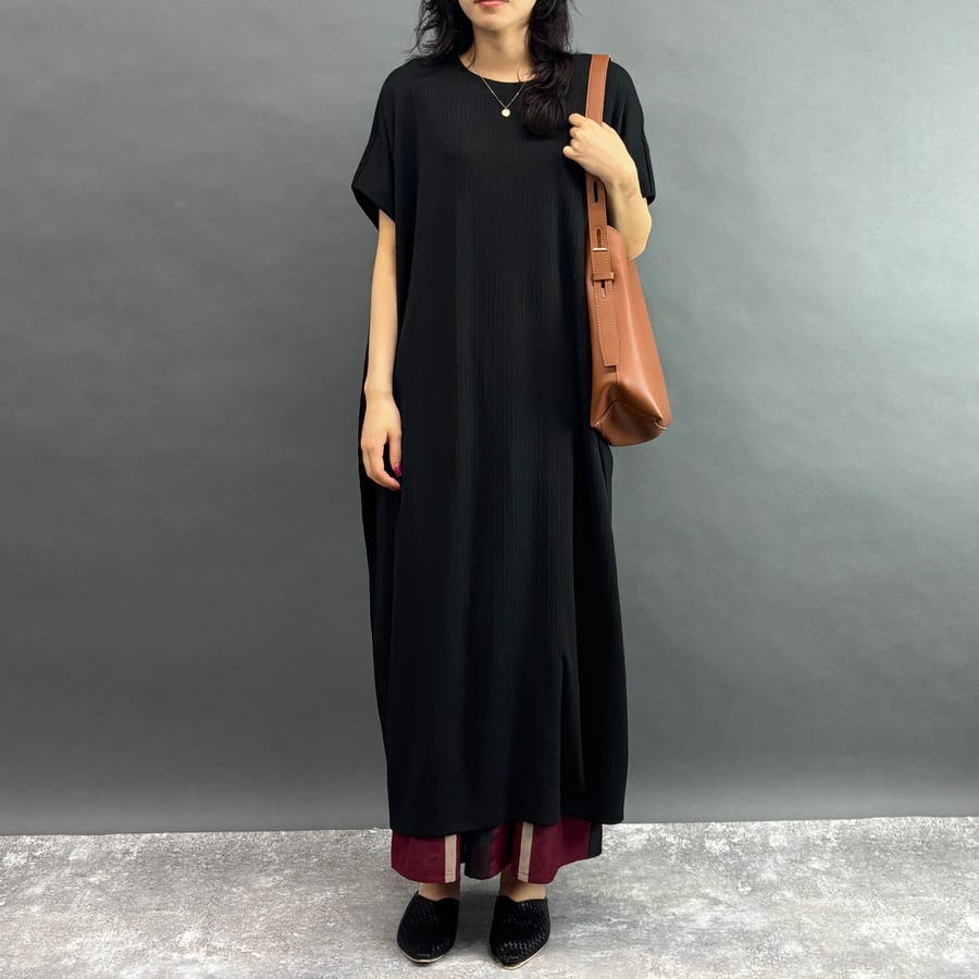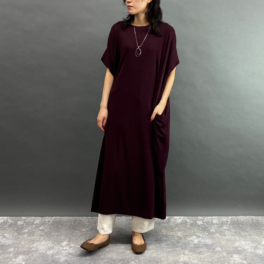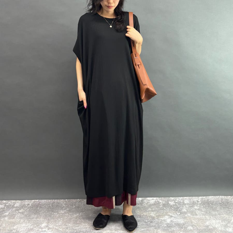 ゆったりとしたデザインのロングワンピースは、体のシルエットをひろいにくく、シンプルなデザインながらも着映えする一枚です。
