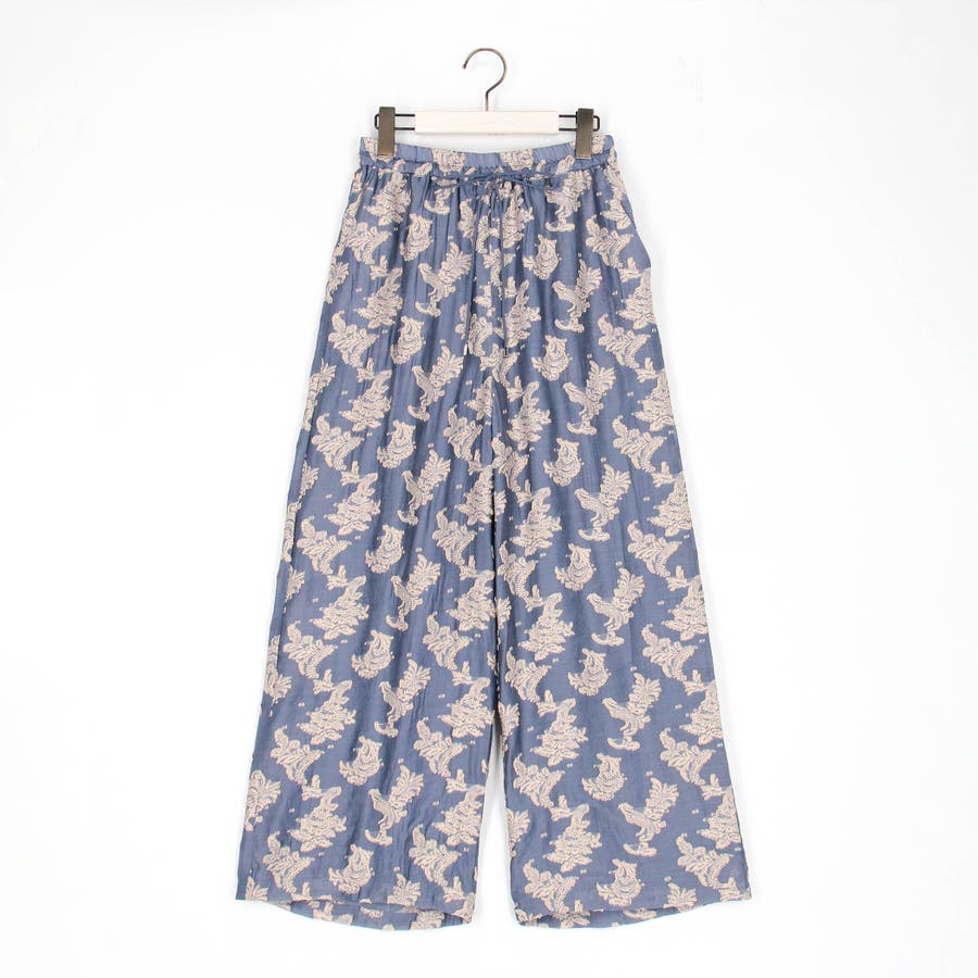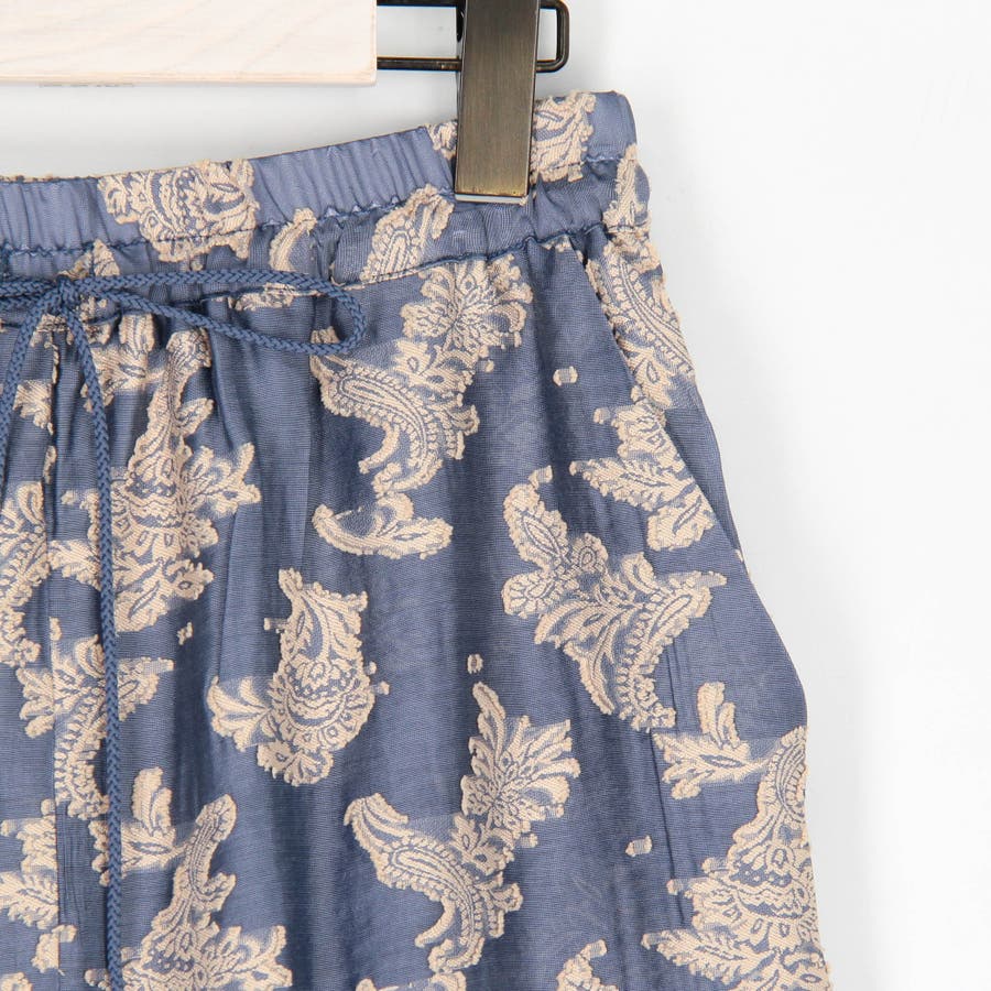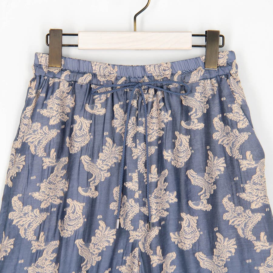 生地全体にペイズリー柄がジャガード織りされた、見た目に華やかな雰囲気のパンツです。