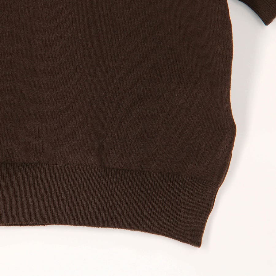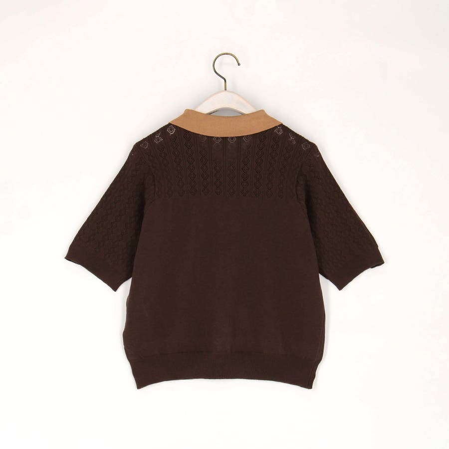見頃上部が切り替え透かし編みになっておりトレンドのポロニットを透けのある編地でシーズンライクにデザイン。