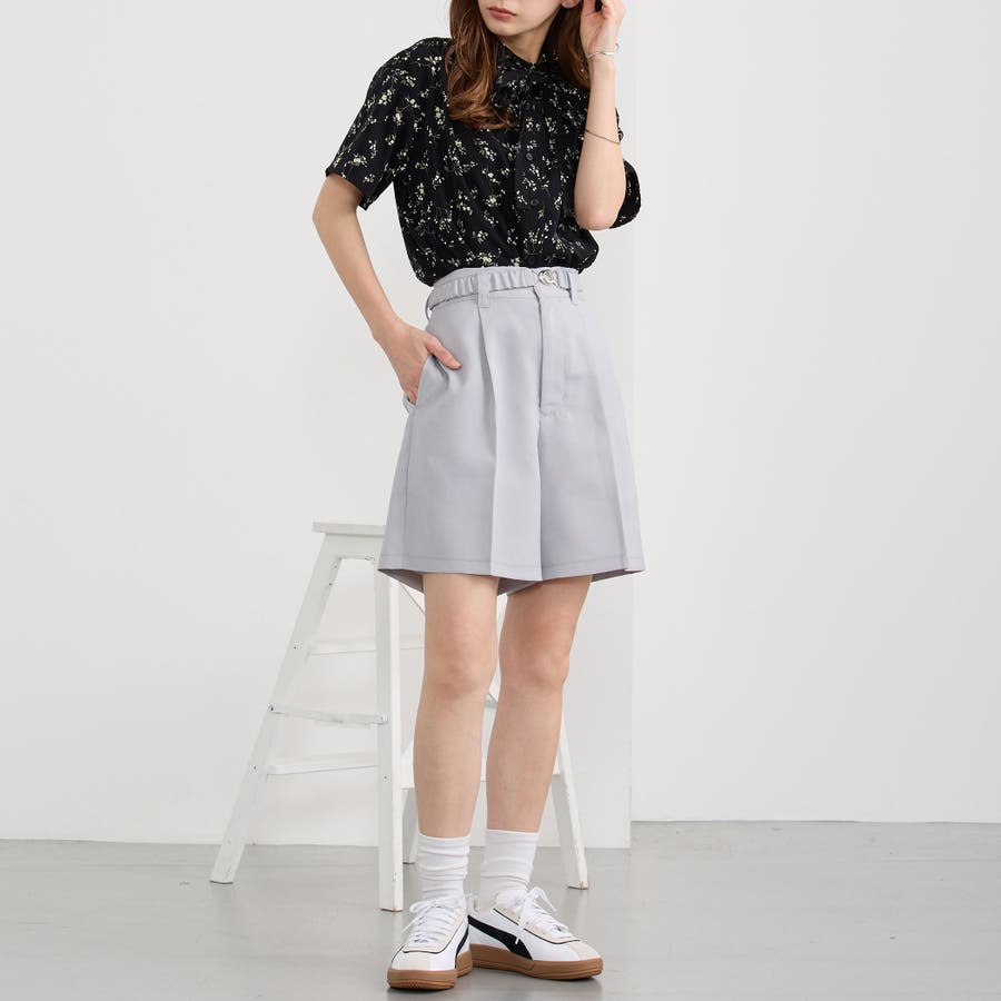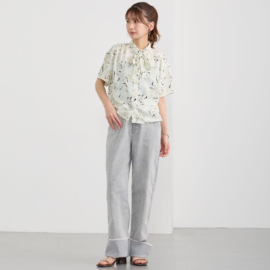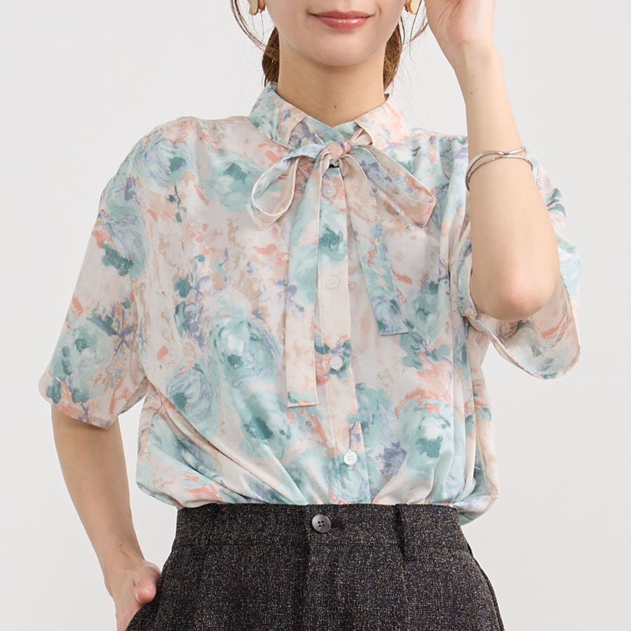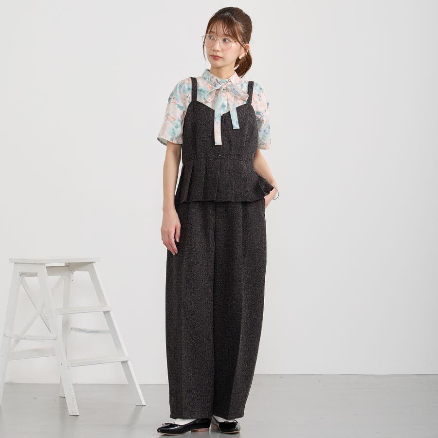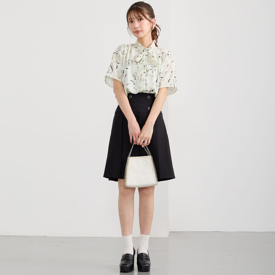 太めのリボンタイがガーリーさを出しつつも、スタンドカラーでより大人な印象に。