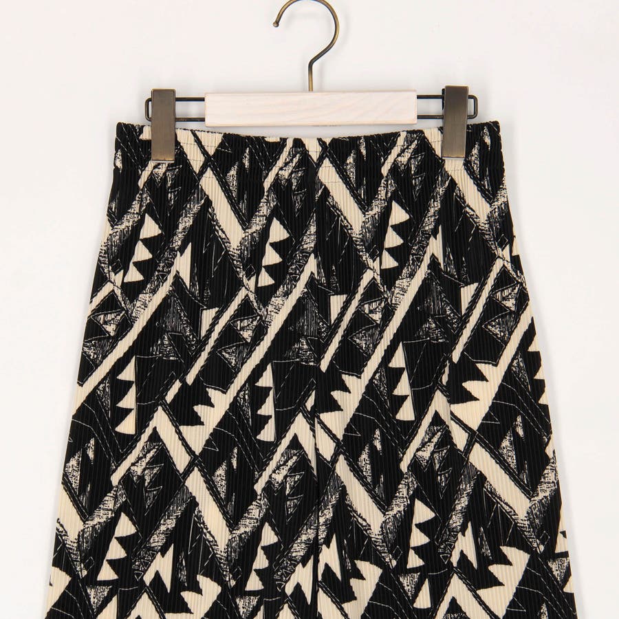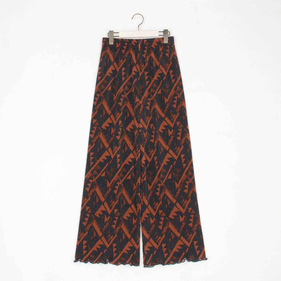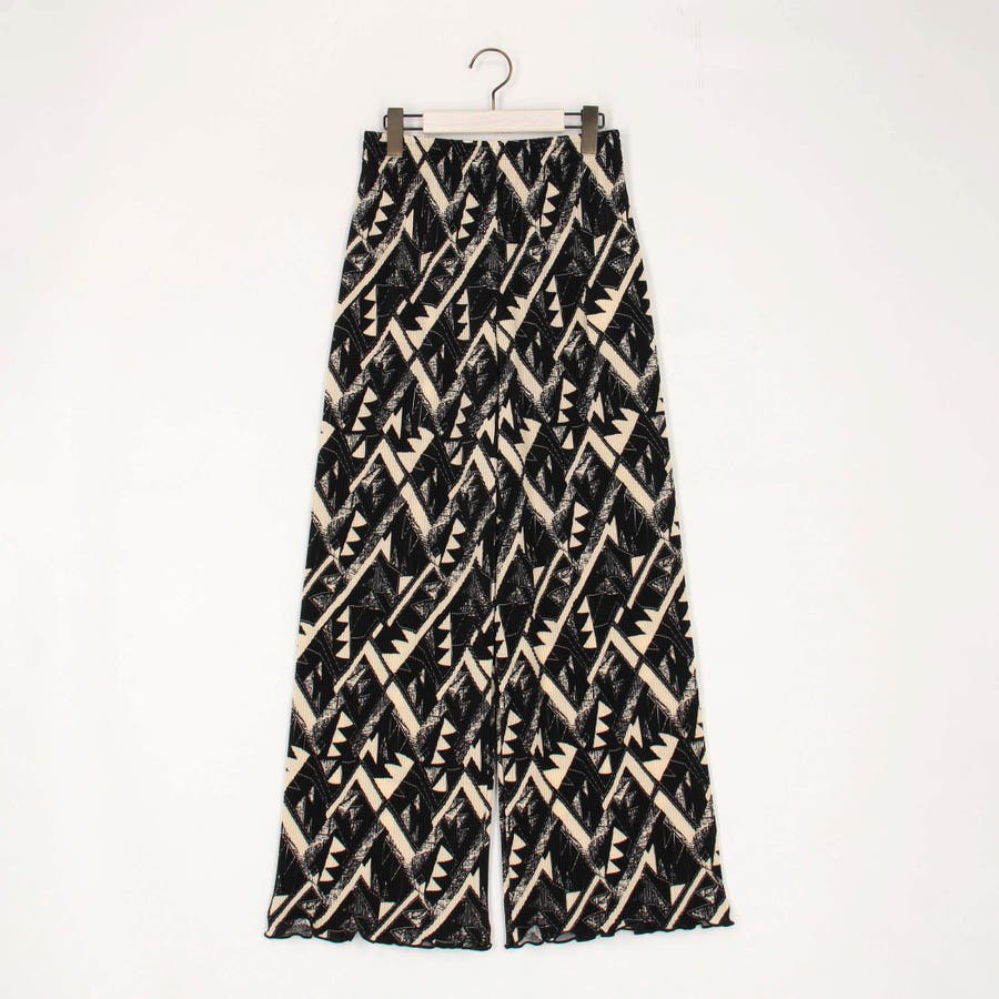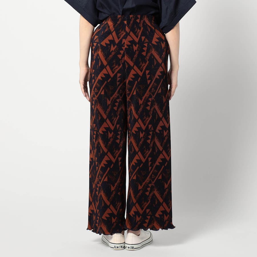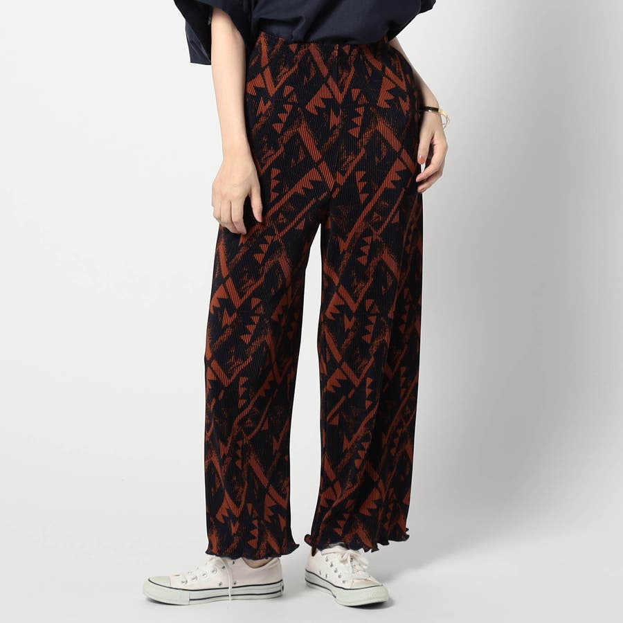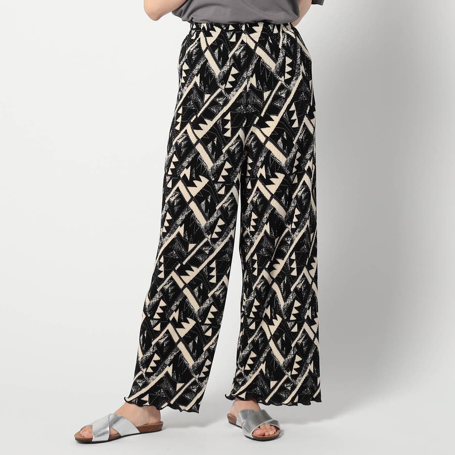 さらっとしたスムース素材にプリーツ加工を施し、体へのはりつきを軽減した総柄プリントのプリーツパンツです。