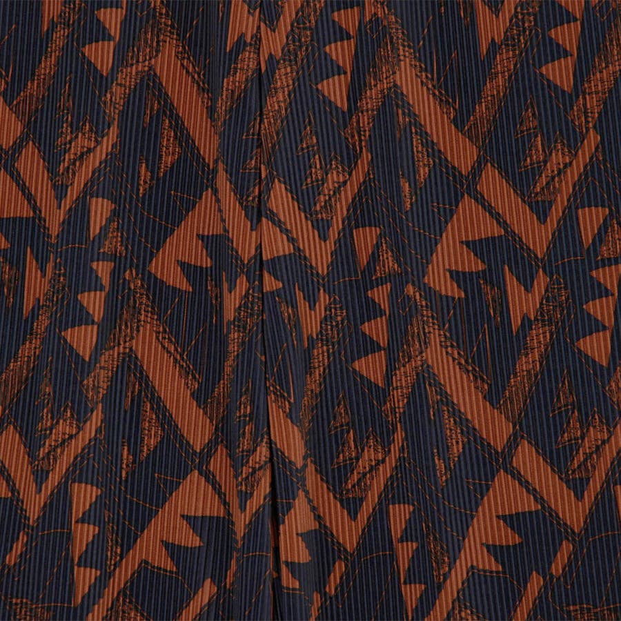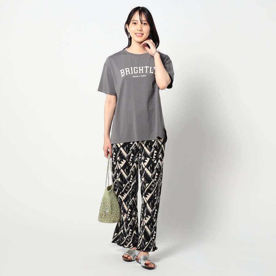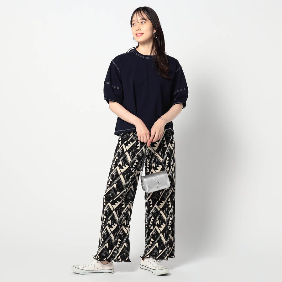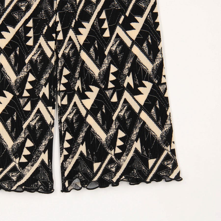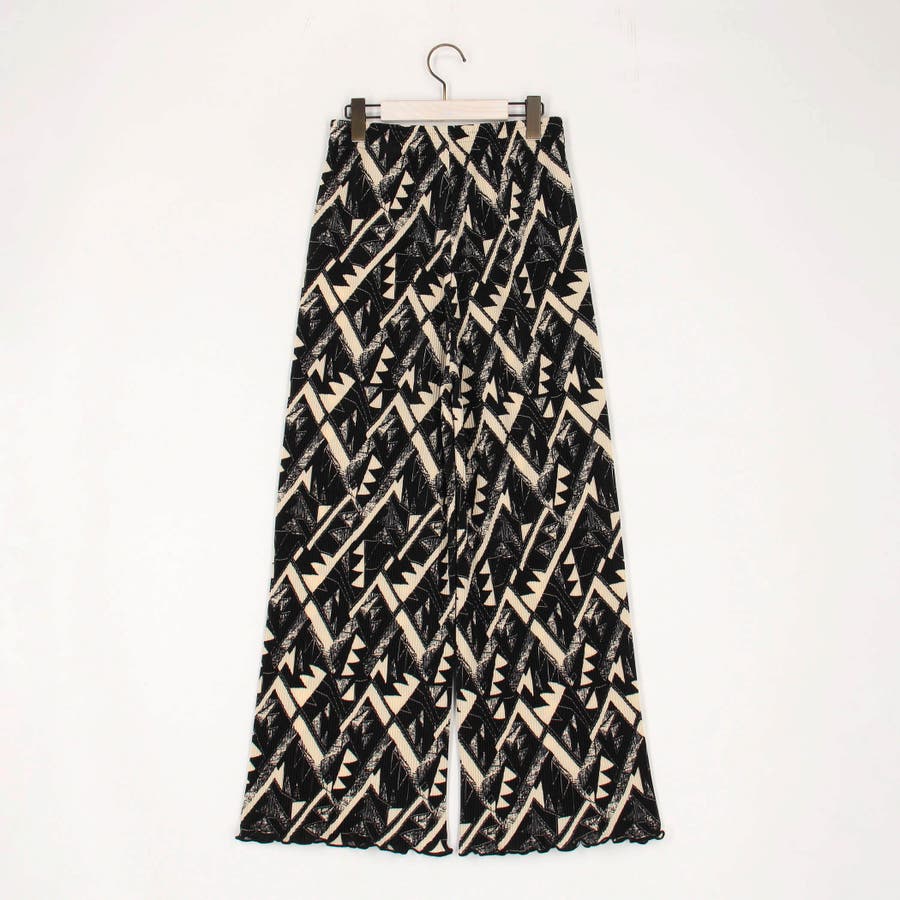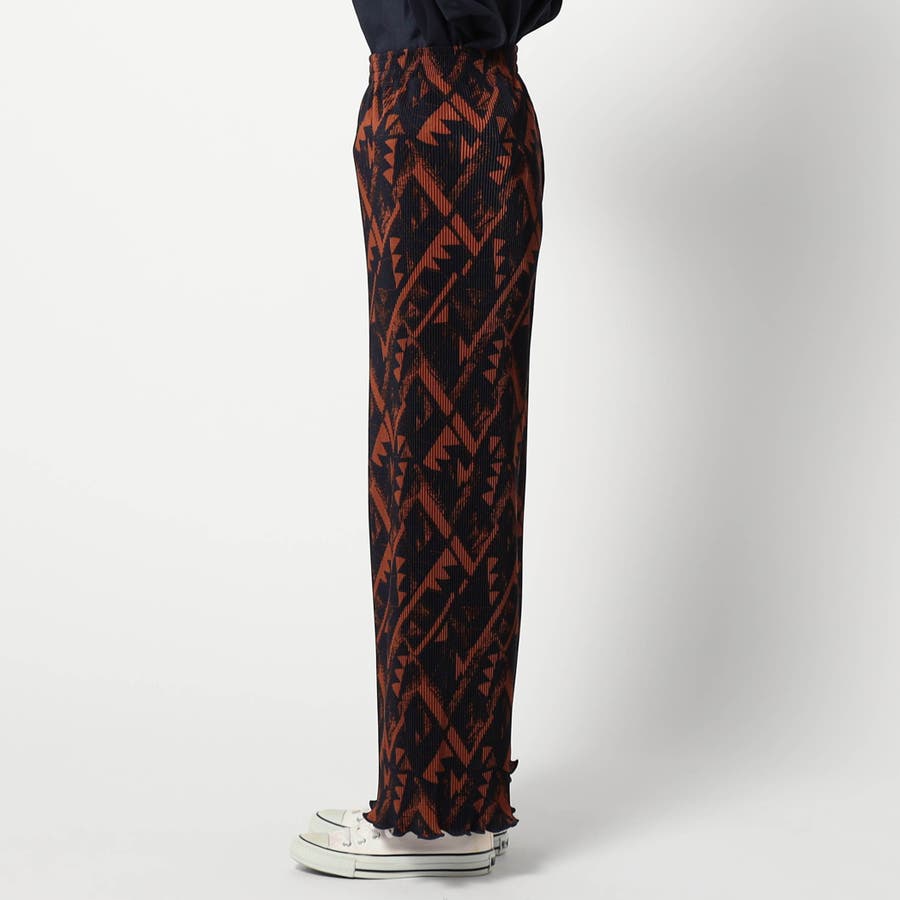 さらっとしたスムース素材にプリーツ加工を施し、体へのはりつきを軽減した総柄プリントのプリーツパンツです。