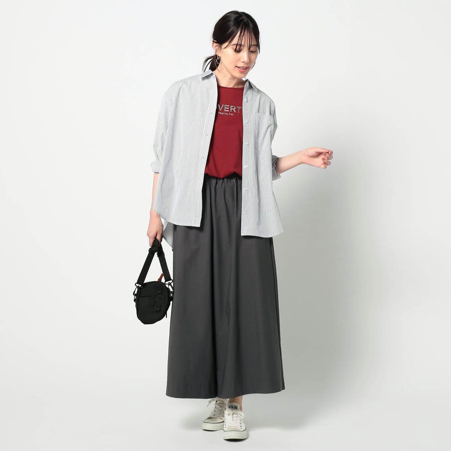 *ツイル生地の表面がきれいな印象もあるので、Tシャツからブラウスまで幅広く合わせて着用できます。
